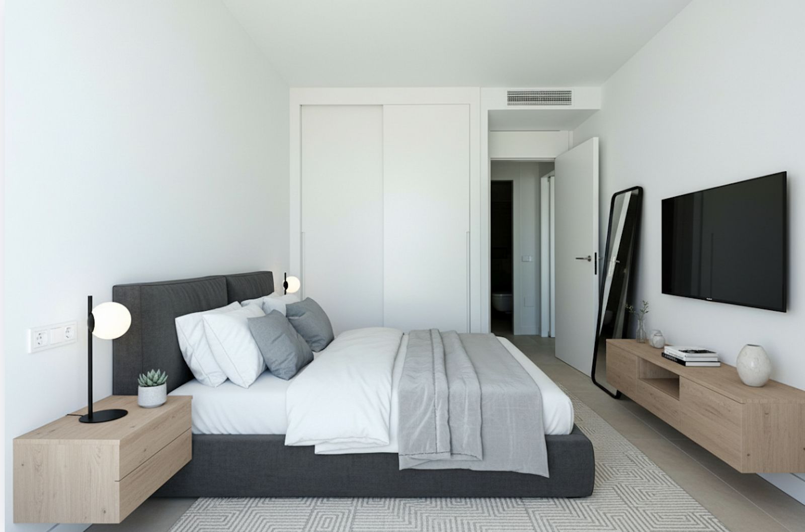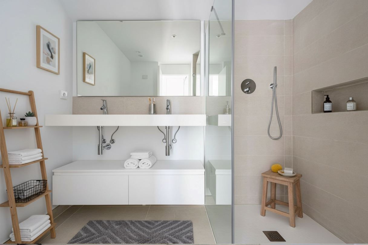 Master Bathroom: Luxury finishes with underfloor heating, double sinks, walk-in shower, and wall-mounted fittings.