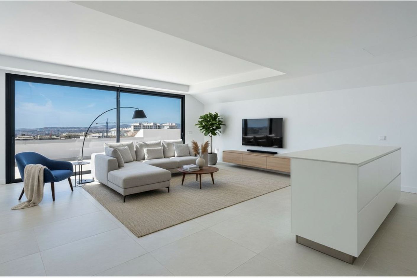 Living Room: Bright and spacious with floor-to-ceiling sliding doors leading out to the terrace and breathtaking coastal views.