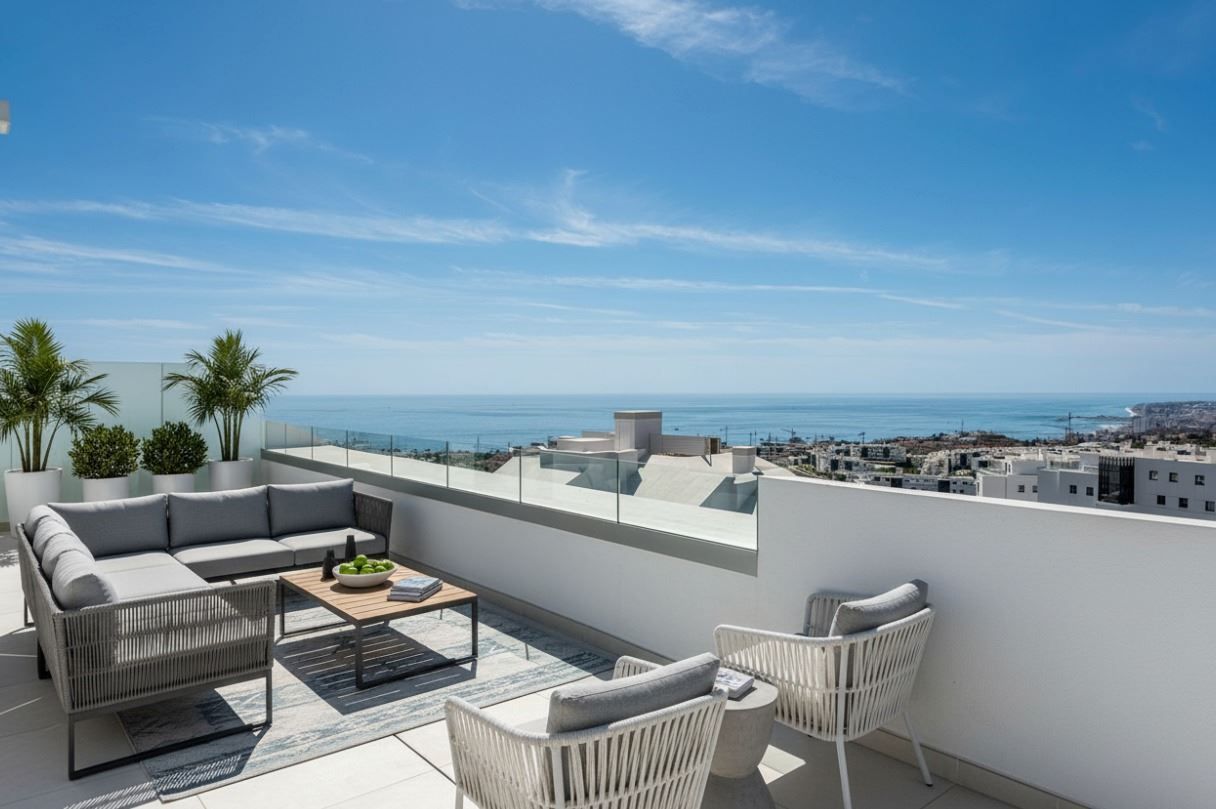 Located in a newly developed complex, this stunning penthouse offers uninterrupted sea views from every room and direct access to a southwest-facing terrace of more than 60 sqm. From here, enjoy sweeping vistas of the coastline, Benalmádena, Fuengirola, the surrounding mountains. Arguably the best view on the Costa del Sol.
