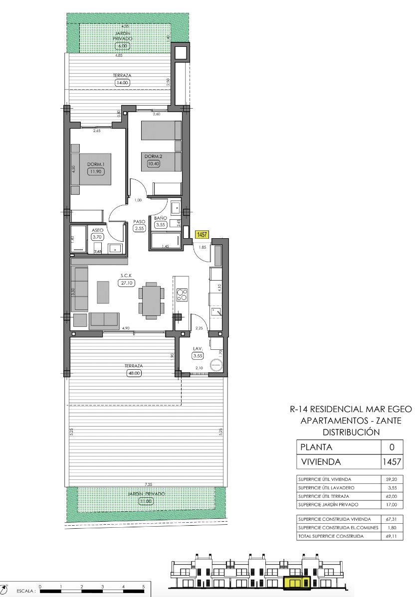 There are apartments on the ground floor or one floor up, the apartments on the ground floor have two large patios, while the apartments one floor up have balconies and private roof terraces with nice views.