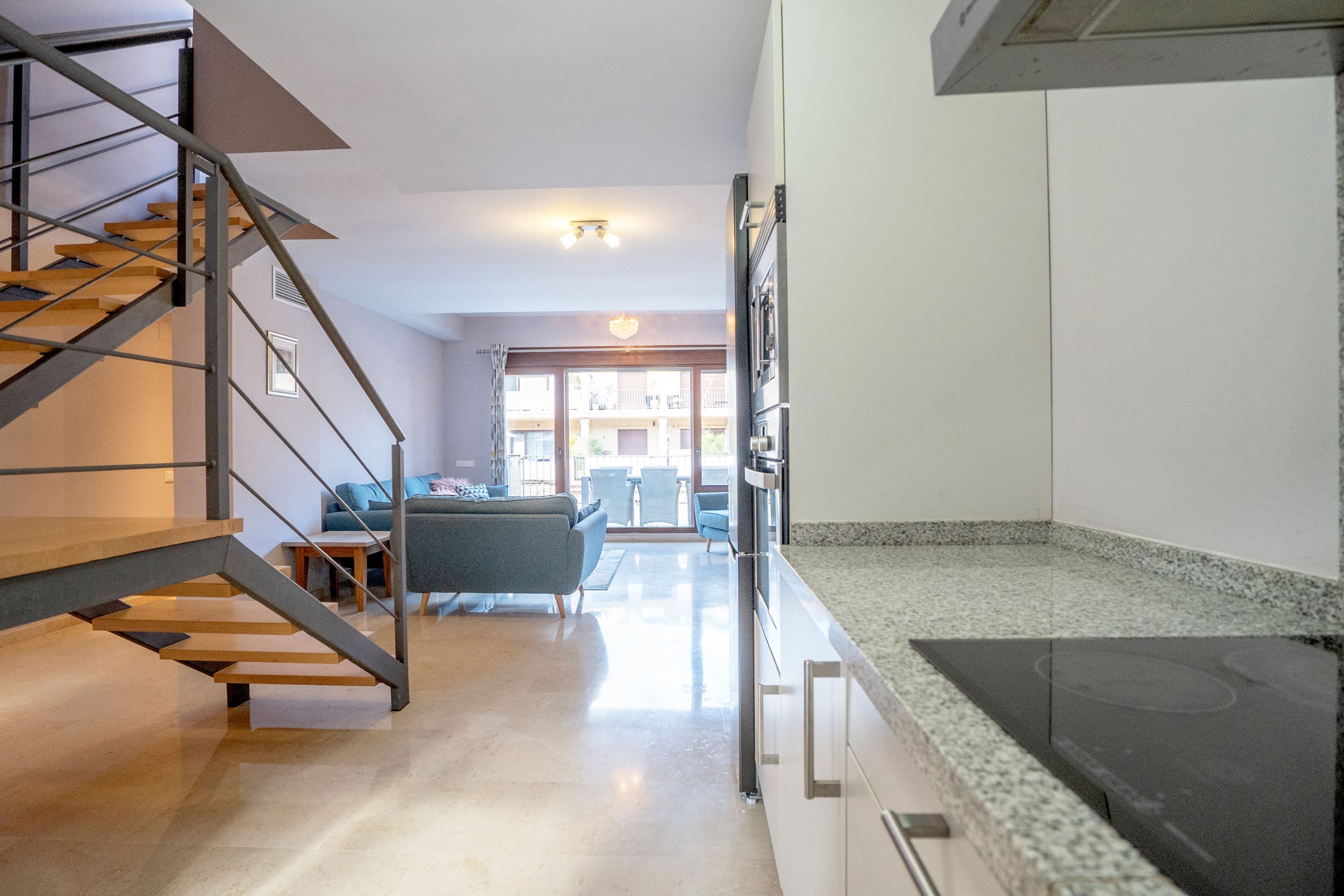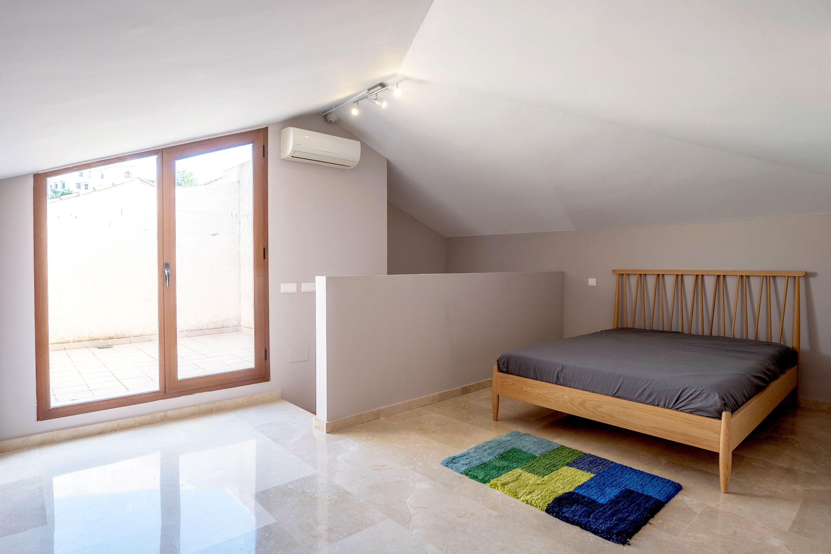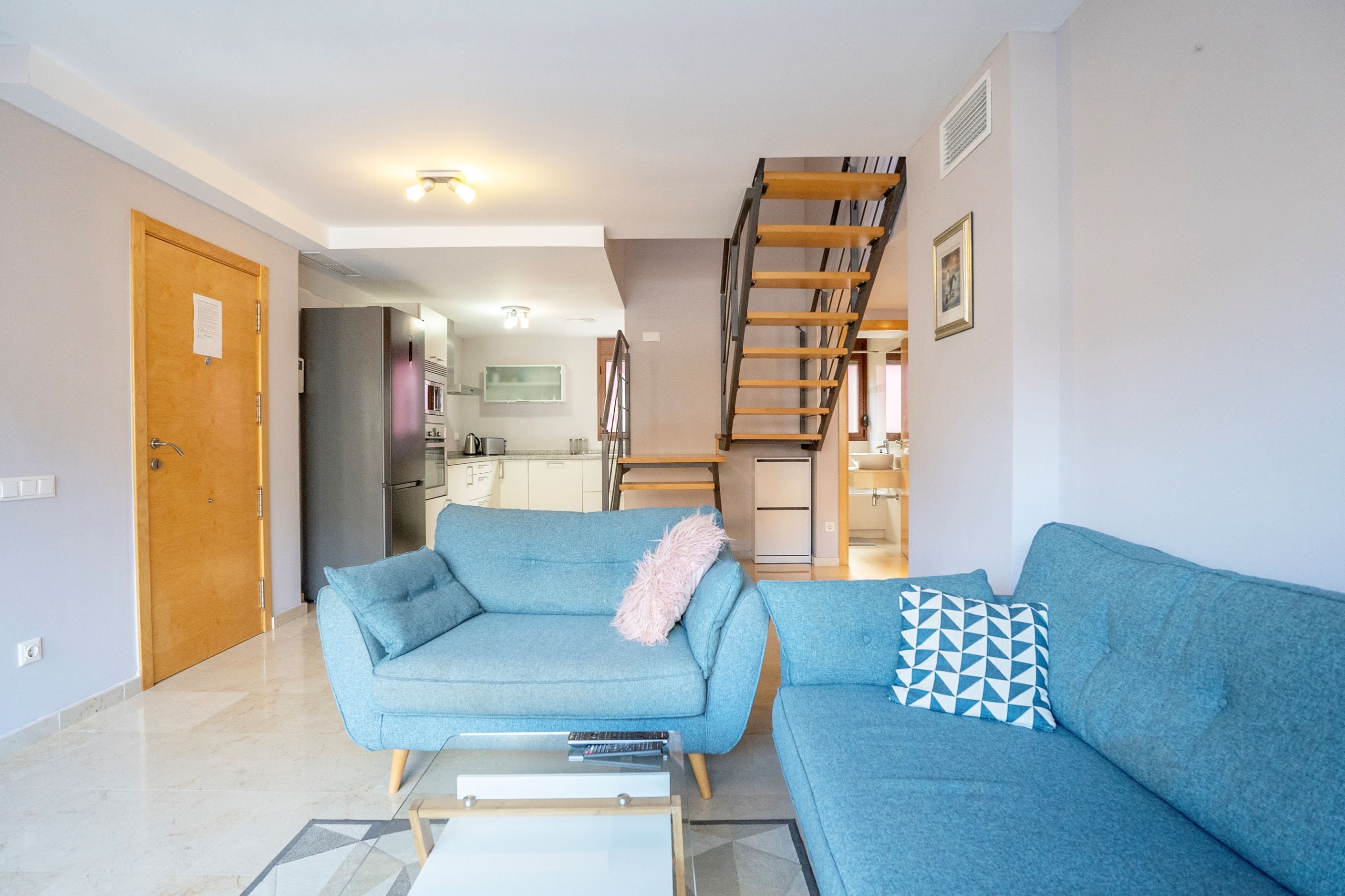 The interior features an open-plan kitchen, a bright and spacious living-dining area, two bedrooms with fitted wardrobes, and two bathrooms, one of them en suite. From the living room, there is access to a large terrace with open views. On the upper floor, a versatile space can be used as an extra bedroom, office, or relaxation area, with a private terrace ideal for sunbathing in peace.