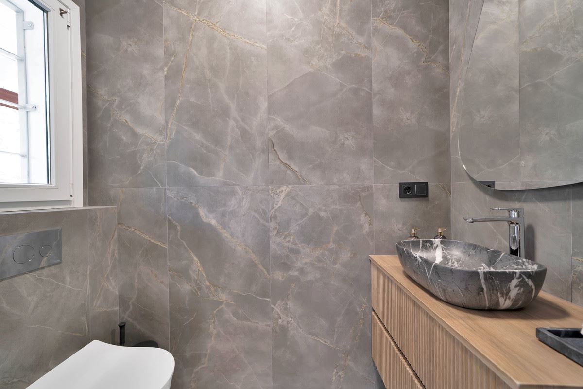 The open kitchen is modern and fully equipped with high-quality appliances and a central kitchen island. Adjacent is a practical laundry room with washing machines, extra refrigerator space and pantry. The dining room, with large windows and lovely light, also has access to the terrace and blurs the line between inside and outside.