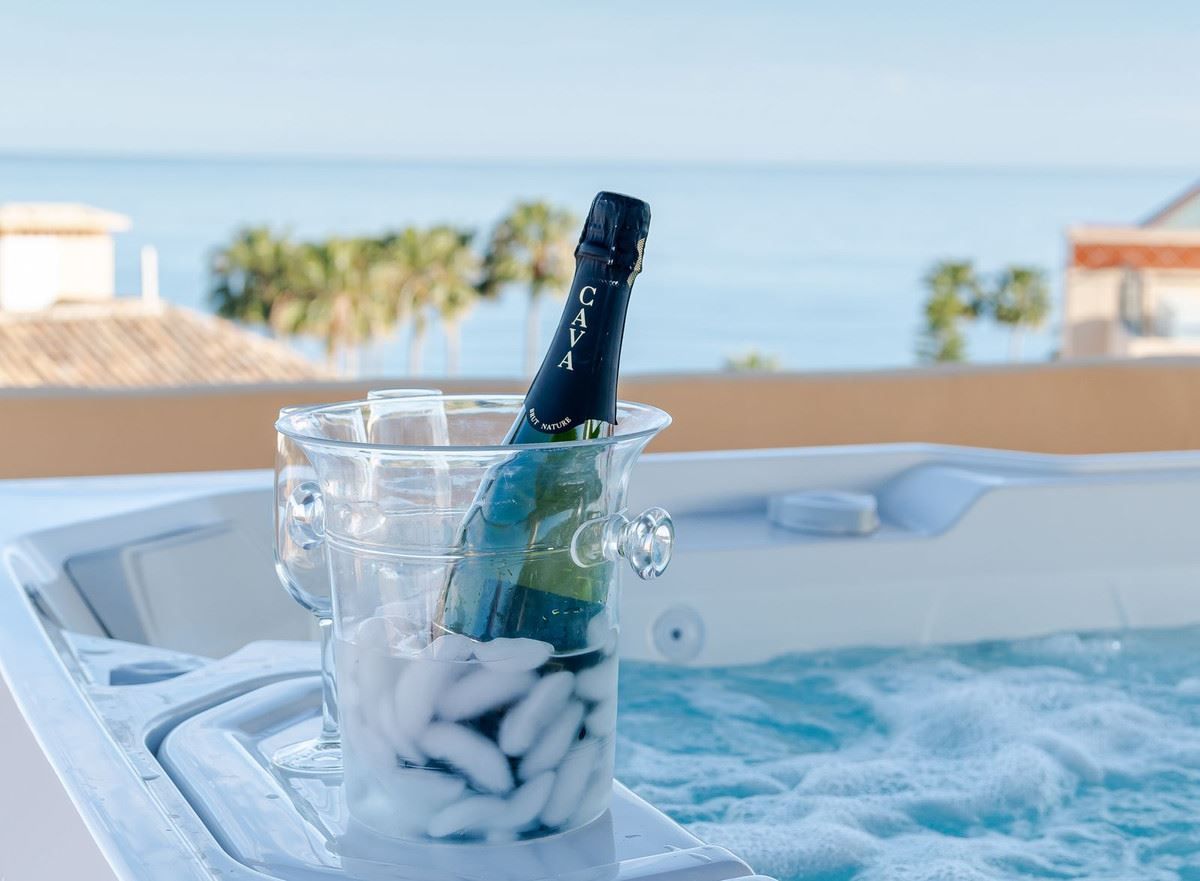 The living room opens onto a large, partially covered terrace with a built-in barbecue – the perfect place for al fresco dining with breathtaking views of the coast. An elegant spiral staircase leads up to the roof terrace, where 360-degree views stretch from the Marbella and Estepona mountains to Gibraltar and the North African coast. Here, a generous jacuzzi, shaded lounge area and sun loungers await – the ultimate place for relaxation or social gatherings under the Mediterranean sun.