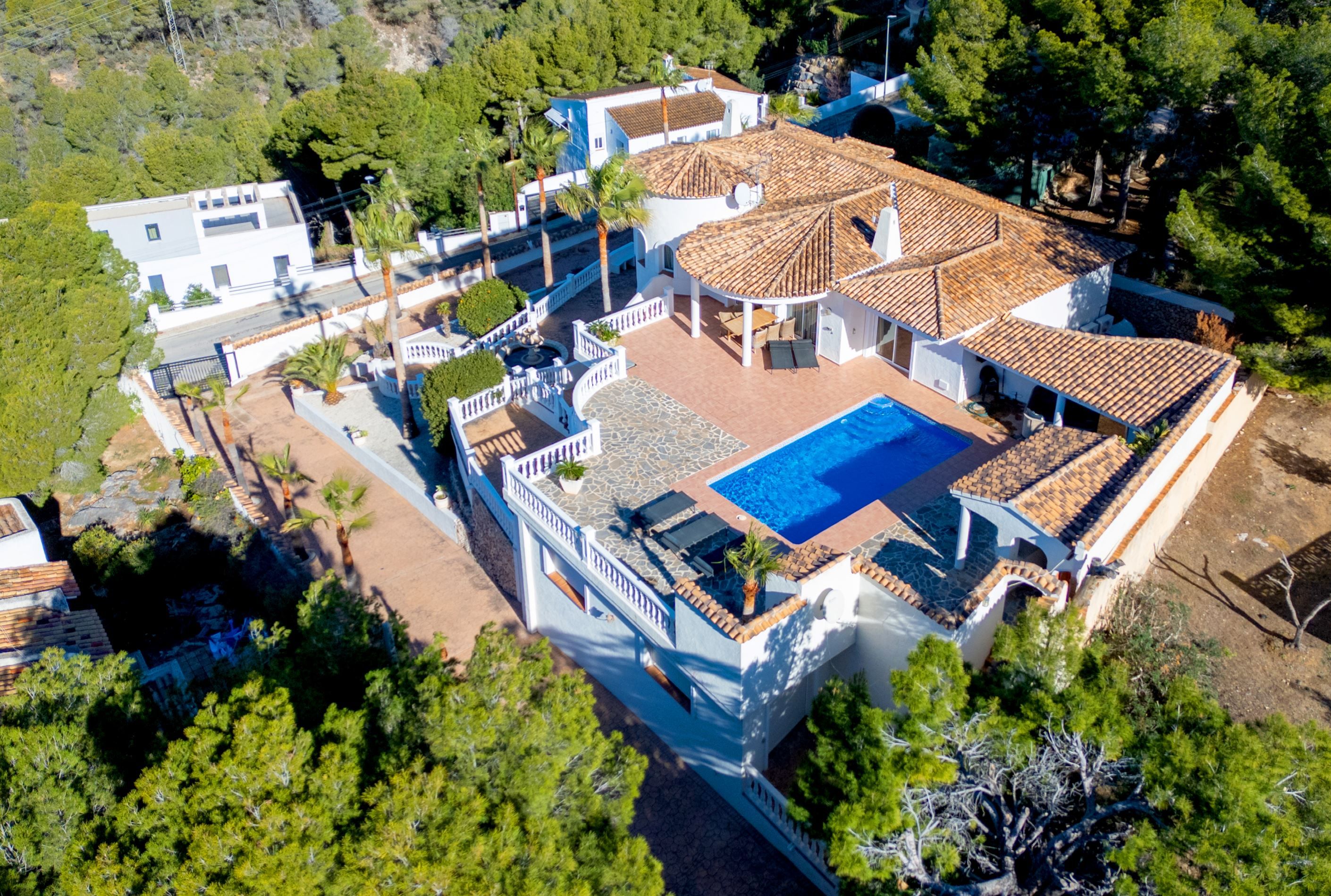 The property is accessed via an automatic gate and a beautiful palm-lined driveway leading to the garage and parking at ground level. The villa offers flexible entrance solutions and can also be accessed directly from the terrace.