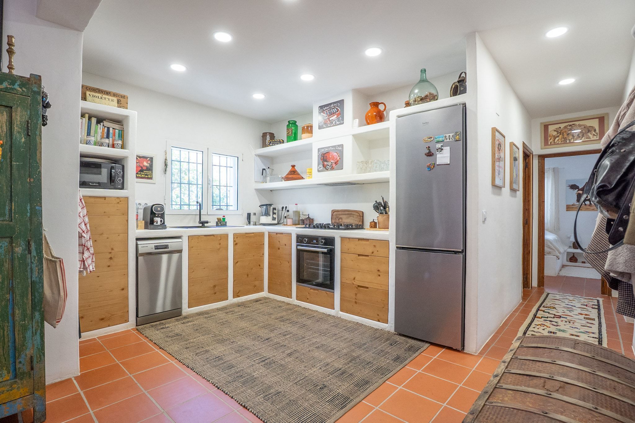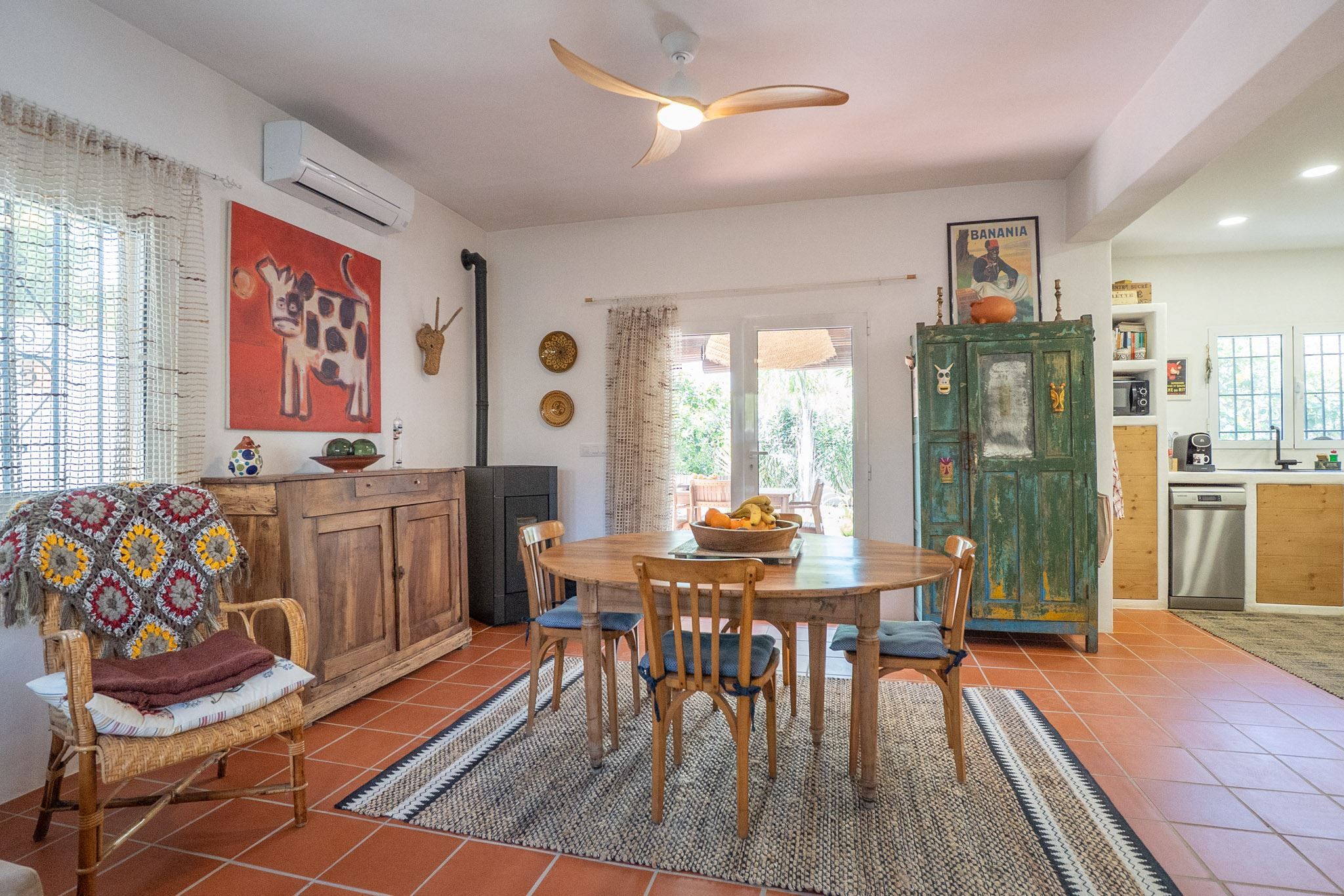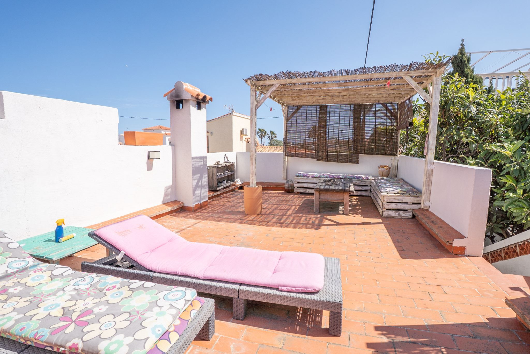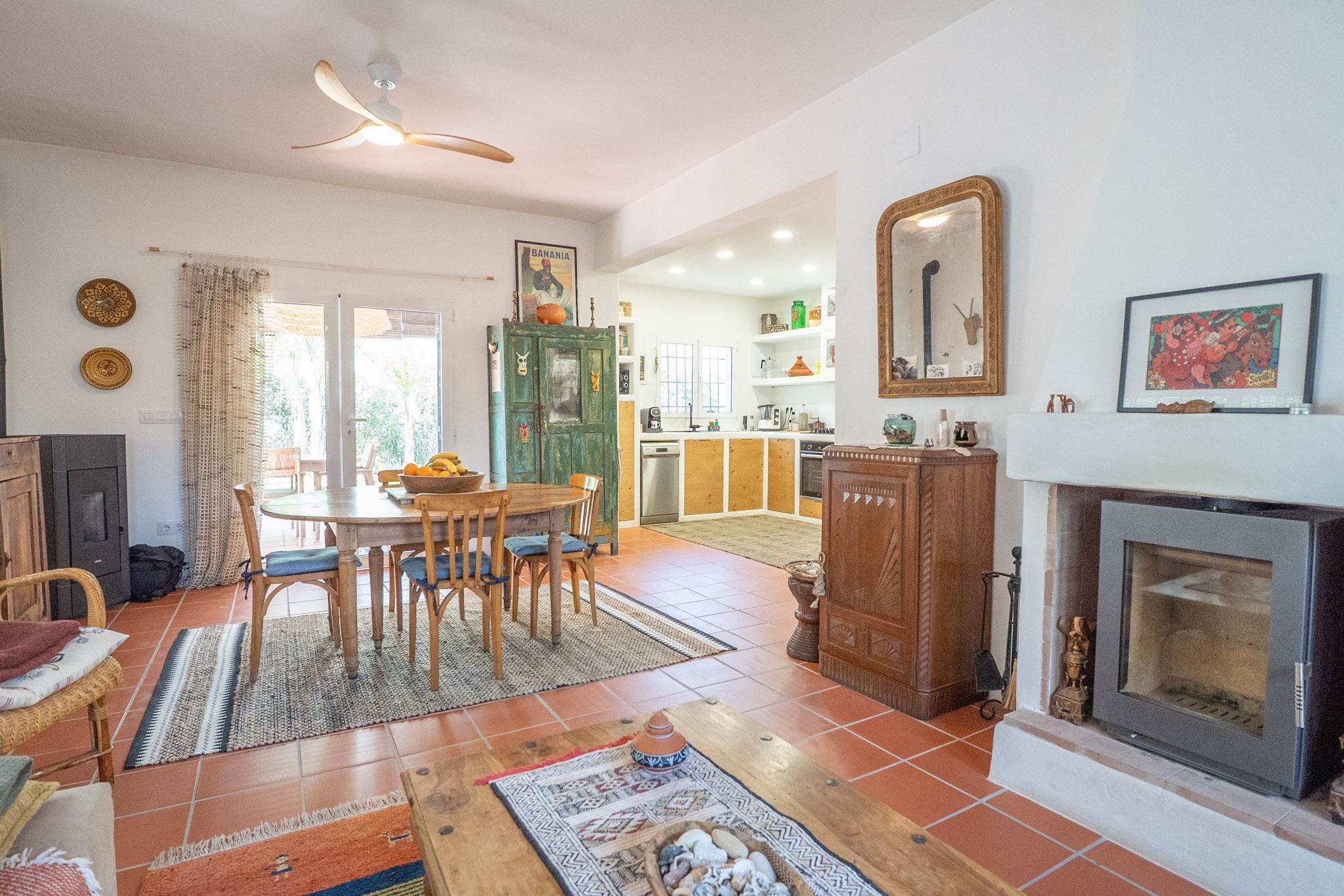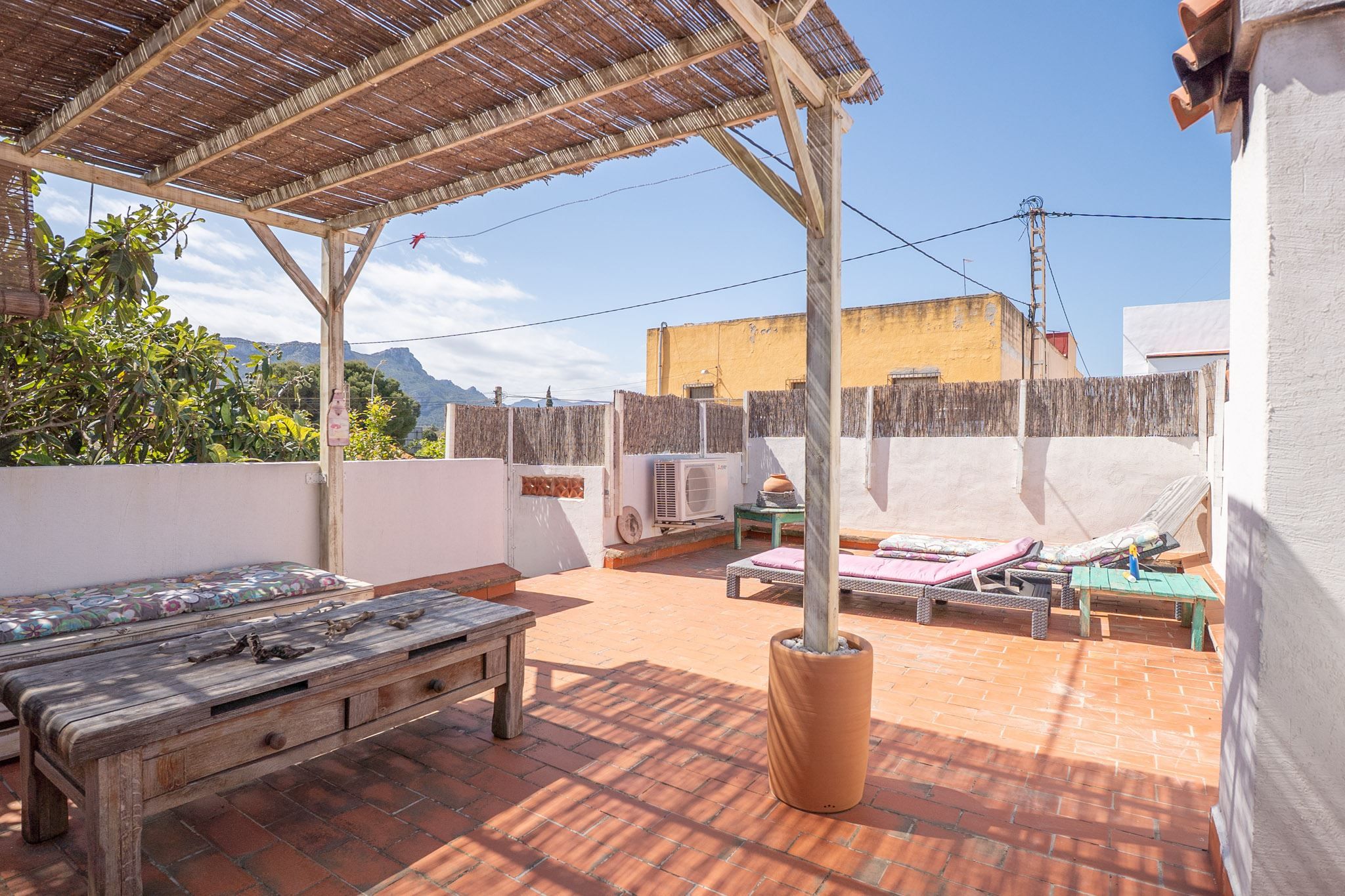 The property offers three bedrooms and two bathrooms, all renovated in an Ibiza-inspired style, with custom-made features throughout the kitchen, bathrooms and bedrooms. The combination of solid construction and wood details creates a warm and unique atmosphere. The house is equipped with air conditioning and a pellet stove for year-round comfort. On the roof, there is also a private rooftop terrace with sea views, perfect for enjoying the sun all year round.