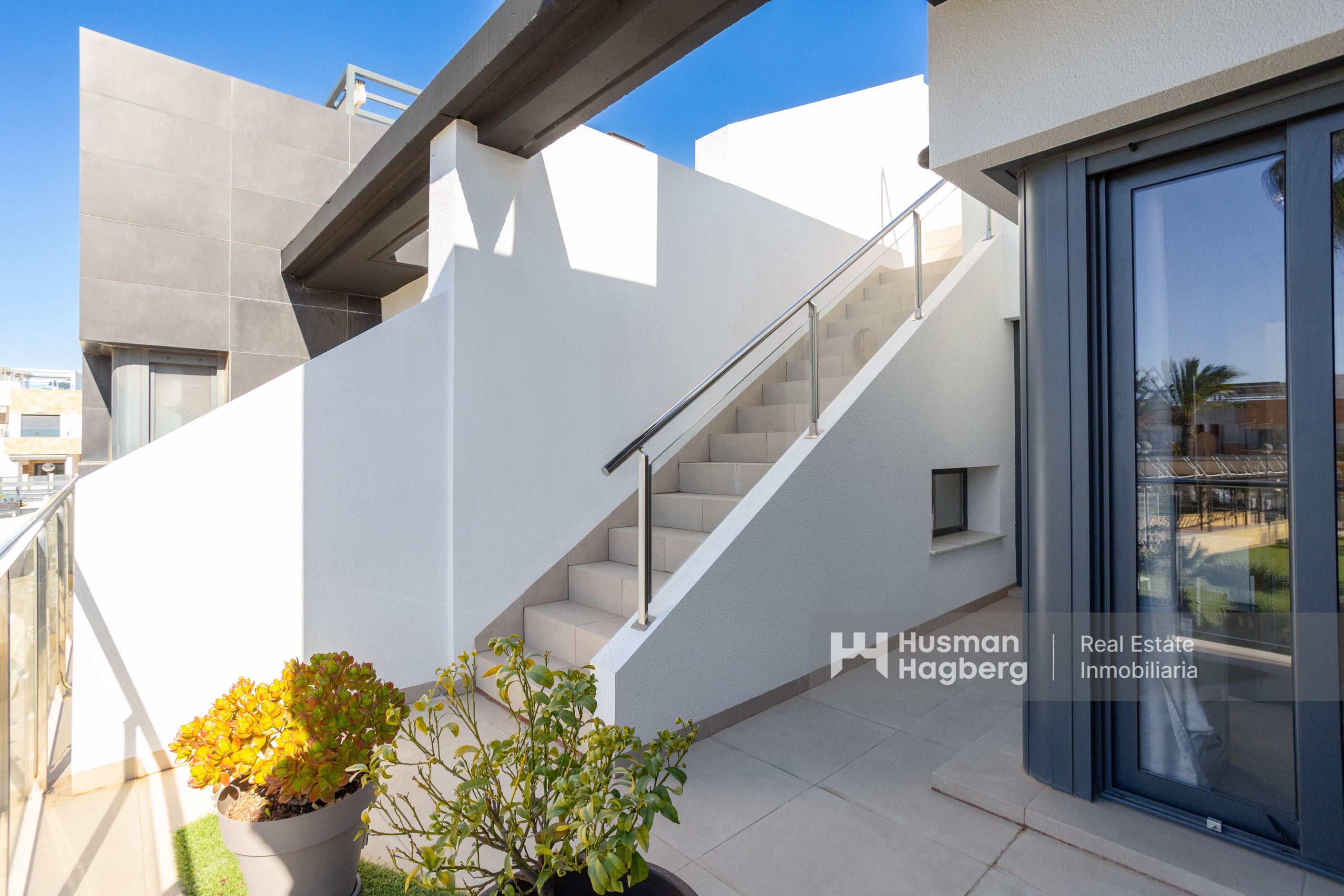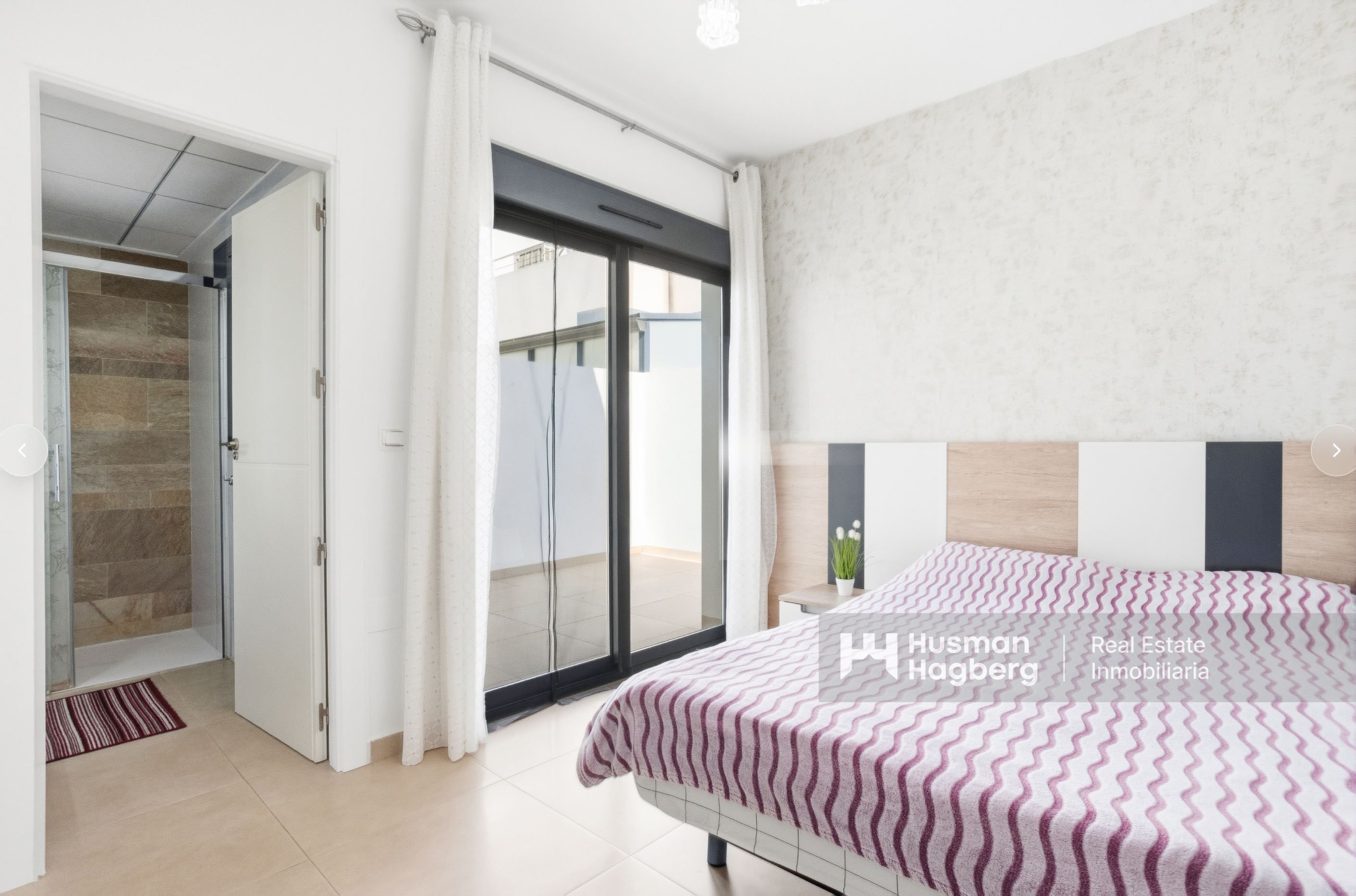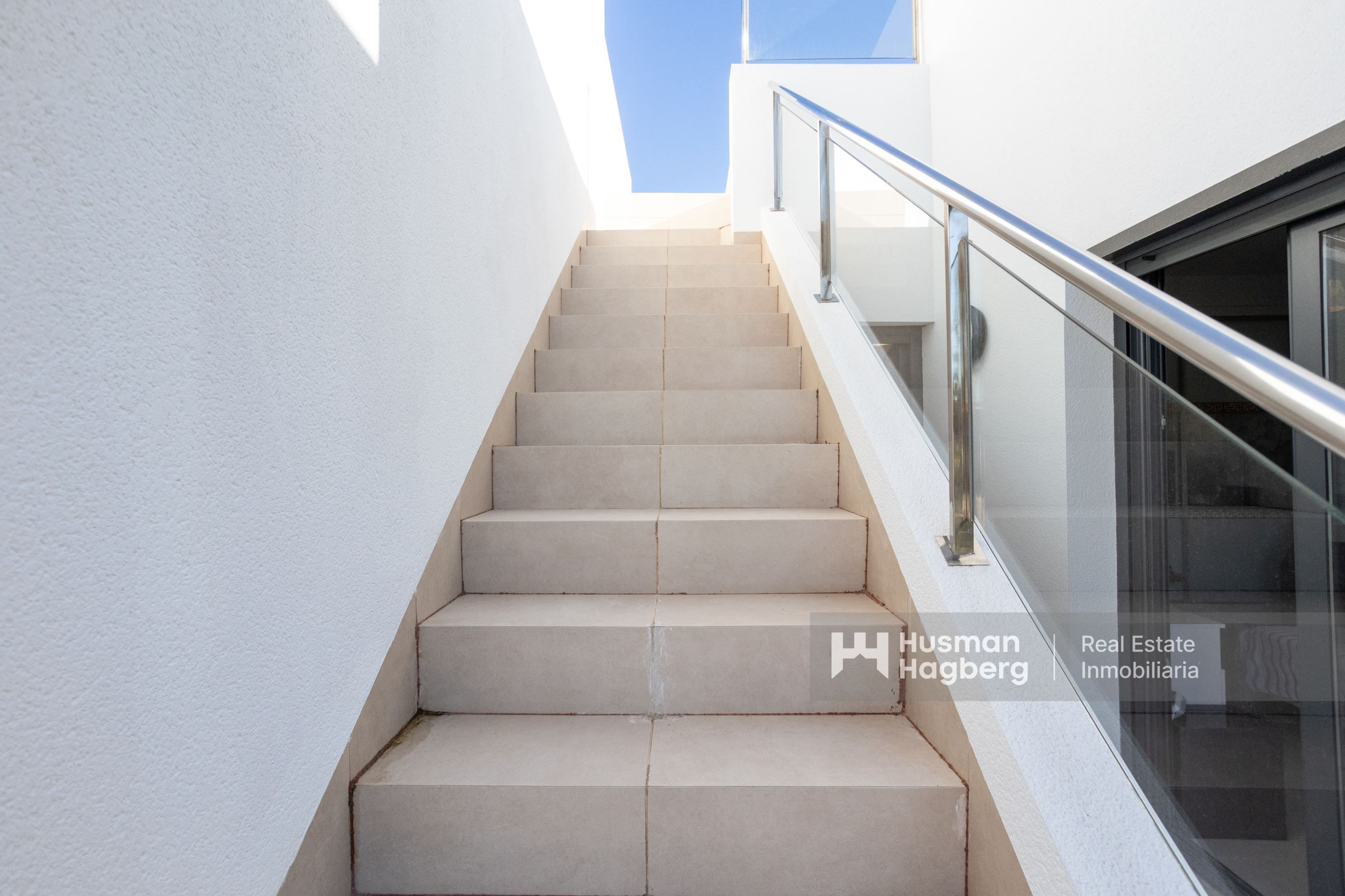 The house is spread over two floors and offers a total of 199 square meters of living space, with three bedrooms and three bathrooms – a home that is just as suitable for family life as for those who often have guests. On the upper floor, all bedrooms have direct access to their own balconies or patios, which gives a wonderful feeling of space and privacy. There is also a pleasant private patio on the entrance floor that extends the home into the outdoors.