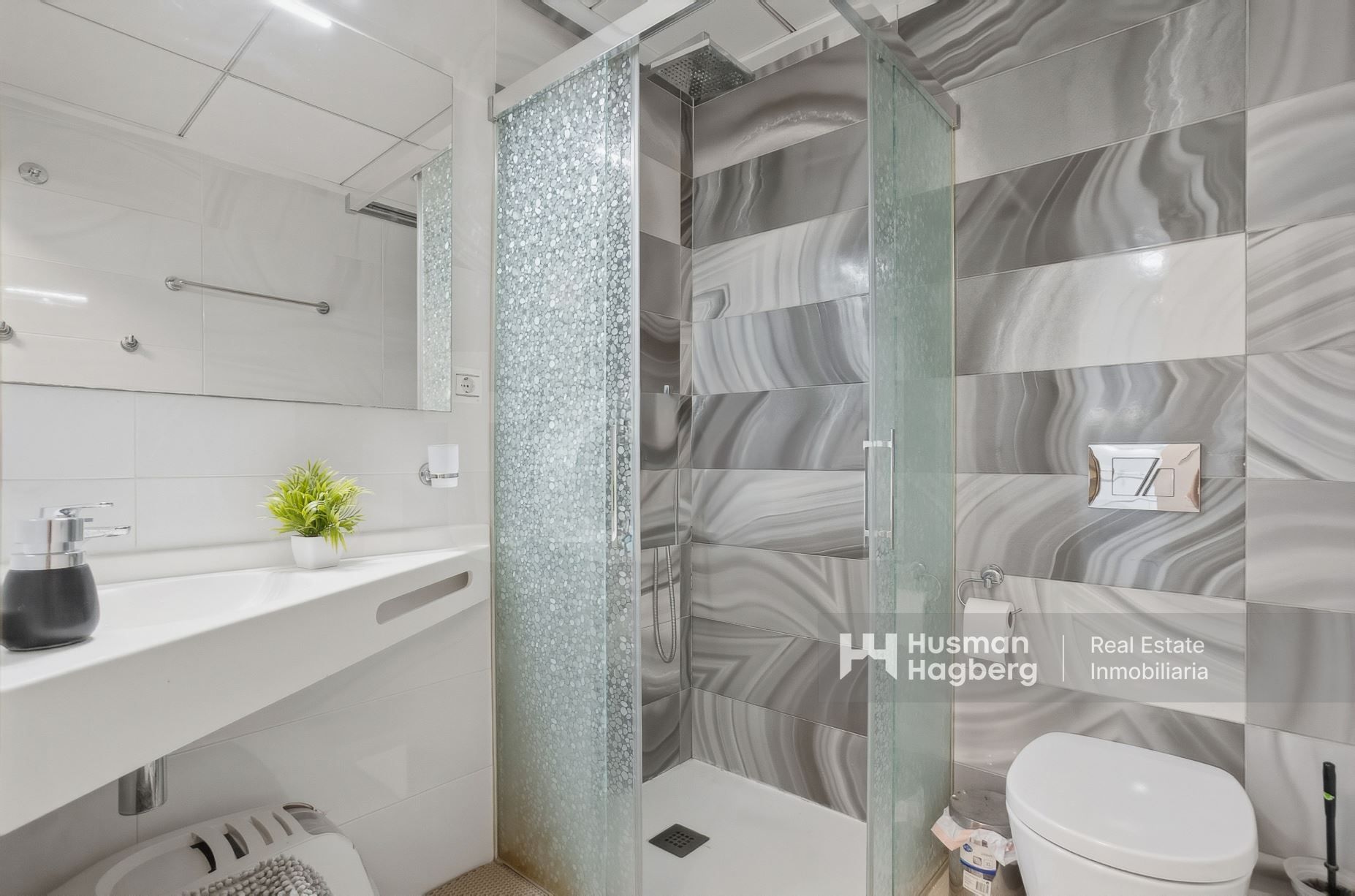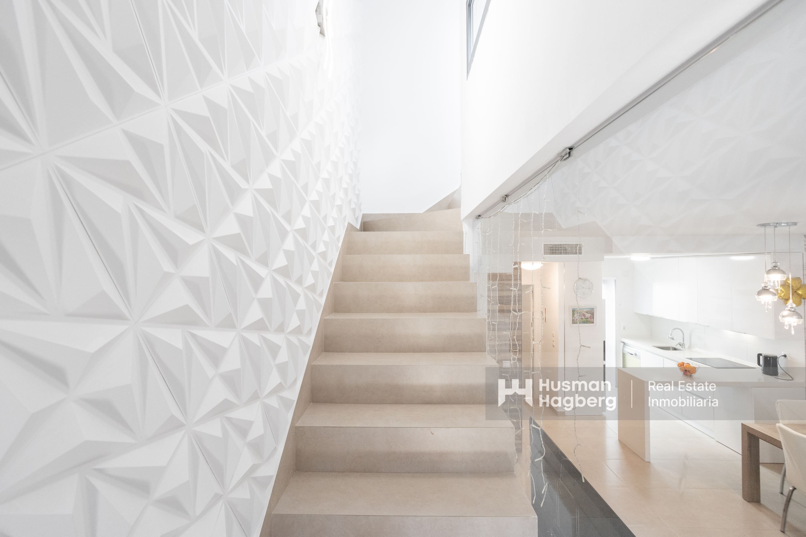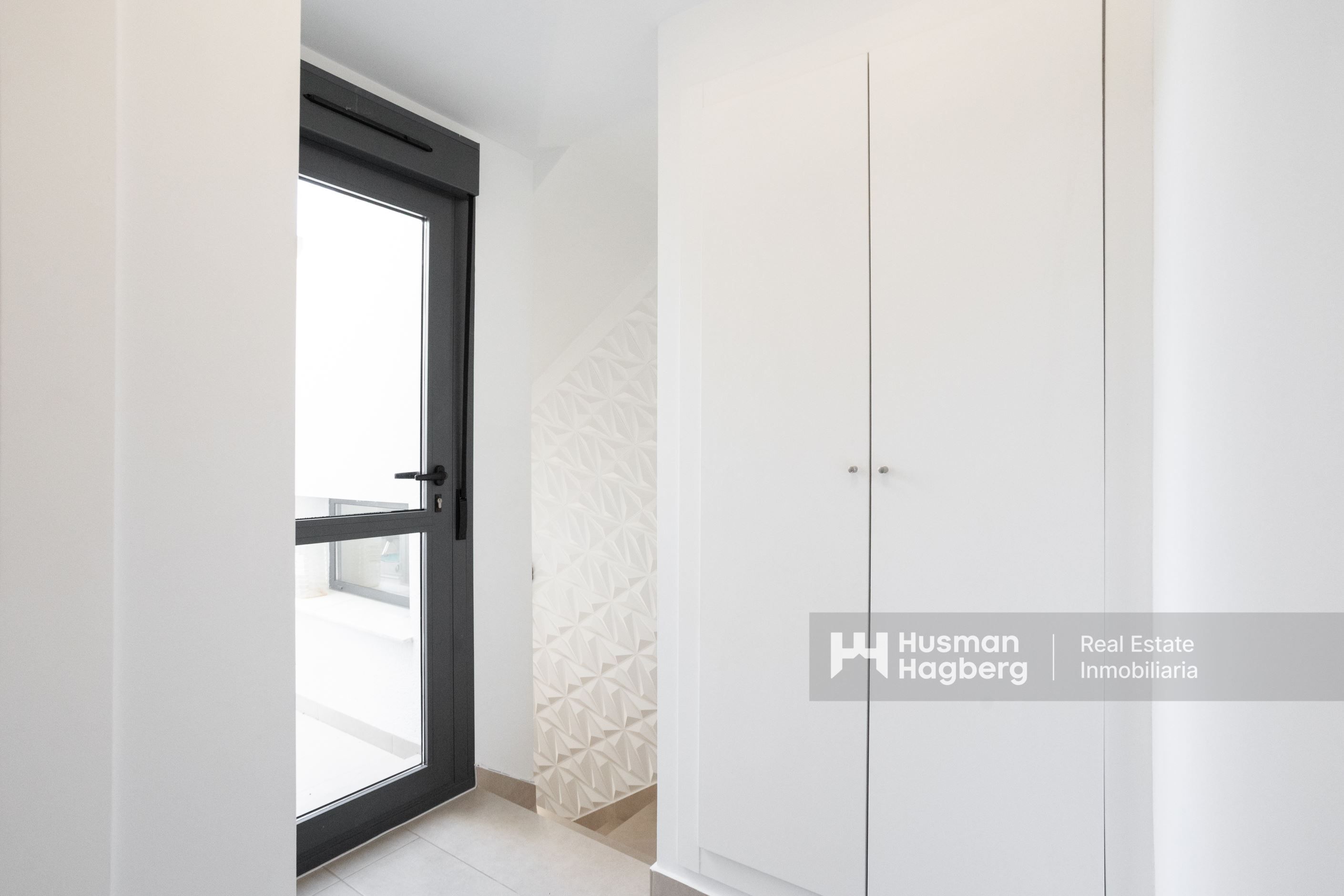 The house is spread over two floors and offers a total of 199 square meters of living space, with three bedrooms and three bathrooms – a home that is just as suitable for family life as for those who often have guests. On the upper floor, all bedrooms have direct access to their own balconies or patios, which gives a wonderful feeling of space and privacy. There is also a pleasant private patio on the entrance floor that extends the home into the outdoors.