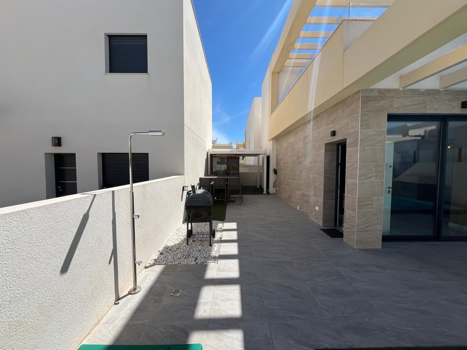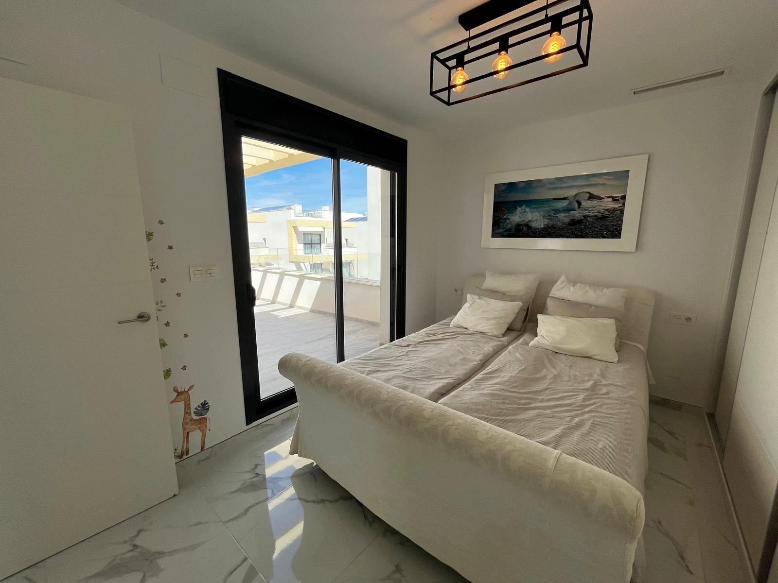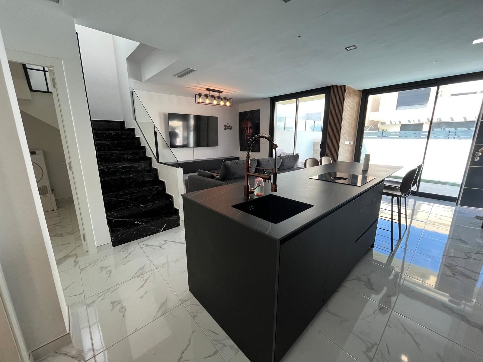 A warm welcome to Los Montesinos and this stylish villa with a well-thought-out floor plan, generous light flows and a consistently inviting feel. The villa is modern throughout and consists of three bedrooms, two bathrooms and a living room and kitchen in an open plan. On the large plot there is a private pool and space for outdoor furniture and sun loungers. One floor up is the spacious terrace with space for, among other things, a lounge group.