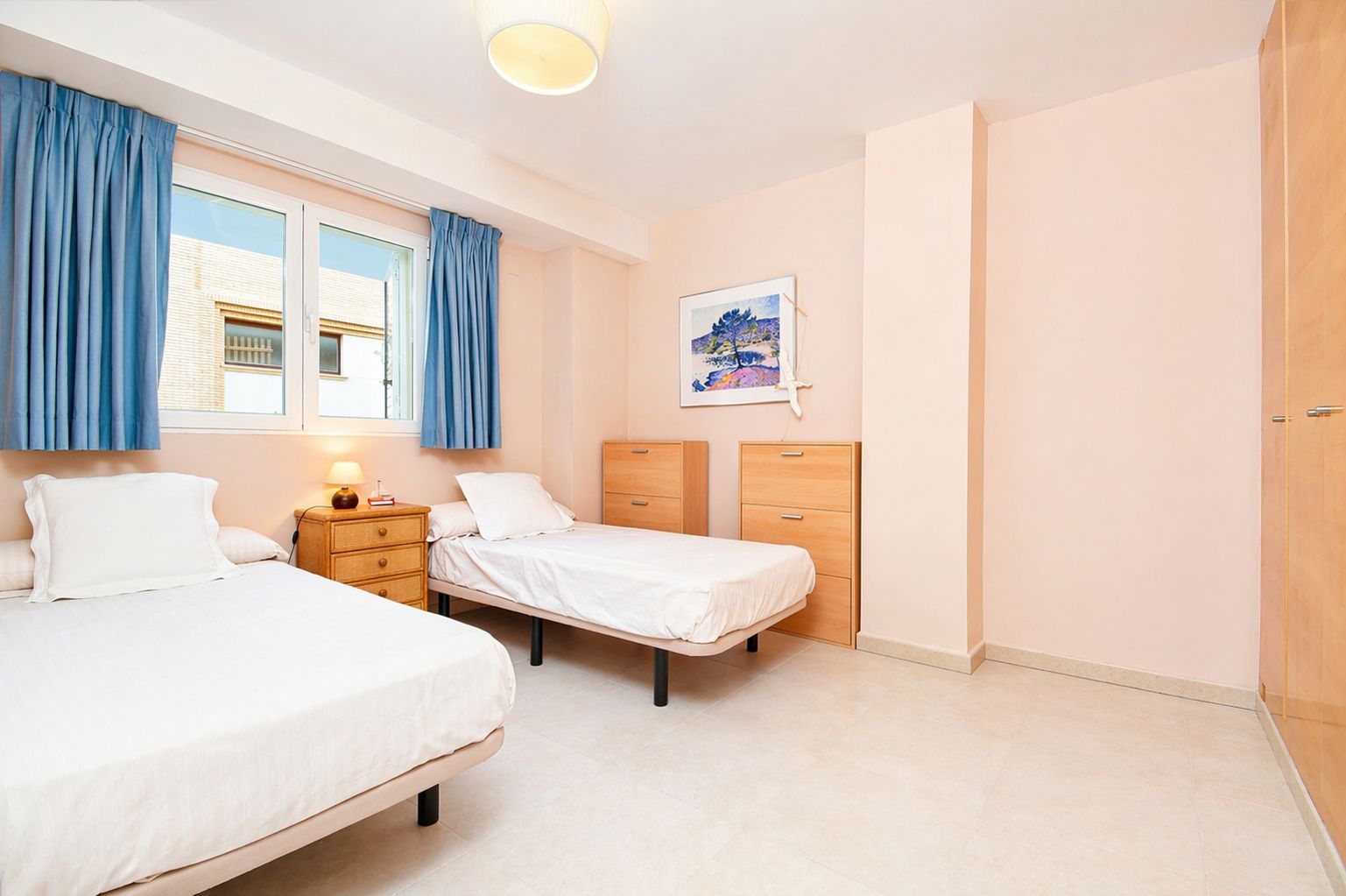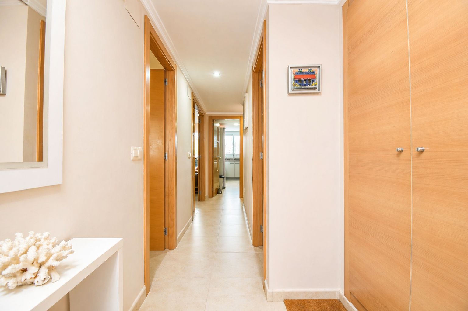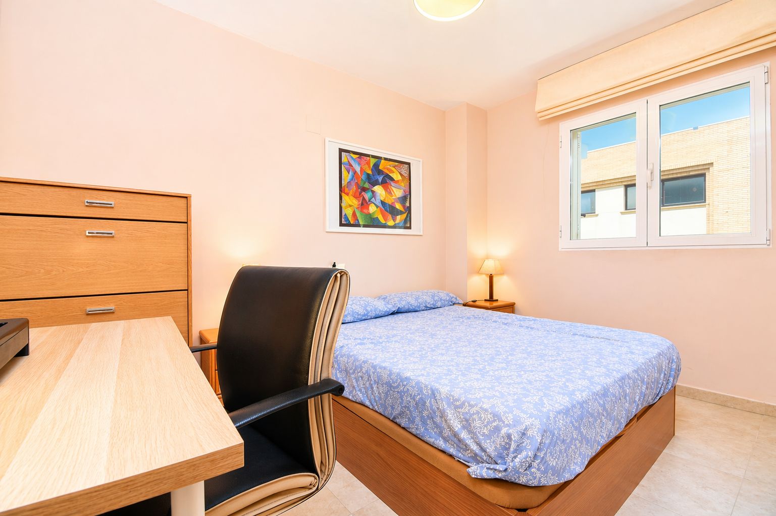 The property offers approximately 87 sqm built and features a functional and comfortable layout. It includes a bright living room with access to a covered terrace, a separate kitchen, three bedrooms and two bathrooms, one of them integrated into the master bedroom. The apartment is in good condition and provides an ideal space both for families and for those looking for a second residence on the coast.