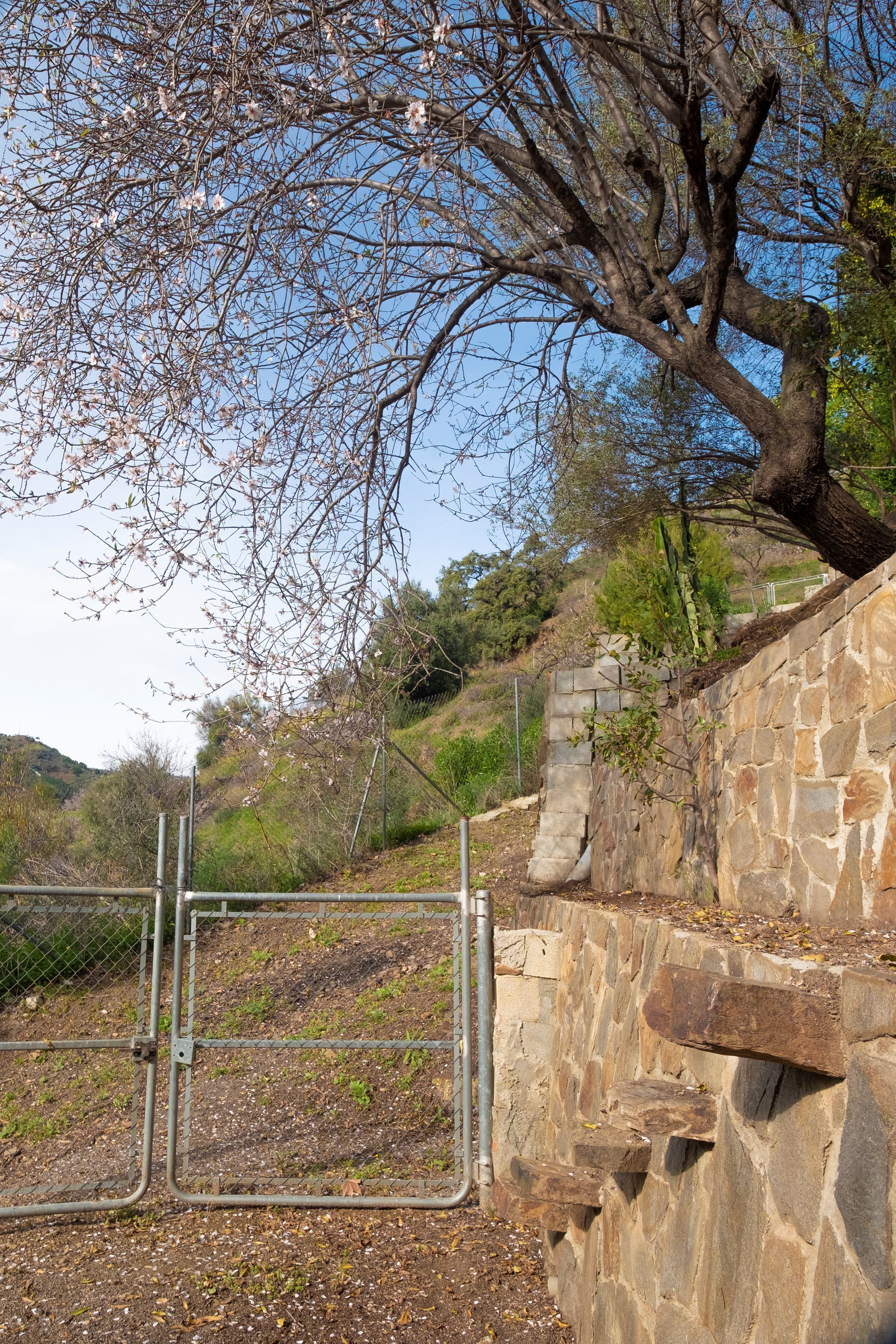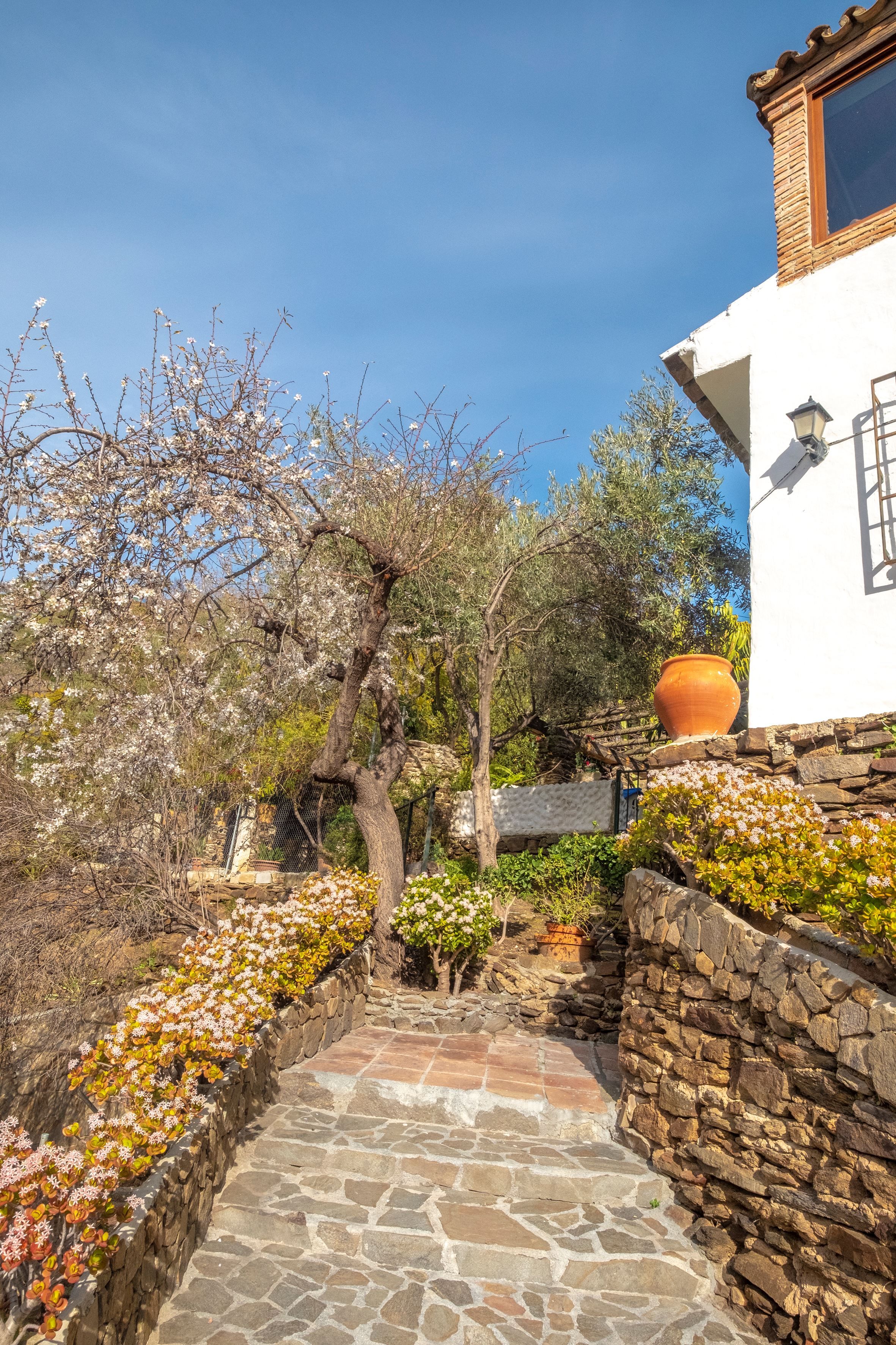 La casa está rodeada por un acogedor jardín con árboles frutales y palmeras. La entrada conduce a través de una pérgola de jardín con una fuente.