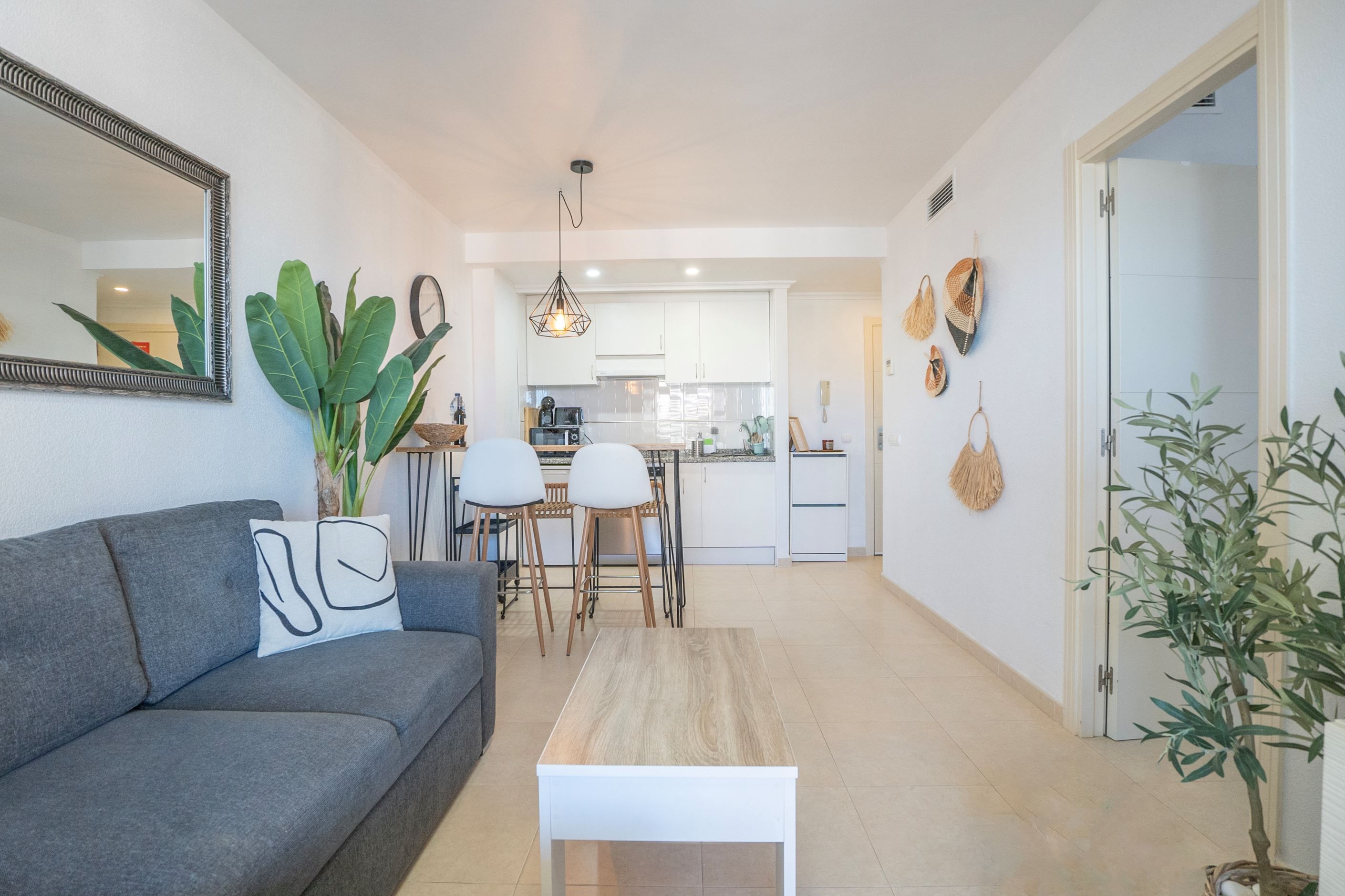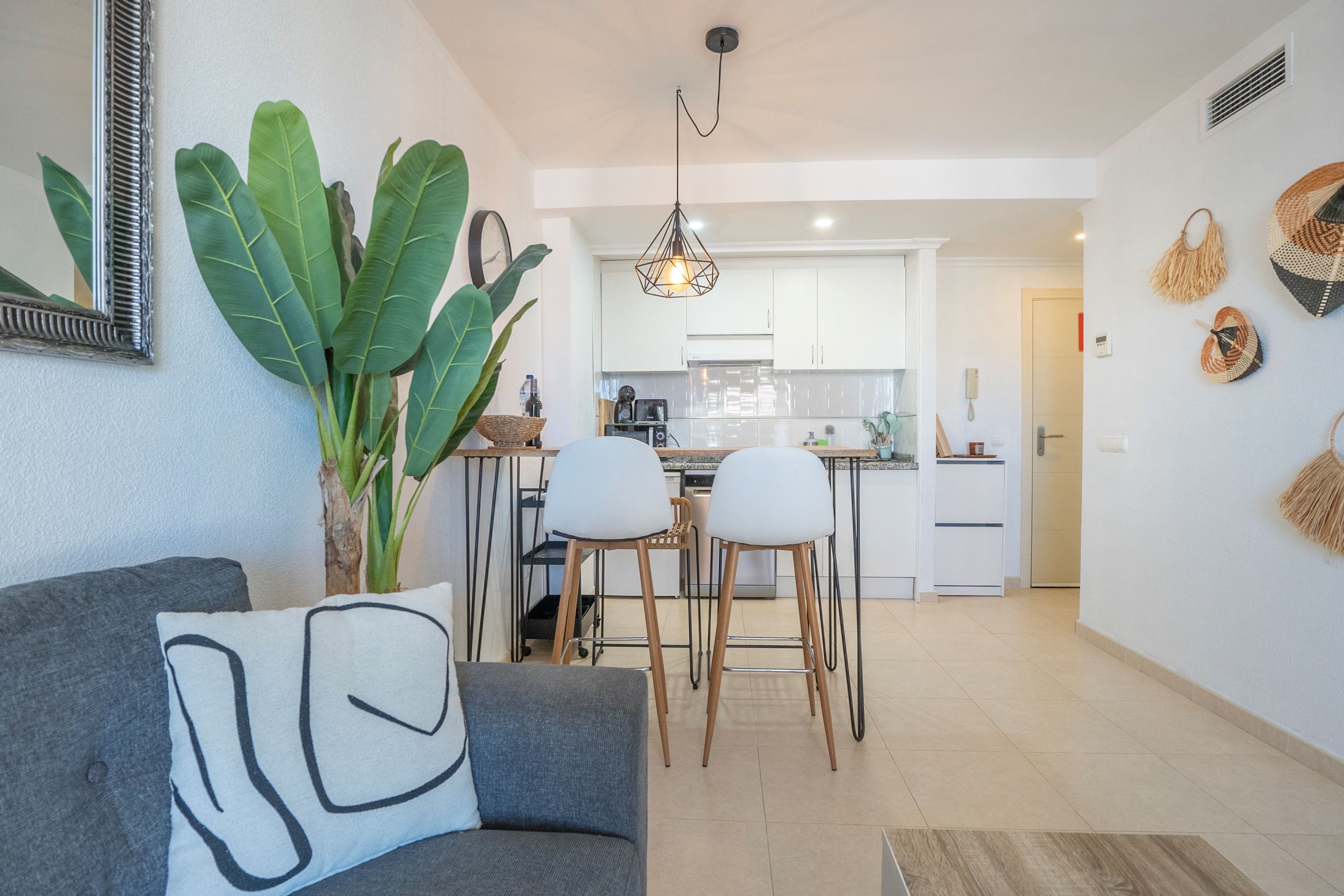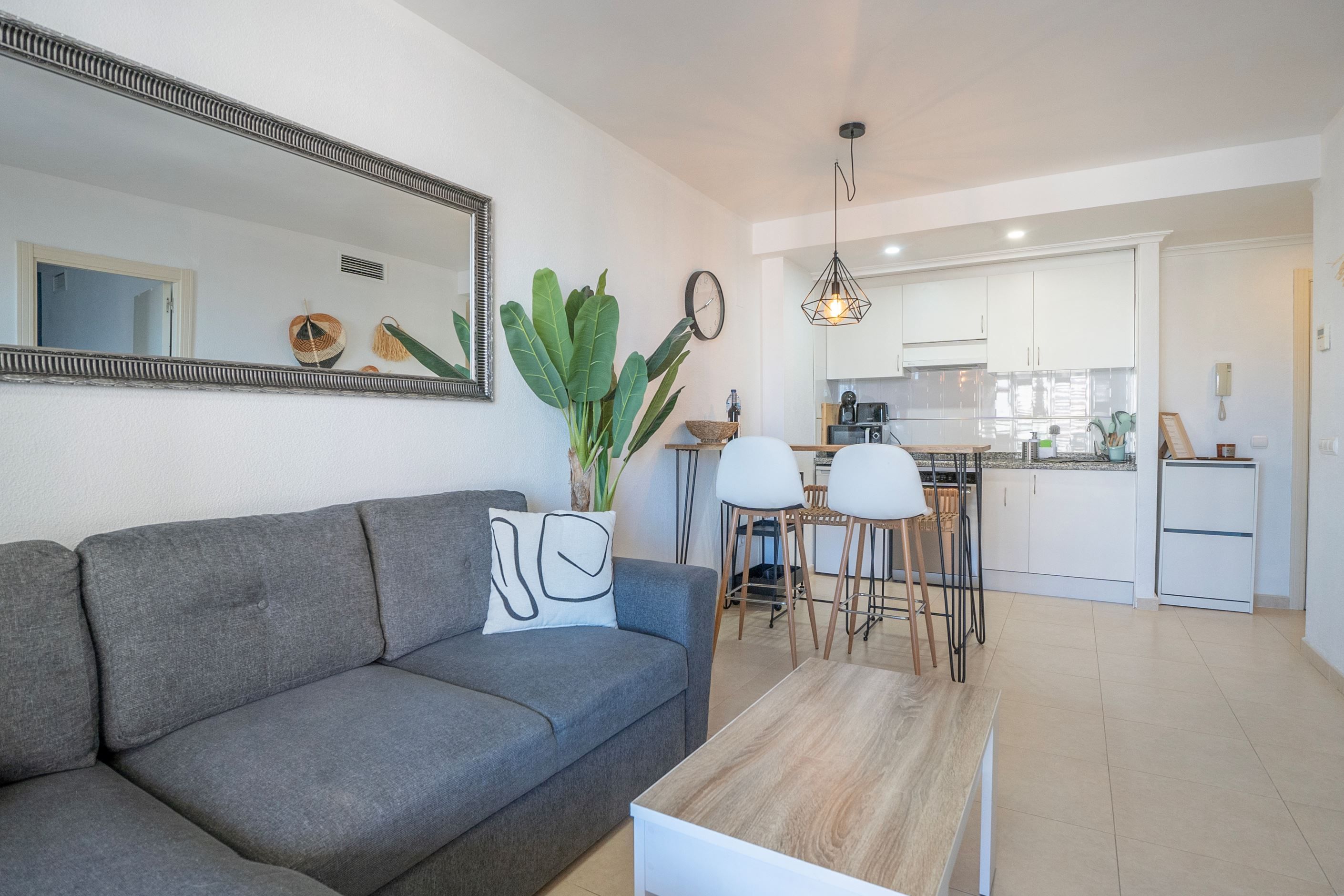La vivienda cuenta con un dormitorio con armario empotrado, un salón funcional con sofá cama y una cocina americana moderna, completamente equipada e integrada en el espacio principal. El baño también ha sido renovado, con un diseño actual y plato de ducha.