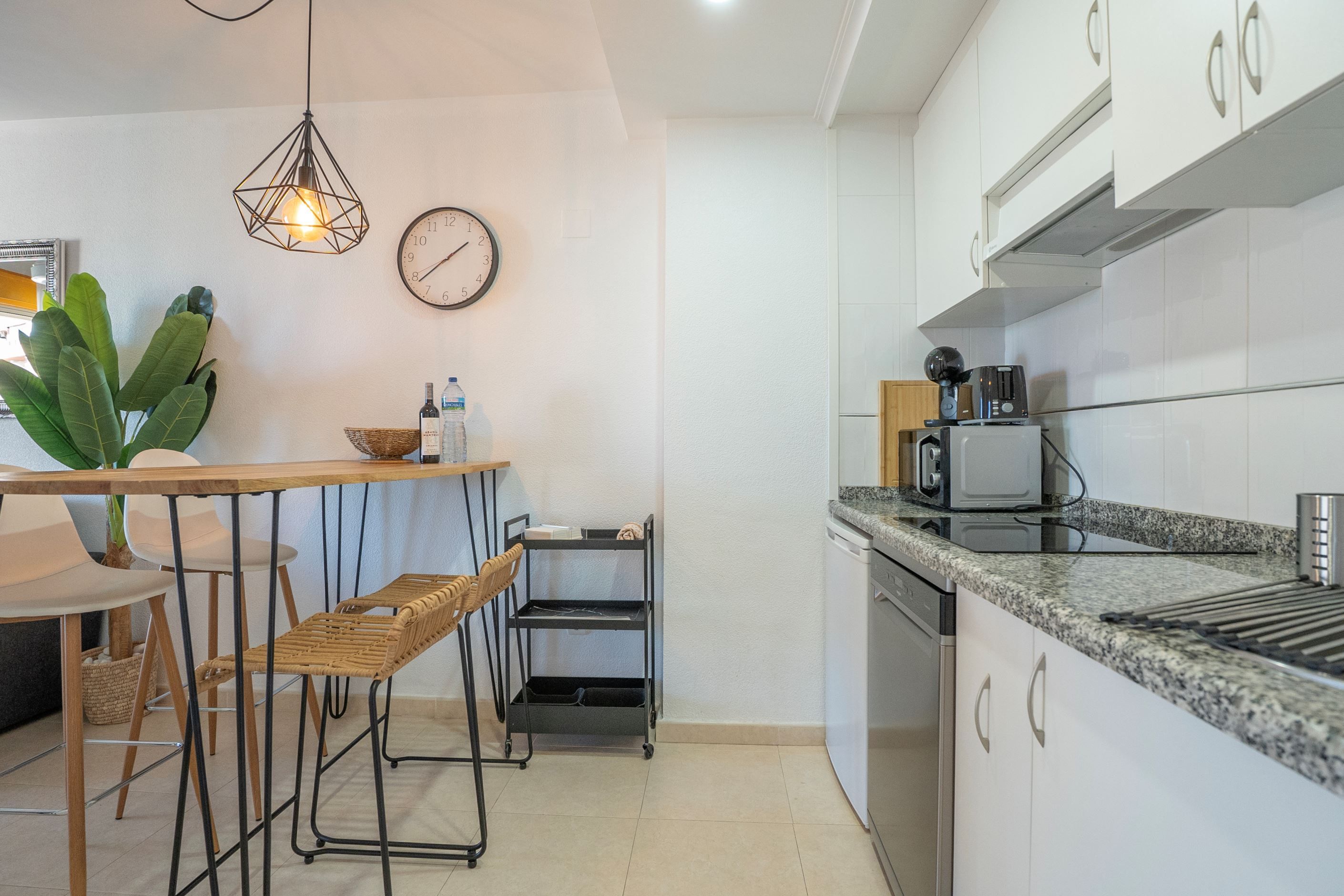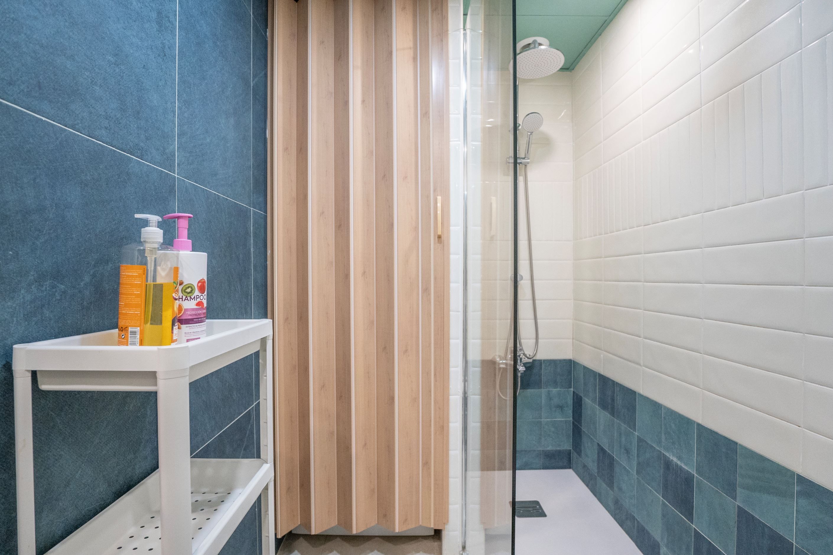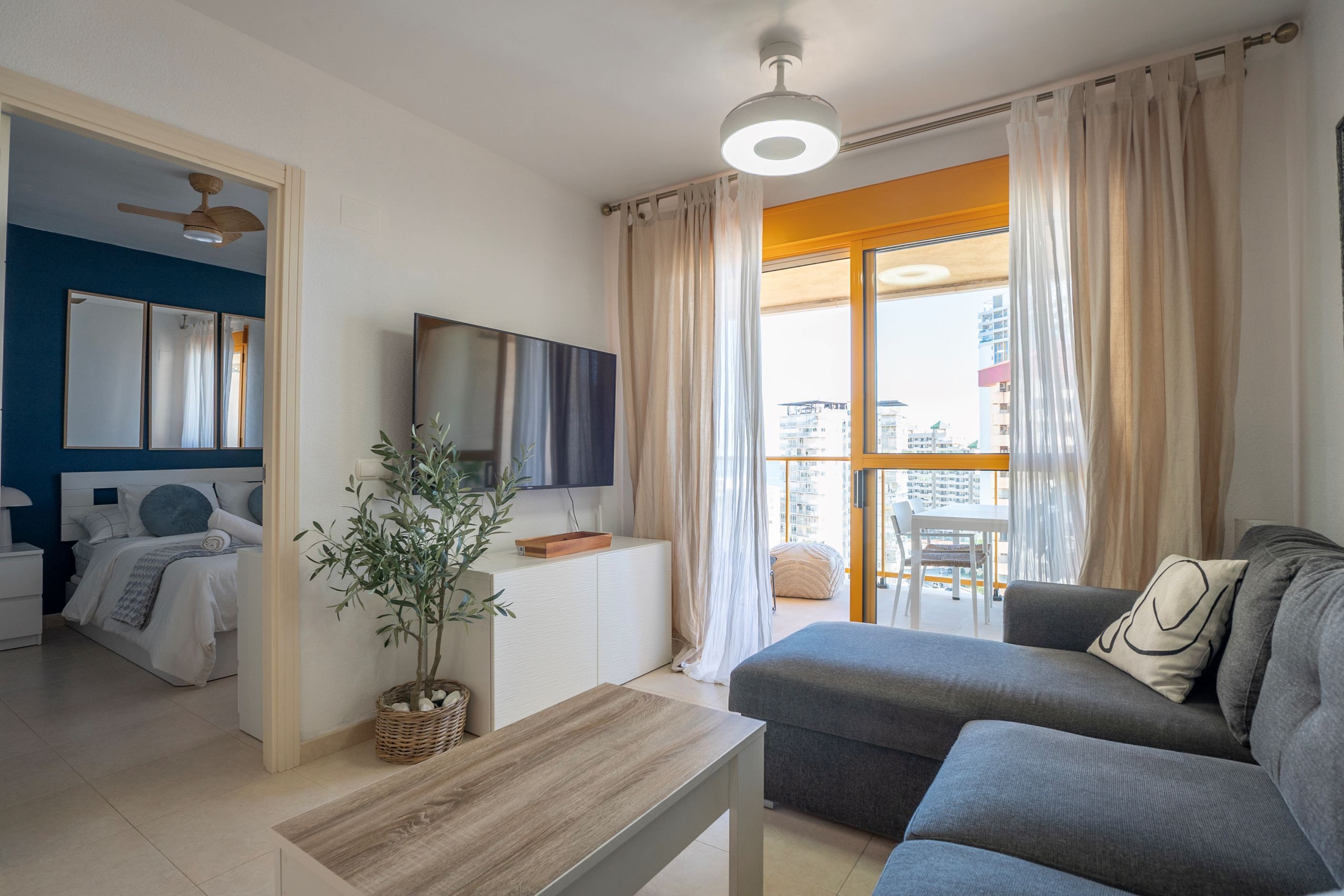 La vivienda cuenta con un dormitorio con armario empotrado, un salón funcional con sofá cama y una cocina americana moderna, completamente equipada e integrada en el espacio principal. El baño también ha sido renovado, con un diseño actual y plato de ducha.