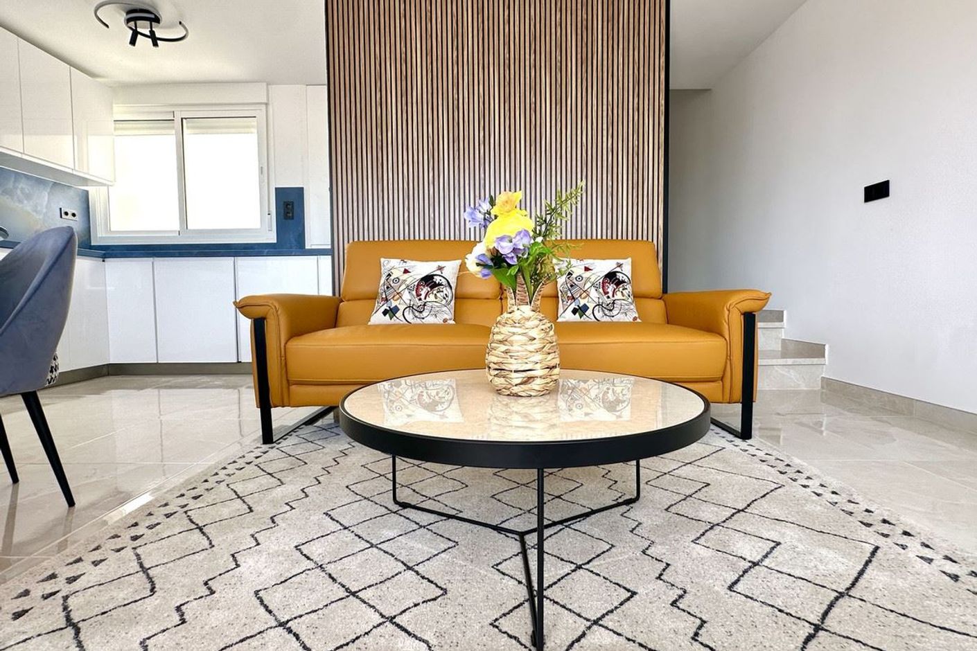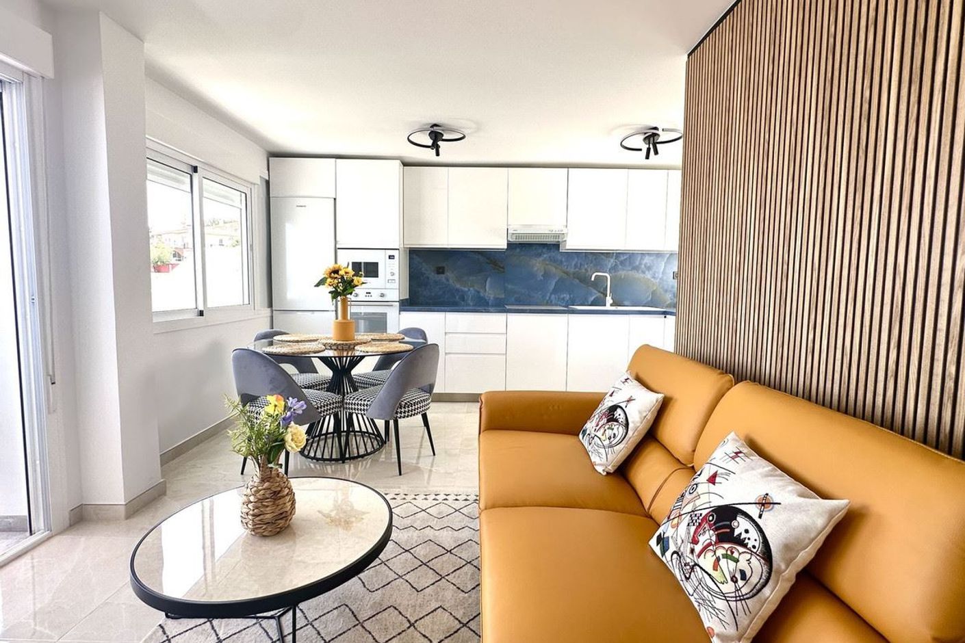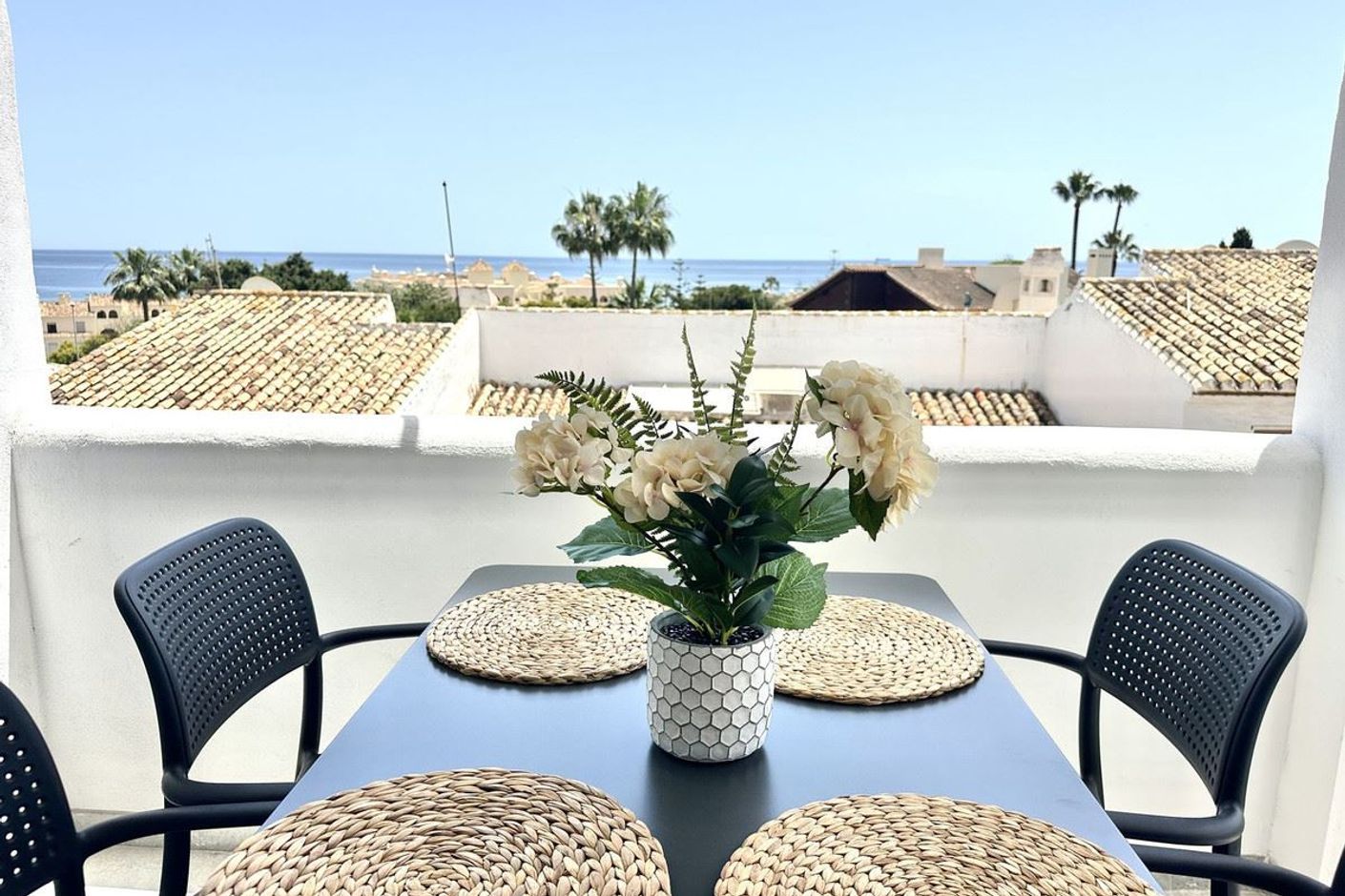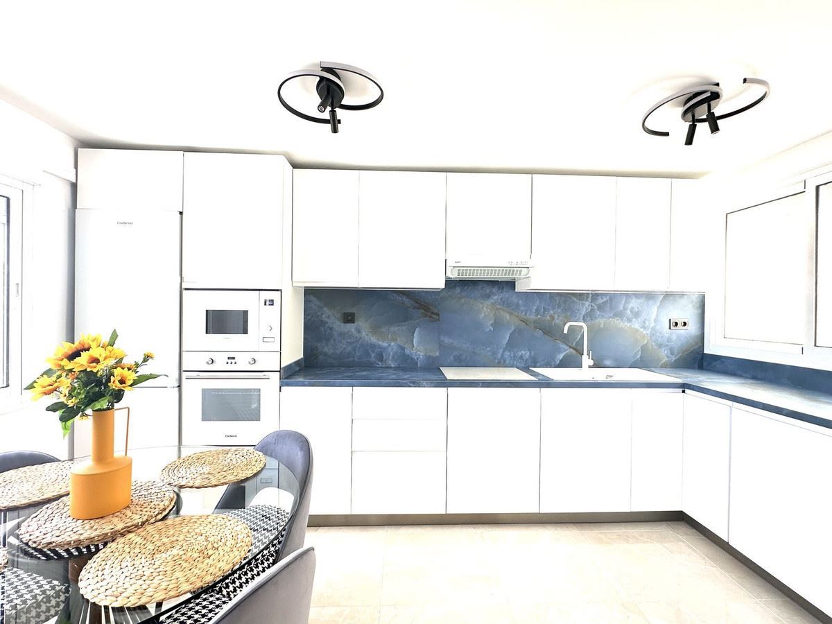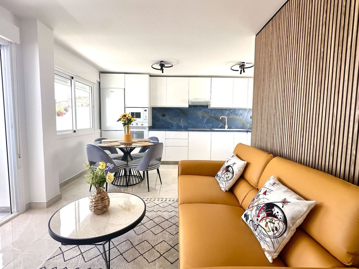 Recientemente renovado con materiales de alta calidad y sin estrenar, el apartamento ofrece un interior fresco y moderno con una sala de estar luminosa y bien distribuida. Grandes ventanales y puertas correderas dan a una terraza privada con preciosas vistas al mar, llenando la casa de luz natural.