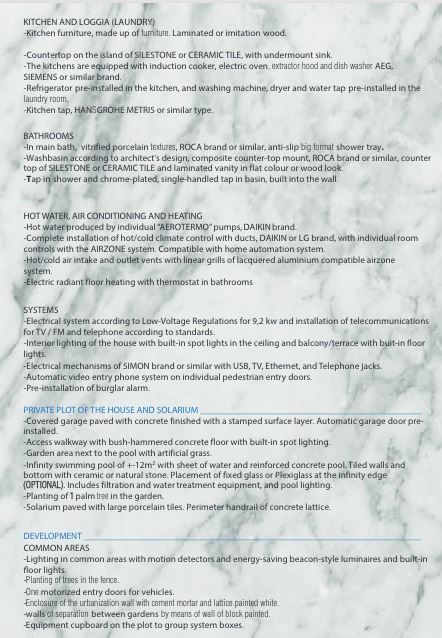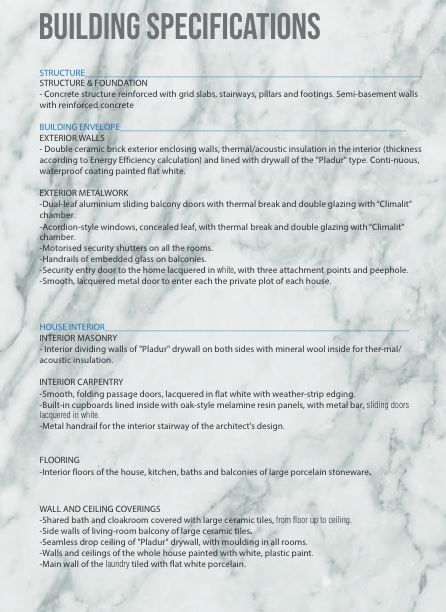 Moderna och högkvalitativa villor med den senaste designen. Villorna har mycket ljusinsläpp, och vardagsrummet har dubbel takhöjd, ett öppet kök i anslutning till sistnämnda. De är fördelade över en källare, tre våningar och en takterrass. Köket är fullt utrustat med kyl, frys, ugn, induktionshäll, fläkt, diskmaskin och tvättmaskin av märket SIEMENS eller liknande samt en bänkskiva i SILESTONE eller keramisk sten. Det finns ett separat tvättrum. AC (värme/kyla) är installerad via kanaler och badrummen har värmegolv och kranar av märket ROCA. Varje villa har en egen infinity pool och utöver detta ingår ett garage med plats för två bilar.
