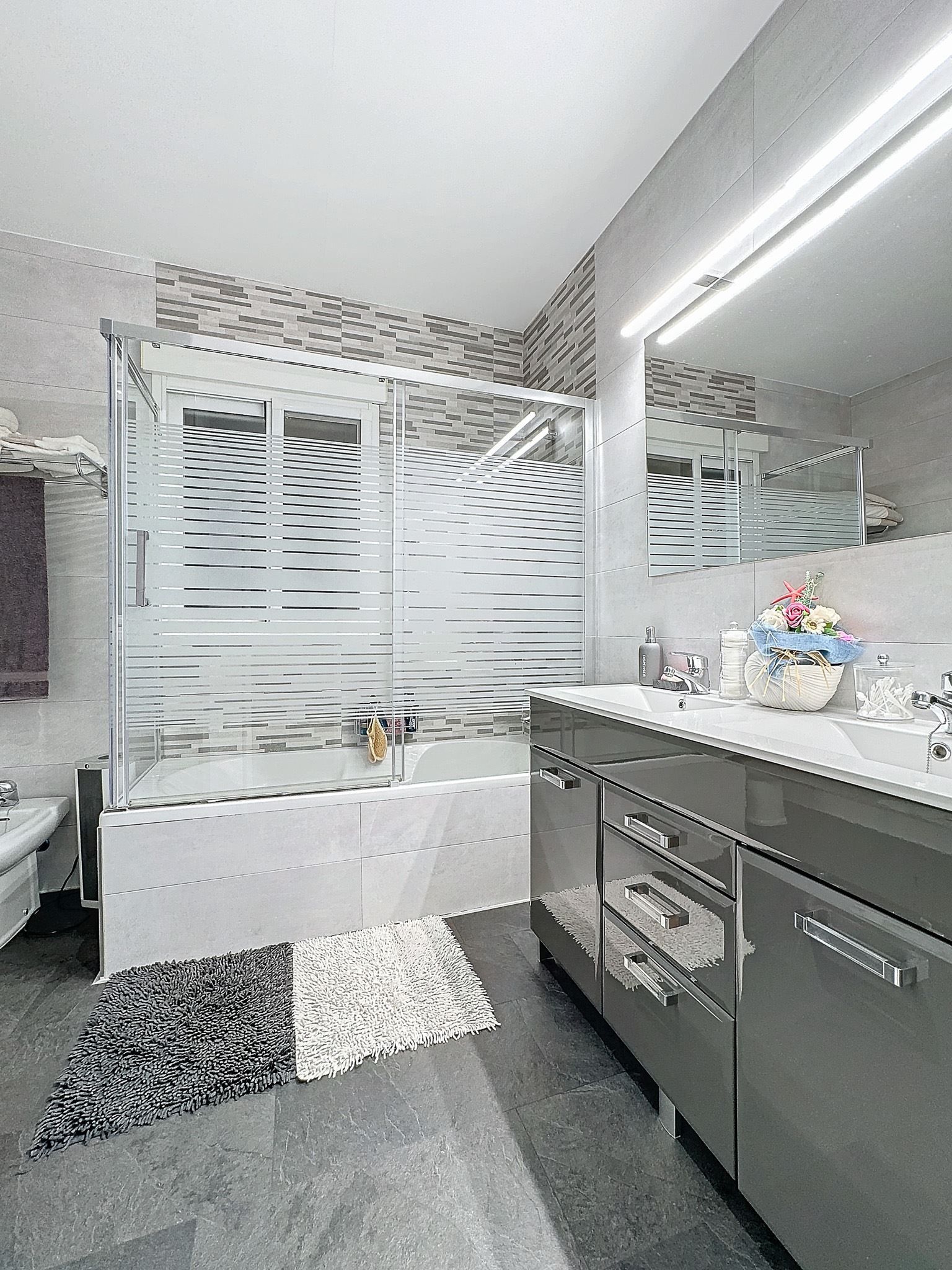 Utanför har fastigheten en saltvattenpool, lätt att underhålla, omgiven av anlagda områden med automatisk bevattning och LED-belysning som skapar en varm och effektiv atmosfär. Terrassen med grill och skjutbart glashölje gör att du kan njuta av den året runt. Det finns också ett privat garage, ytterligare parkering inom tomten, elbilsladdare och solpaneler, allt i en elegant och smakfullt designad fastighet.