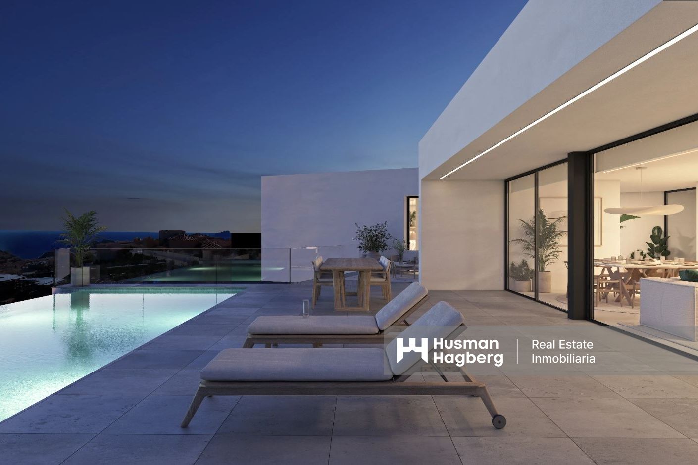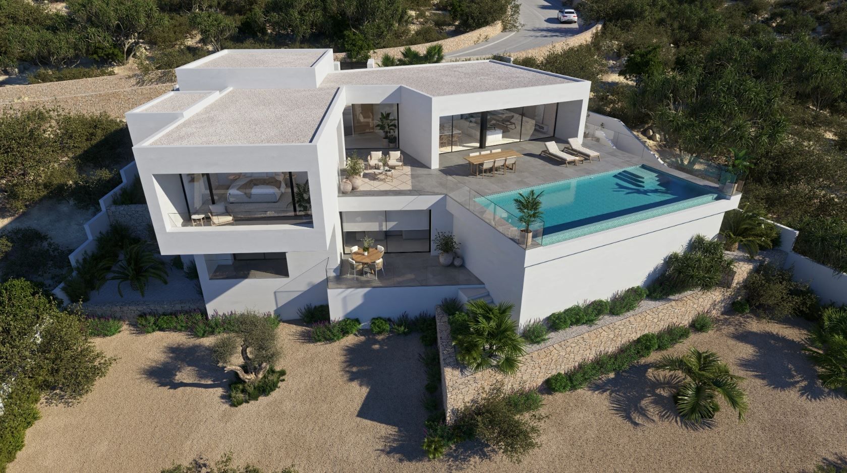 Invändigt är planlösningen elegant och funktionell. På huvudplanet finns ett modernt kök med central ö, sömlöst sammanfogat med mat- och vardagsrum som öppnar ut mot terrassen och infinitypoolen. På samma plan ligger mastersviten, med eget badrum och privat terrass där man i lugn och ro kan njuta av vyerna och dagsljuset. På nedre våningen finns två ytterligare sviter, var och en med eget badrum och egen terrass, samt ett mysigt loungeutrymme perfekt för avkoppling eller läsning.