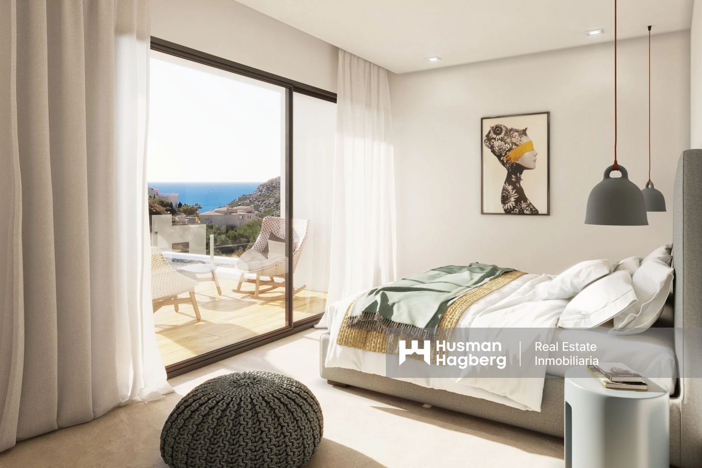 Interiören präglas av ett rymligt vardagsrum och matplats i öppen planlösning med stora fönster som fyller hemmet med naturligt ljus och leder direkt ut till terrassen och infinitypoolen, vilket skapar en sömlös övergång mellan inne och ute. Köket, utrustat med högklassiga vitvaror, är både stilrent och funktionellt – perfekt för både vardag och underhållning. Sovrummen är ljusa och eleganta, alla med terrassaccess. Mastersviten erbjuder en walk-in-garderob och ett lyxigt badrum, utformat som en fristad med panoramavy över havet.