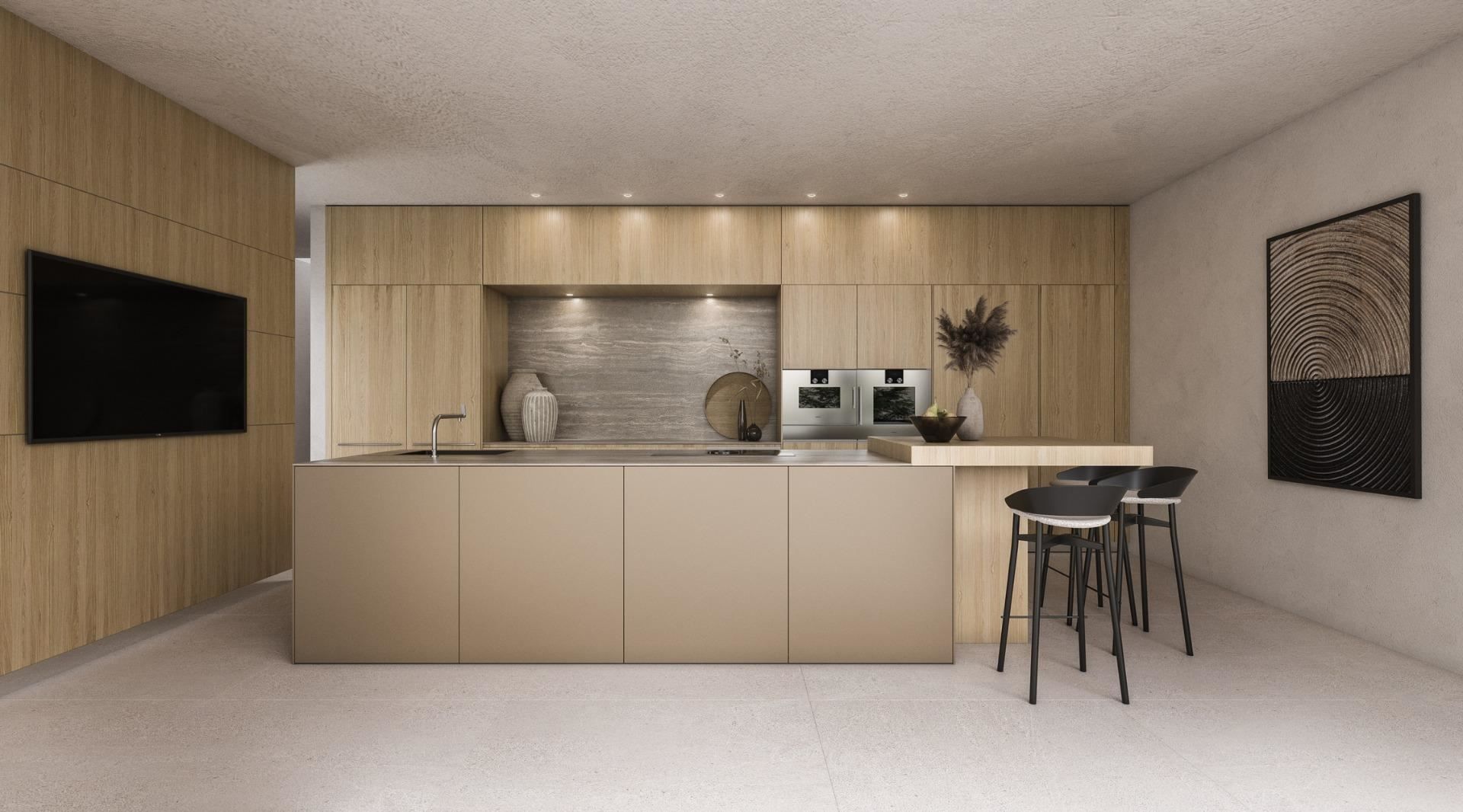 Den har 4 sovrum och ett eget omklädningsrum. Det fullt utrustade köket har en stor central ö och direkt tillgång till uteserveringen, med ett angränsande servicekök. Från denna nivå kan du njuta av olika täckta och otäckta verandor, med olika avkopplingsområden bredvid den vackra poolen, inklusive en grillplats. Källare med spelrum, vinkällare och ett garage med plats för 3-4 bilar. Villan har en andra källarvåning med ett stort gym, ångbad och biografrum.