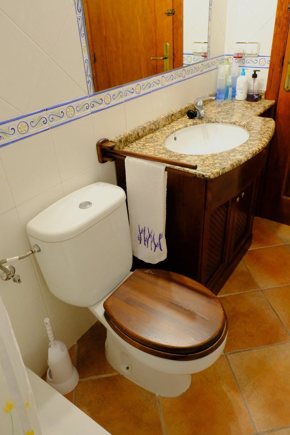 Tre badrum och en gästtoalett, ett av badrummen är utrustat med ett hörnbadkar, toalett, bidé och handfat med kommod.