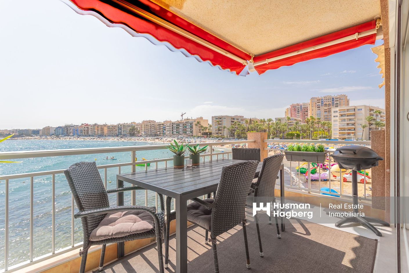 På första raden vid den glittrande Los Locos-stranden i Torrevieja väntar denna exceptionella hörnlägenhet – ett hem där havet alltid är närvarande och varje fönster ramar in en vykortsvy. Här bor du med panoramautsikt över det blå Medelhavet från alla rum och med en privat ingång som leder dig direkt ut på sanden.