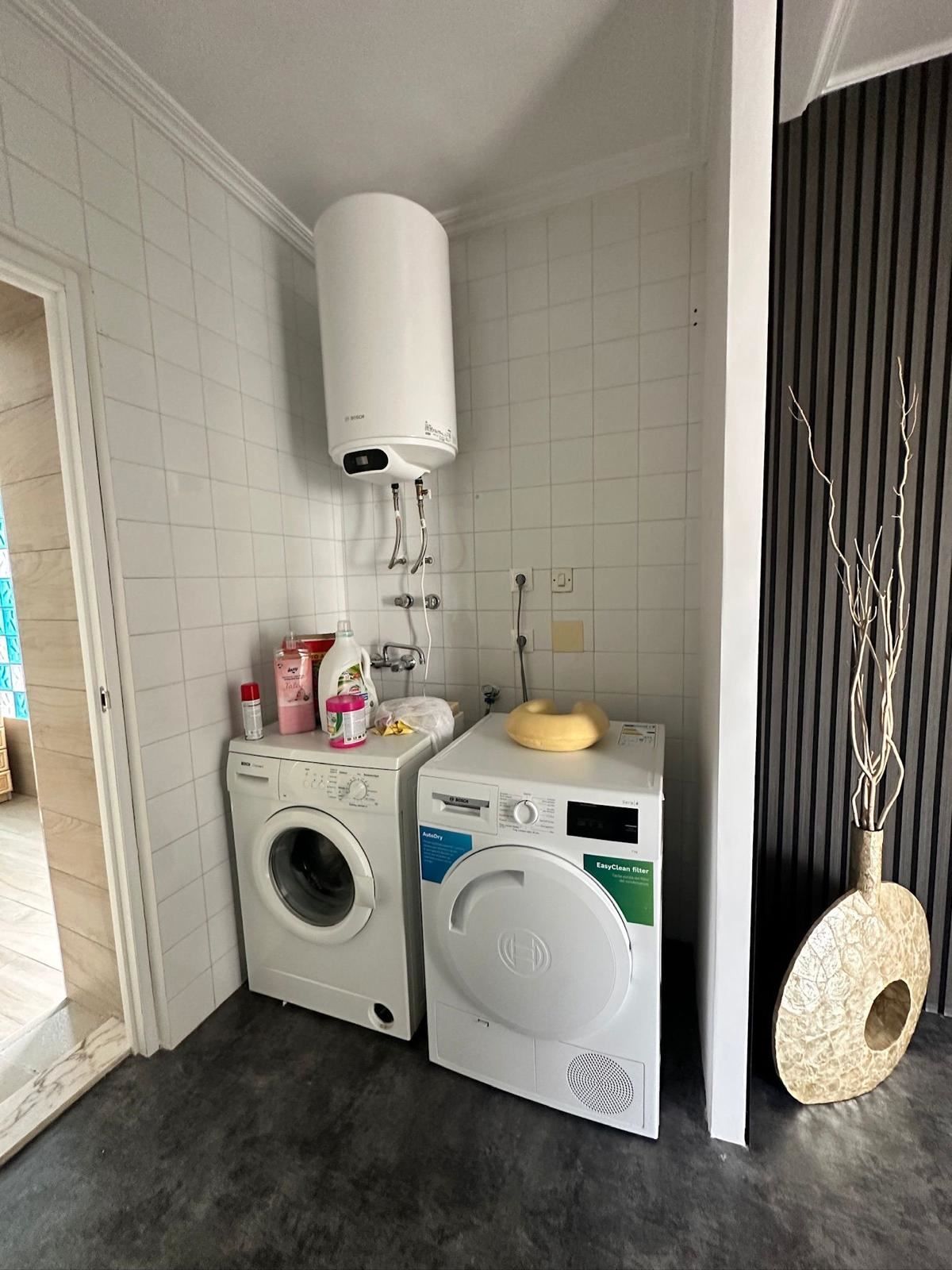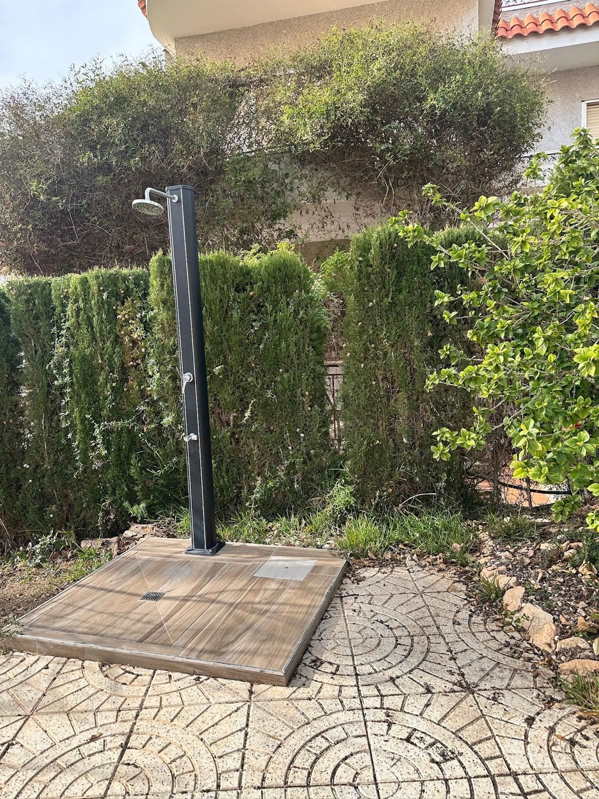 Tomten på 1 000 kvadratmeter är omsorgsfullt anlagd med planteringar, gräspartier och stenlagda gångar. Den privata poolen ramas in av solterrasser, medan trädgårdens grönska skapar en känsla av avskildhet. Här finns även garage, förråd och generös förvaring med platsbyggda garderober.