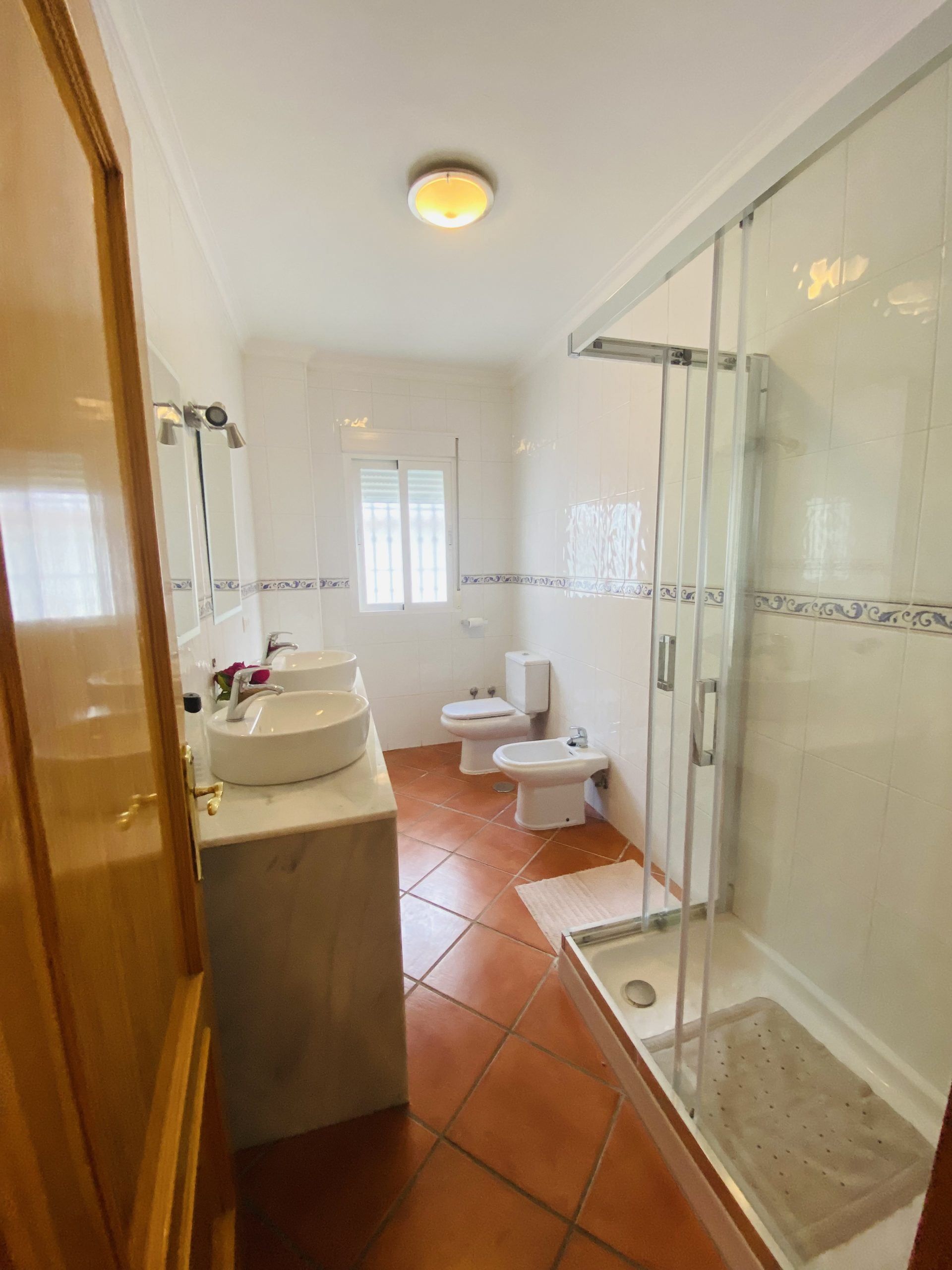 Villan består av ett stort ljust vardagsrum med öppen spis, ett modernt och fullt utrustat kök, tre dubbelrum och två vackra badrum. Huset har totalrenoverats med omsorg. Varje sovrum har ett omklädningsrum och radiatorer.