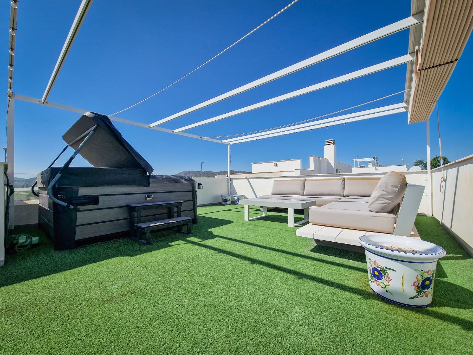 Utomhus väntar en privat pool på 3 x 6 meter, perfekt för svalkande dopp under varma dagar, och ett solarium med jacuzzi där du kan koppla av med panoramavy över omgivningen. Den stilfulla trädgården med konstgräs och solskydd på både terrassen och solariumet skapar en harmonisk oas att njuta av året runt.