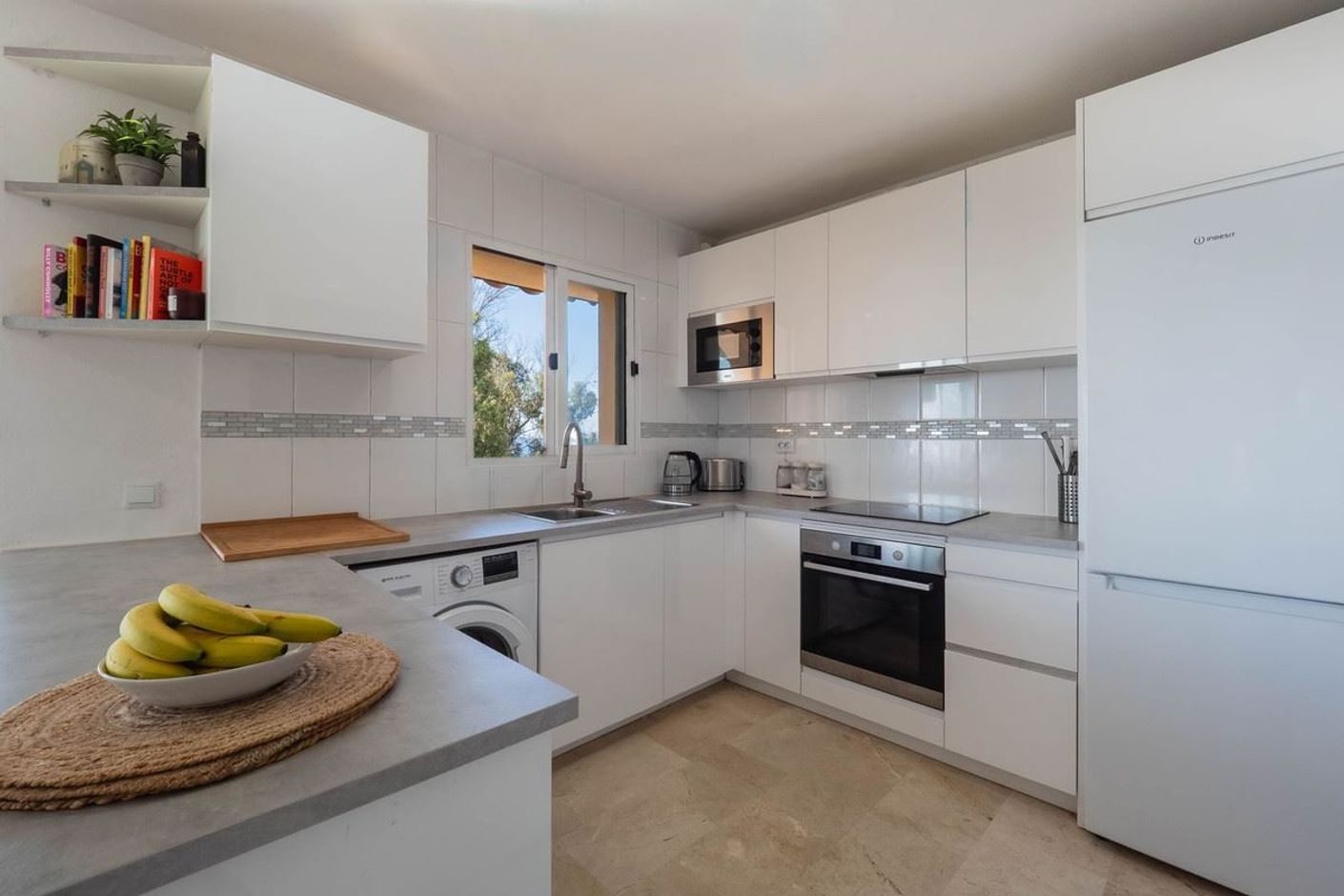 Det ljusa vardagsrummet med matplats och öppen spis övergår sömlöst i en täckt terrass med skjutbara glasdörrar – den perfekta platsen att njuta av den magnifika utsikten över Medelhavet. De två rymliga sovrummen har inbyggda garderober, och båda badrummen är stilrent renoverade i modern design.