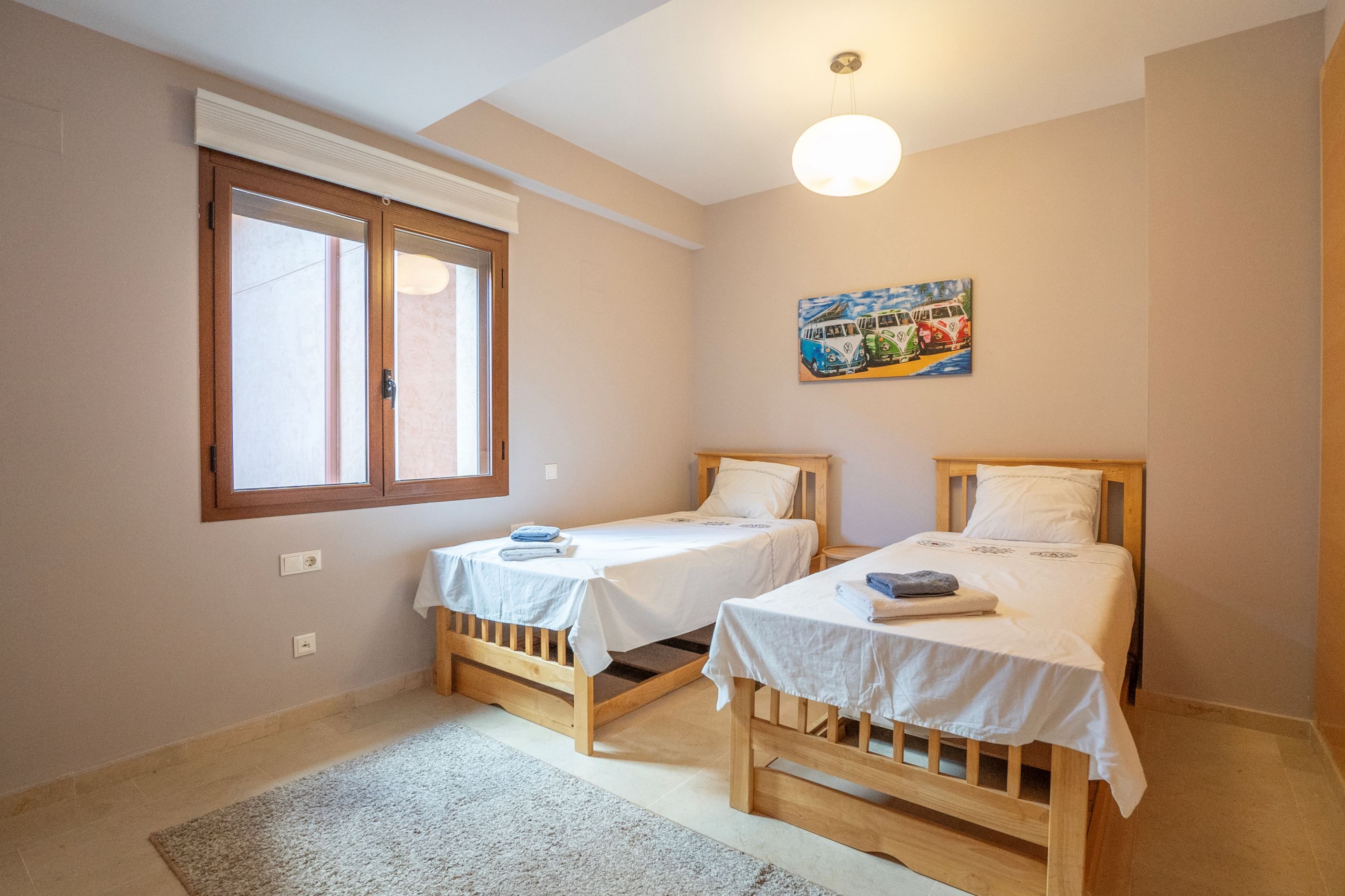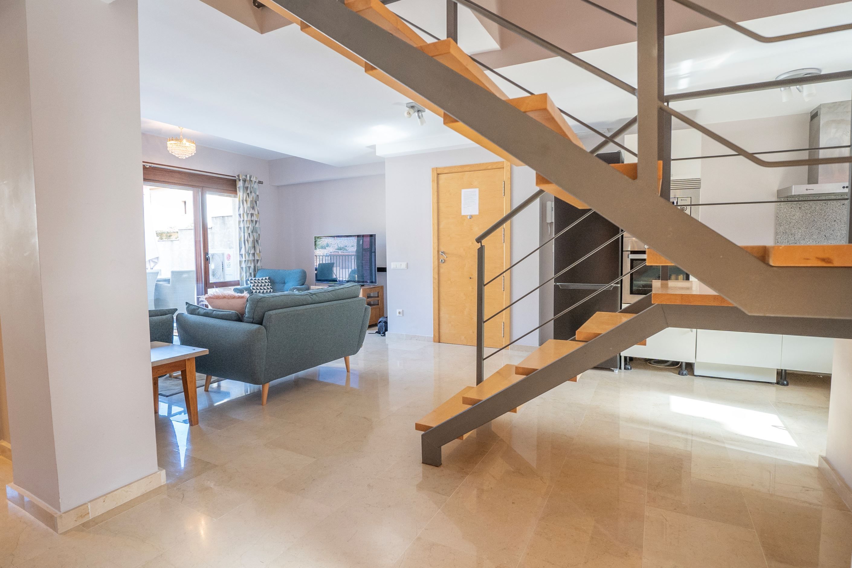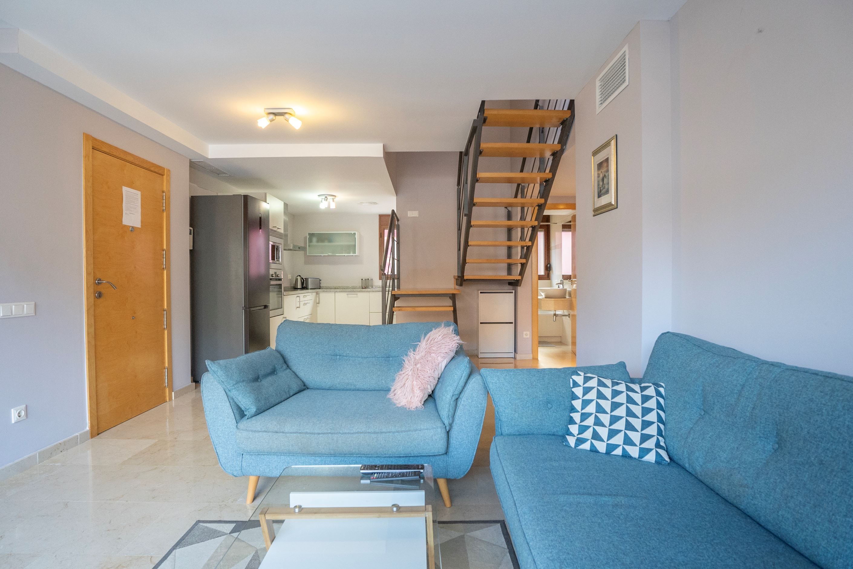 Interiören består av ett öppet kök, ett ljust och rymligt vardagsrum, två sovrum med inbyggda garderober och två badrum, varav ett en suite. Från vardagsrummet finns utgång till en stor terrass med fri utsikt. På övervåningen finns ett extra rum som kan användas som sovrum, kontor eller relaxavdelning, med tillgång till en privat terrass perfekt för att njuta av solen i avskildhet.