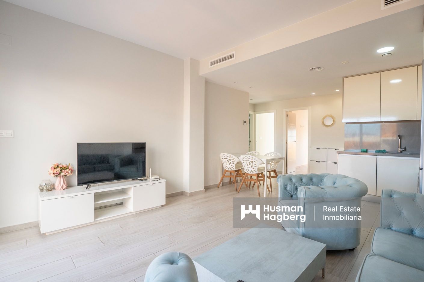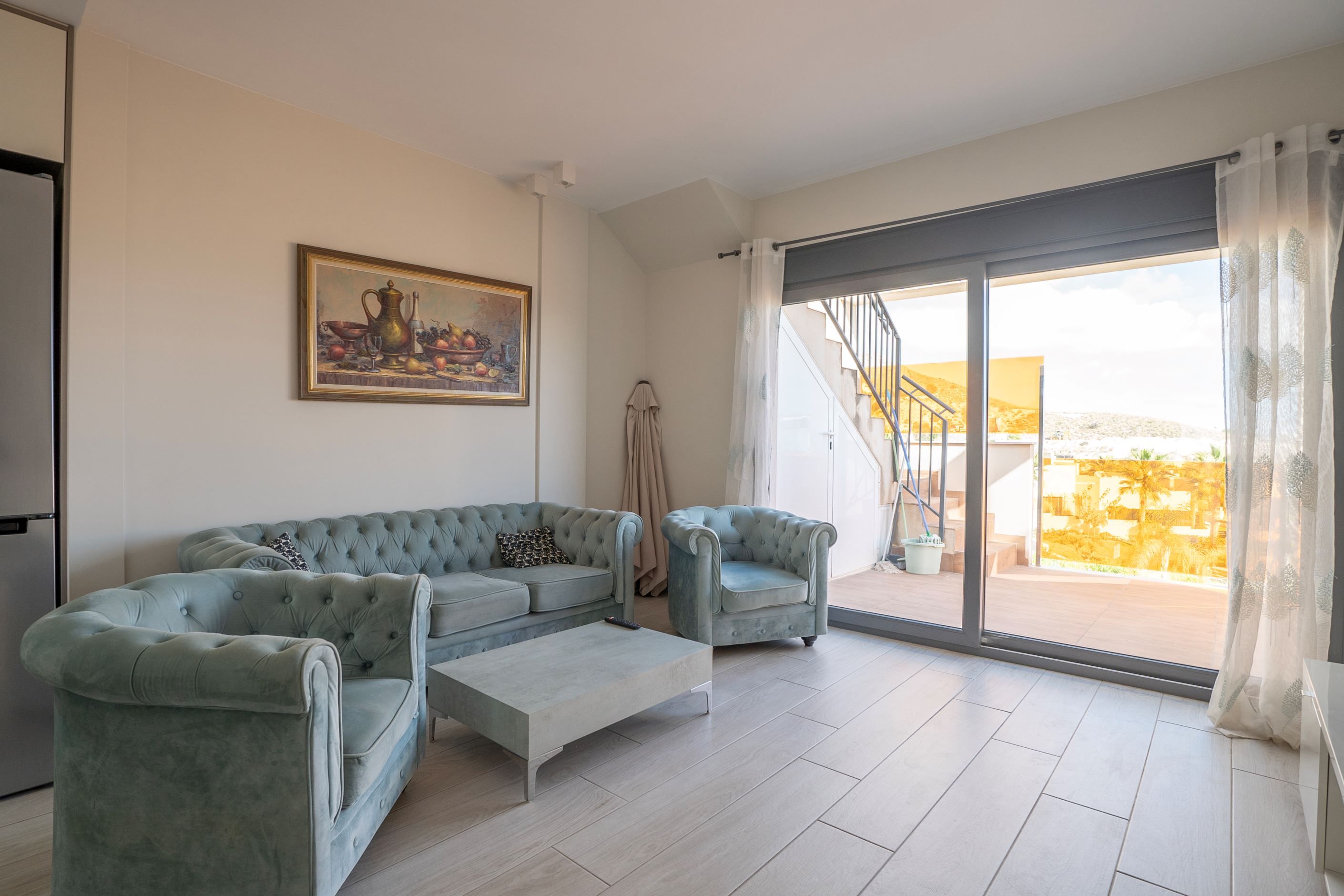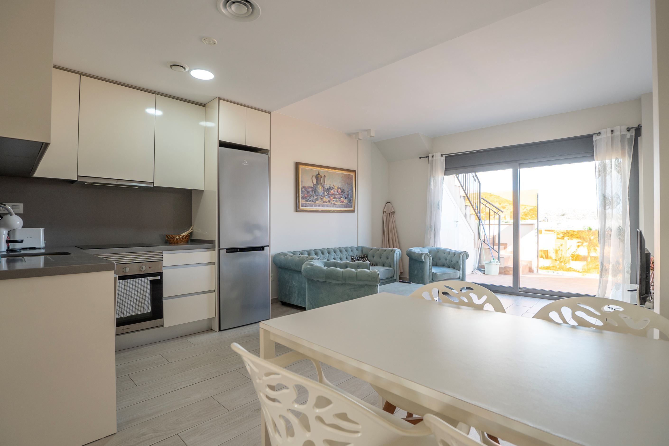 Lägenheten har en ljus och inbjudande atmosfär med fantastisk havs- och bergsutsikt från terrassen och den privata takterrassen. Den säljs fullt möblerad med vitvaror av hög kvalitet, inklusive tvättmaskin, ugn och golvvärme. De rymliga interiörerna och de eleganta materialen skapar ett hem som passar perfekt både för permanent boende och semester.