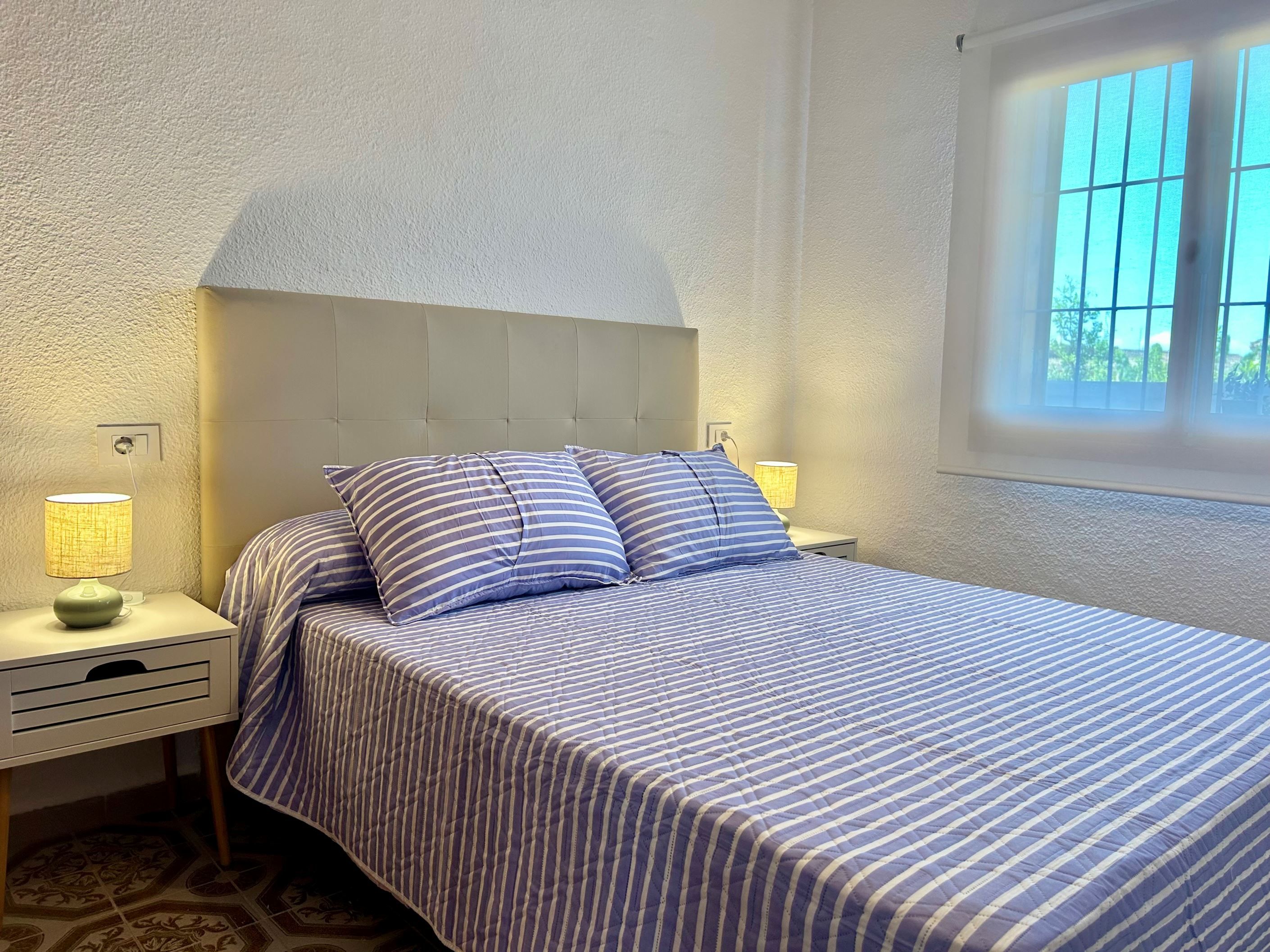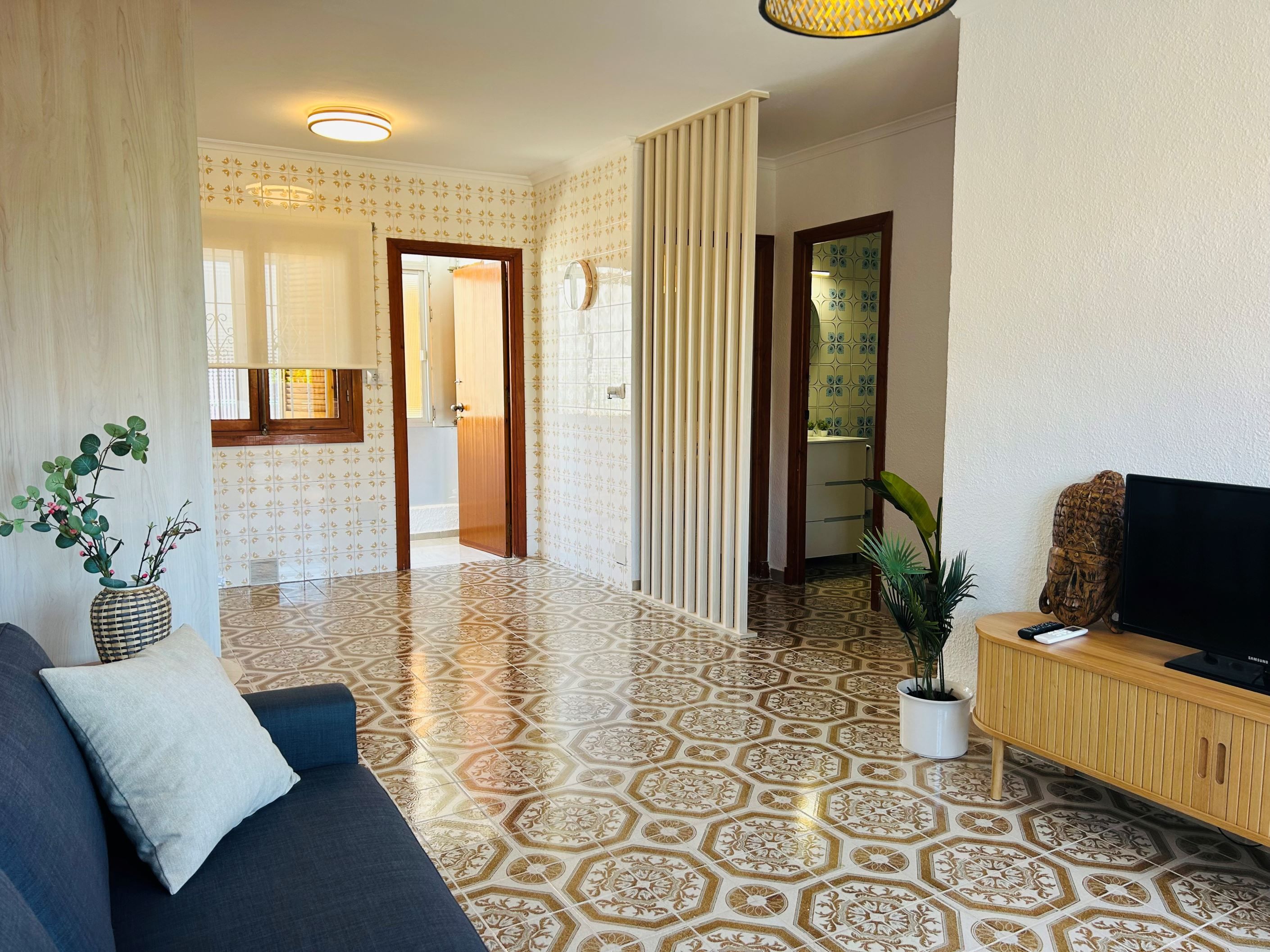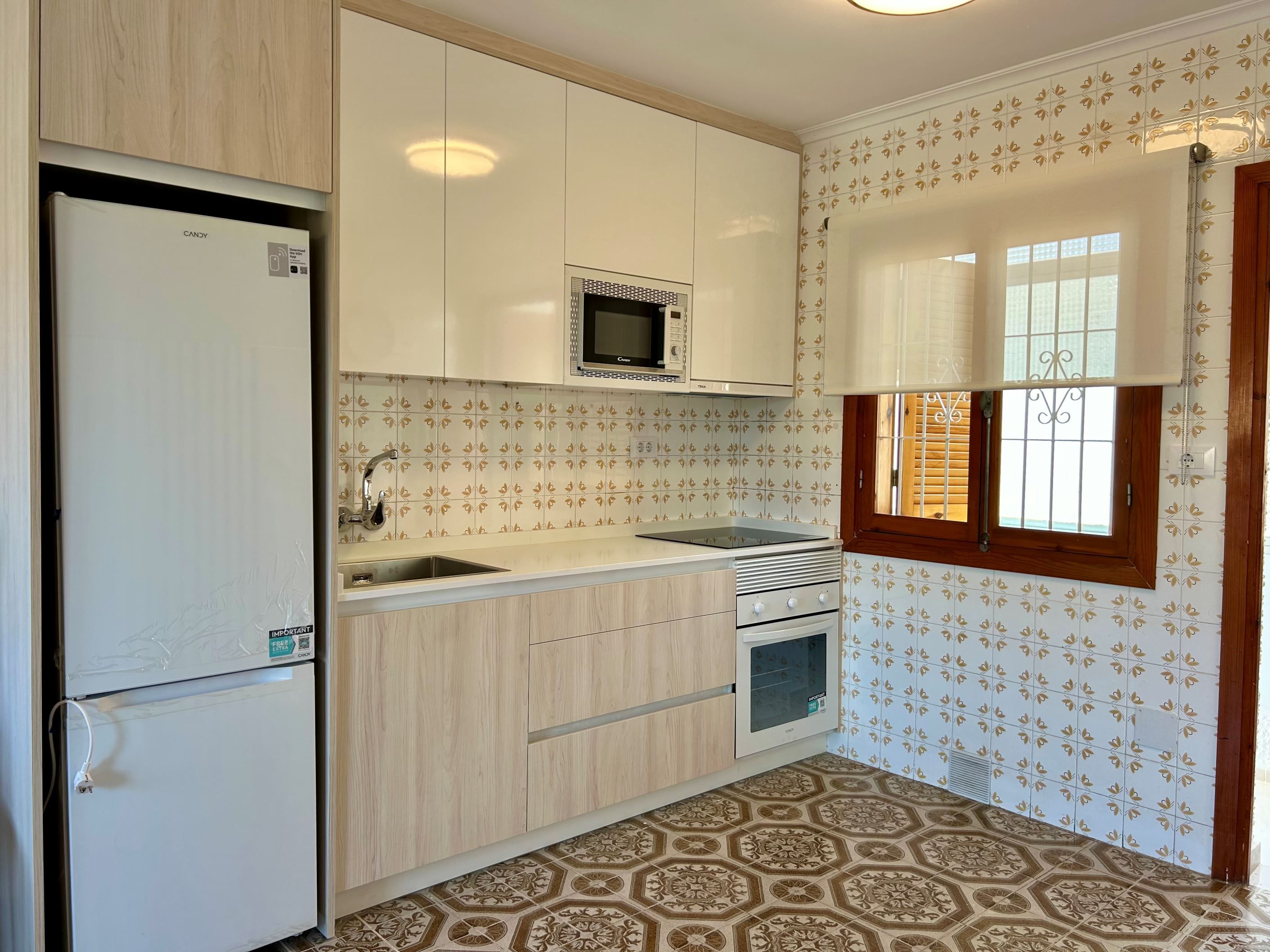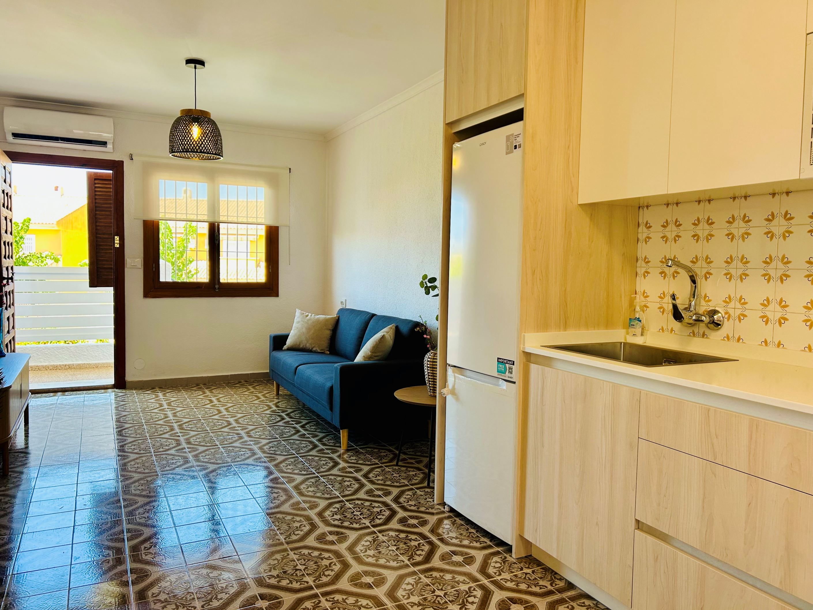 Bostaden erbjuder två sovrum – ett med en rymlig dubbelsäng och inbyggd garderob, och ett andra med en 105 cm säng – perfekt för både familj och gäster. Det generösa vardagsrummet är utrustat med luftkonditionering för både kyla och värme, och binds ihop med ett modernt, nyinstallerat kök fullt utrustat med helt nya vitvaror. Här finns också ett fräscht badrum med duschkabin, en sluten innergård för extra bekvämlighet och en solig terrass där du kan njuta av frukost i morgonsolen eller ljumma sommarkvällar.