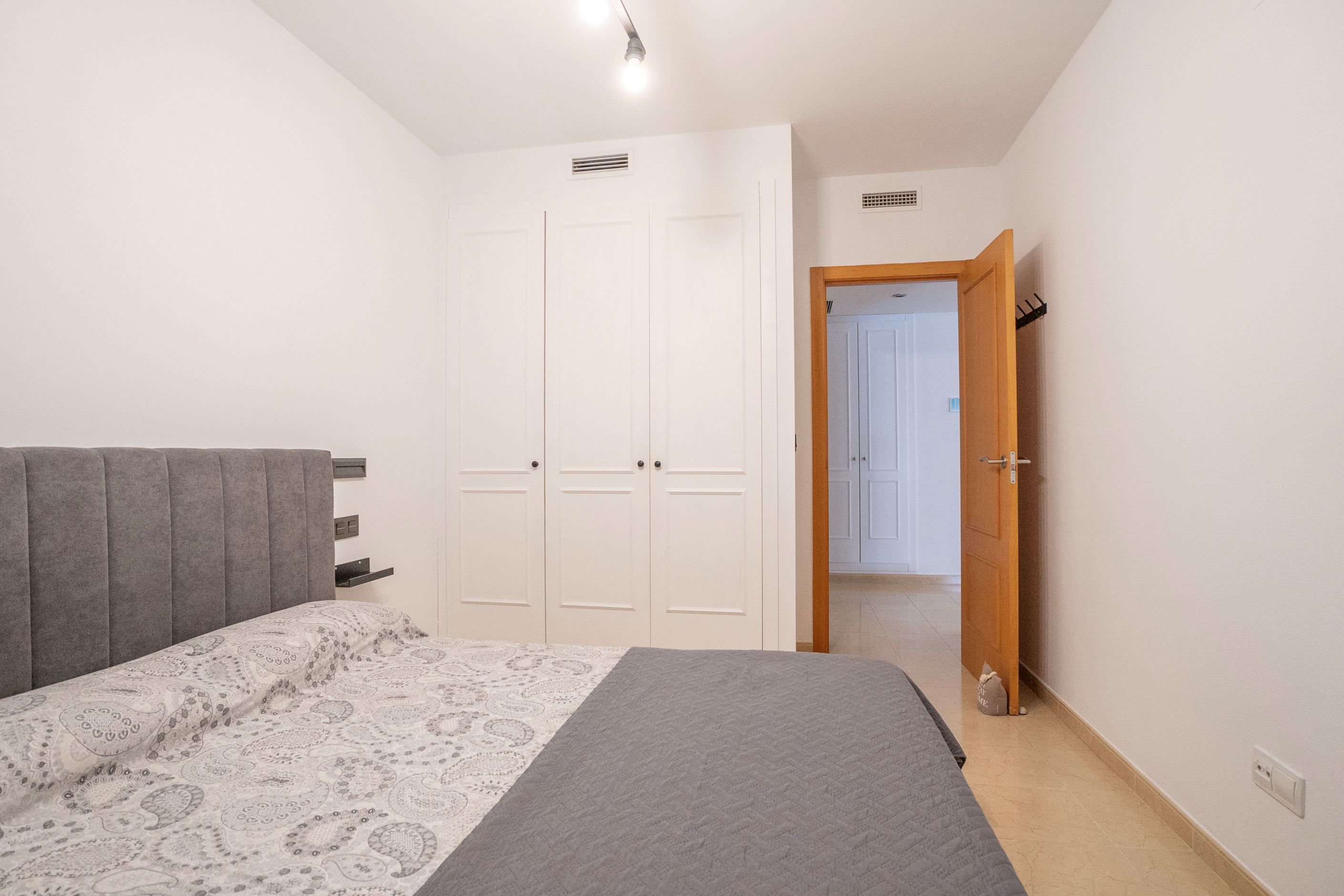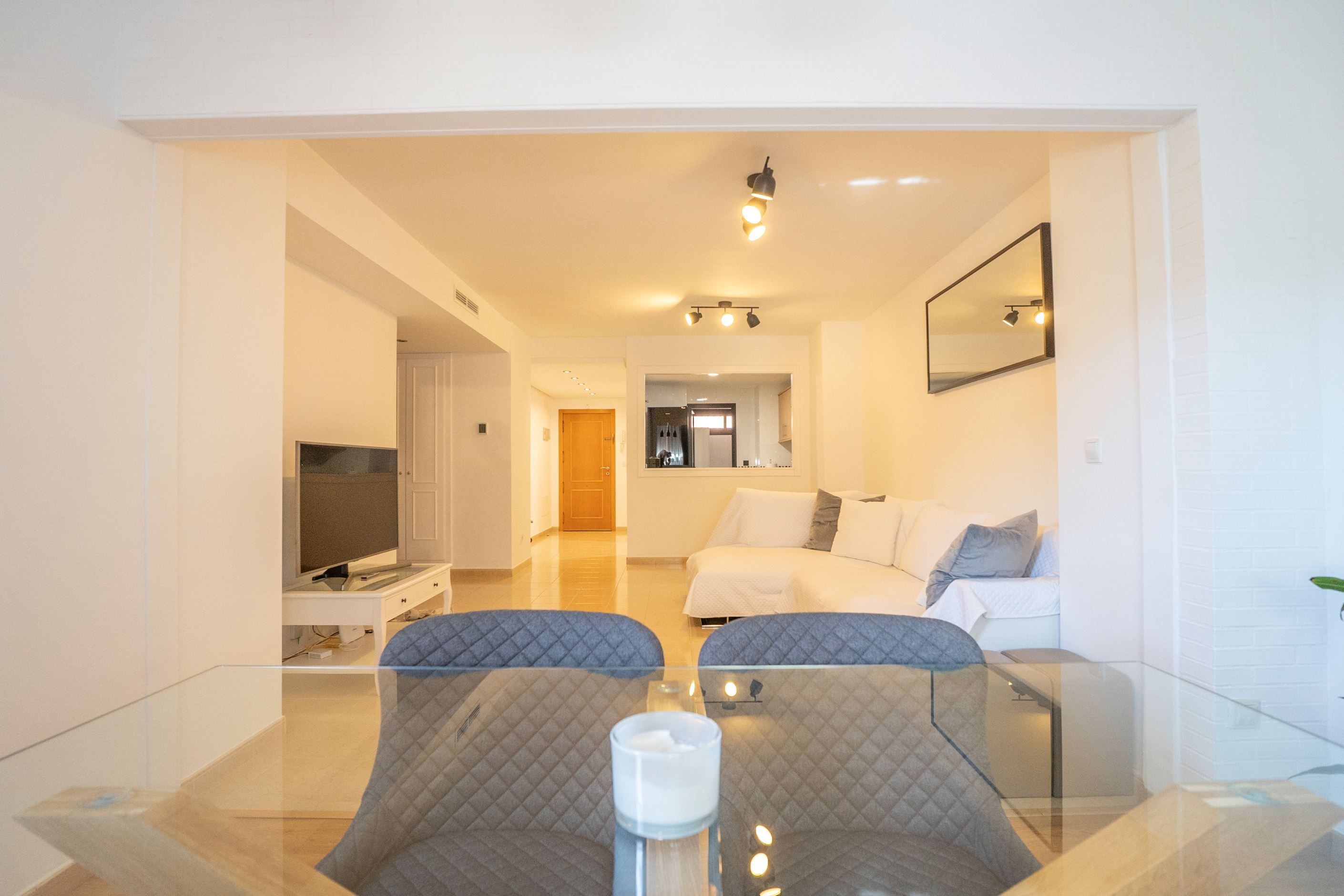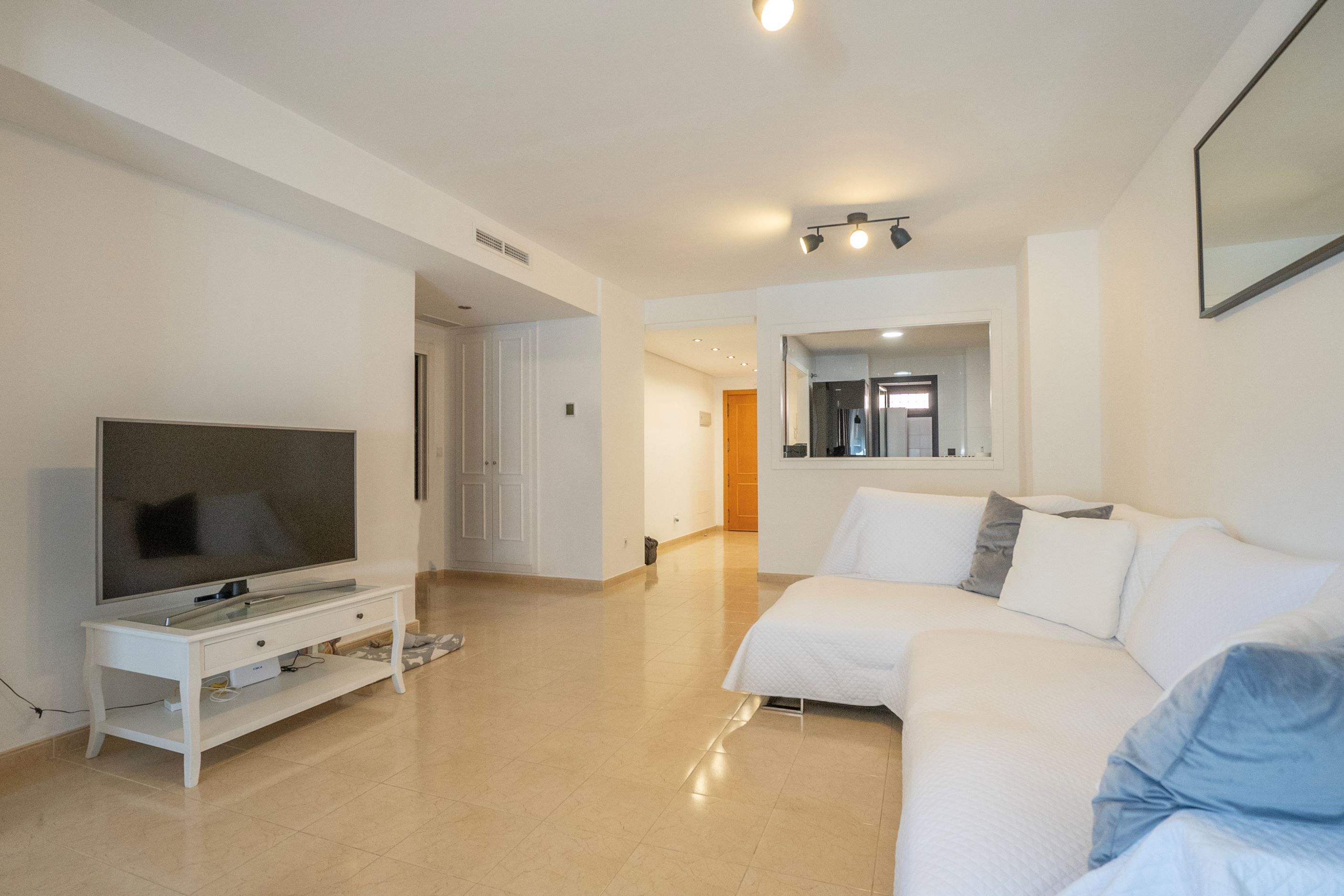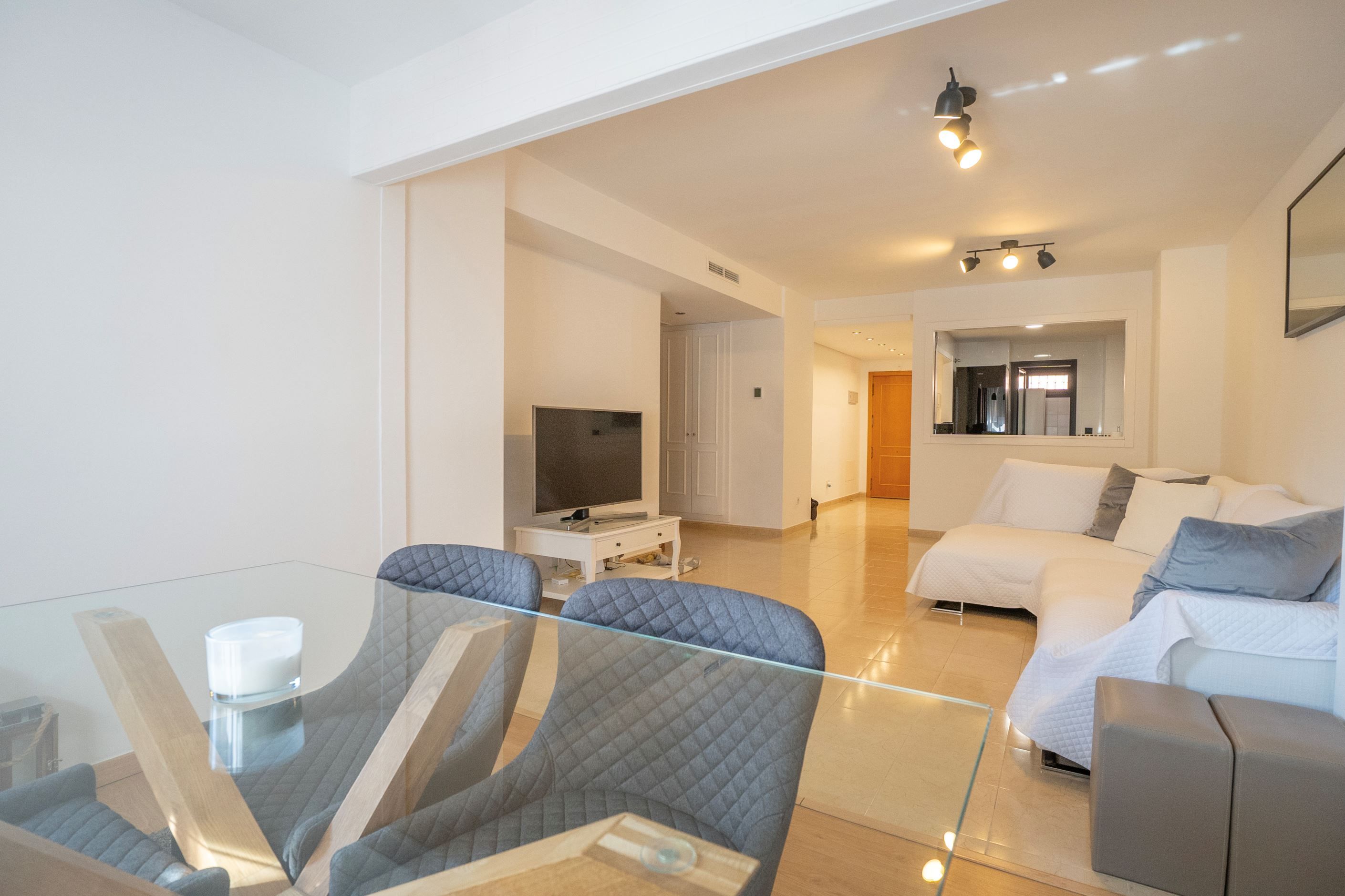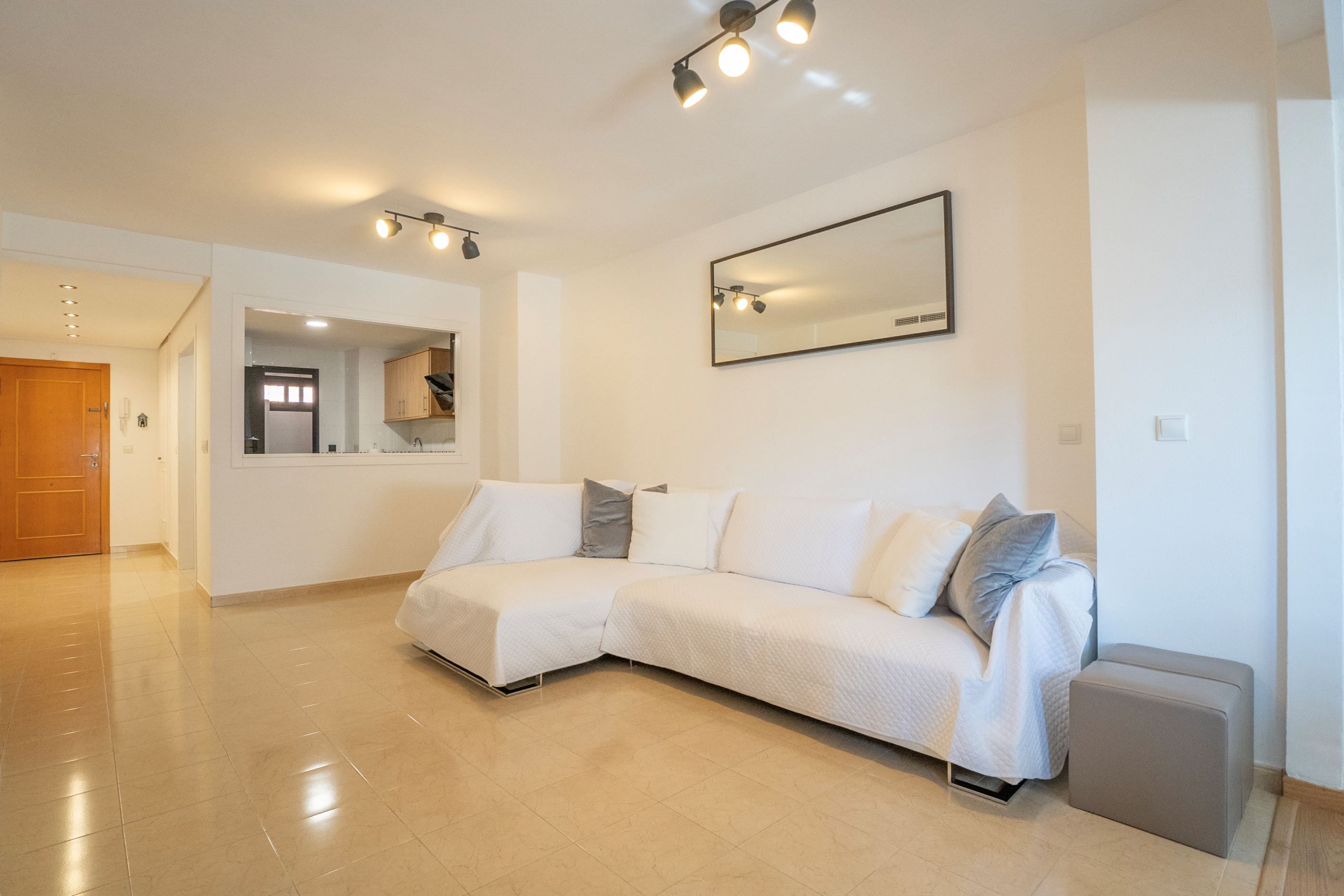 Lägenheten har nyligen renoverats och erbjuder 75 m² välplanerat boende. Den består av ett ljust sovrum med stora fönster och två inbyggda garderober, ett modernt badrum med dusch och ny VVS-installation, samt ett halvöppet, fullt utrustat kök med utgång till tvättstuga. Det rymliga vardagsrummet har sidoutsikt mot havet och Avenida Rosa de los Vientos och präglas av naturligt ljus och en varm atmosfär. Lägenheten har dessutom luftkonditionering (varm/kall luft) via kanaler, med en ny maskin värderad till 5 000 € och giltig garanti. Den sydostliga orienteringen ger solljus hela dagen och god genomströmning av luft.