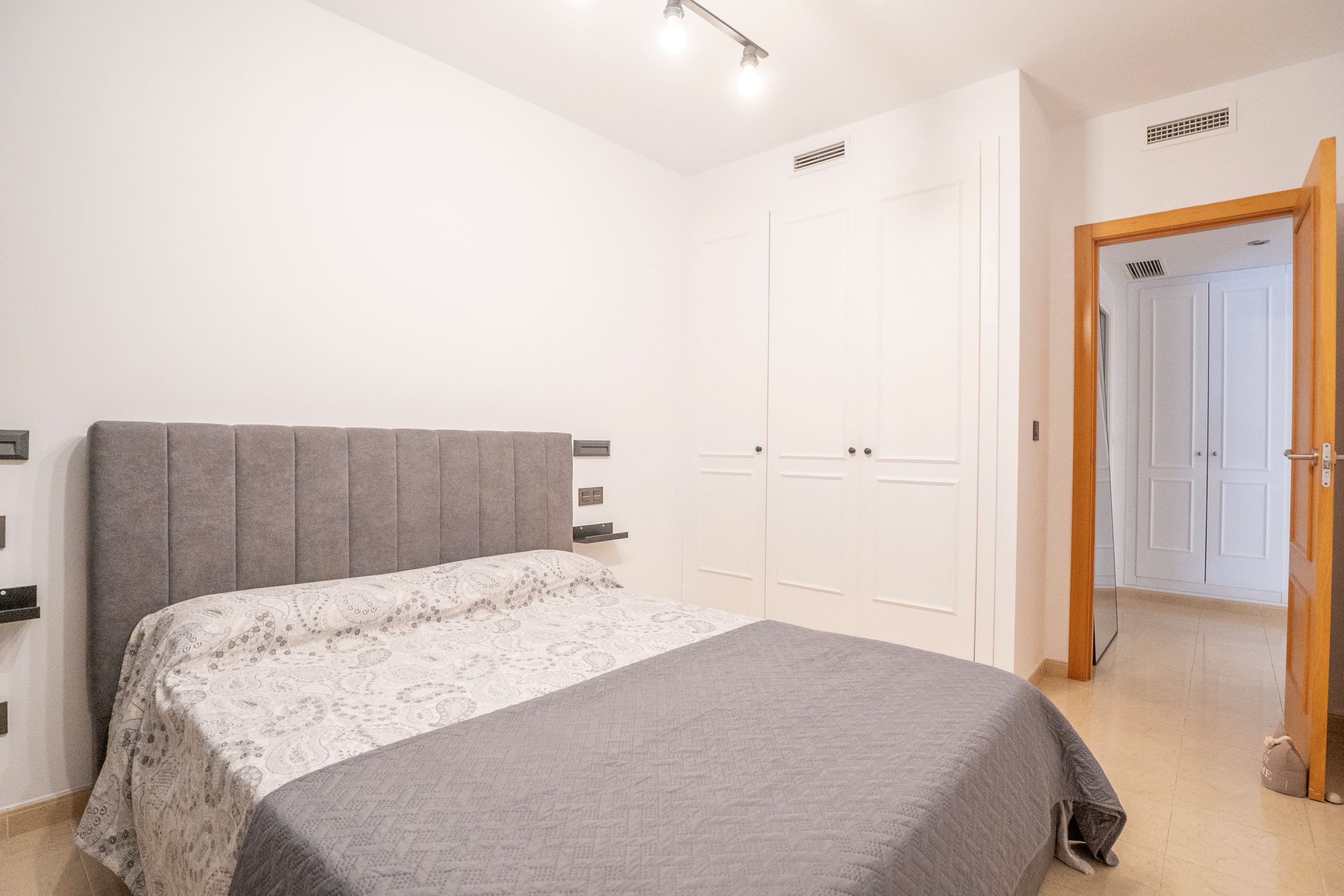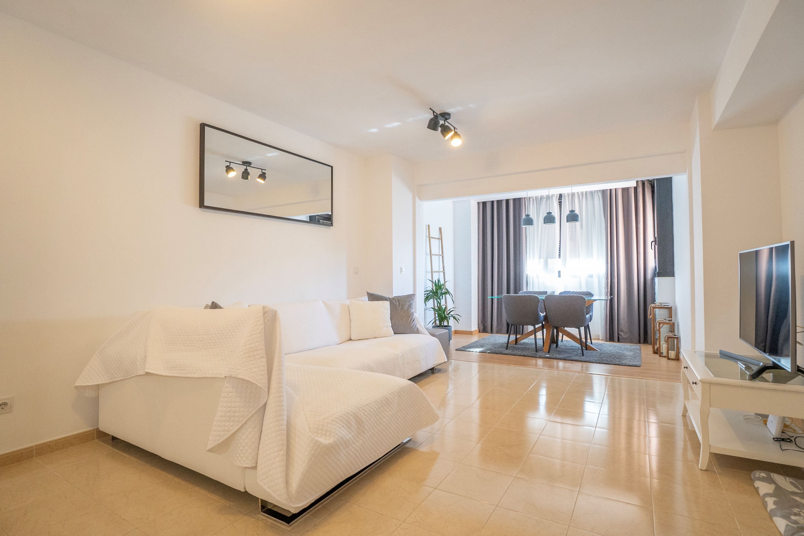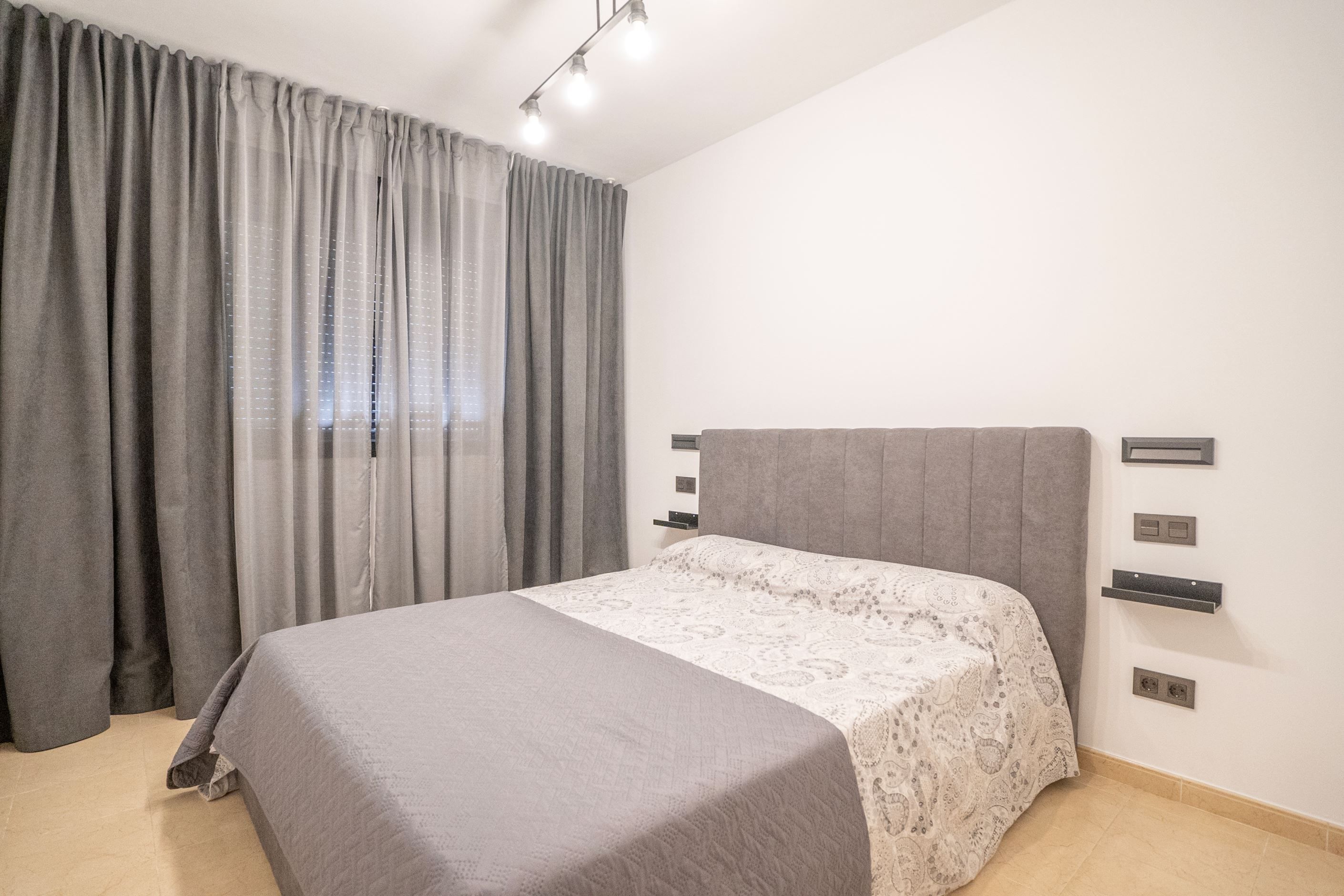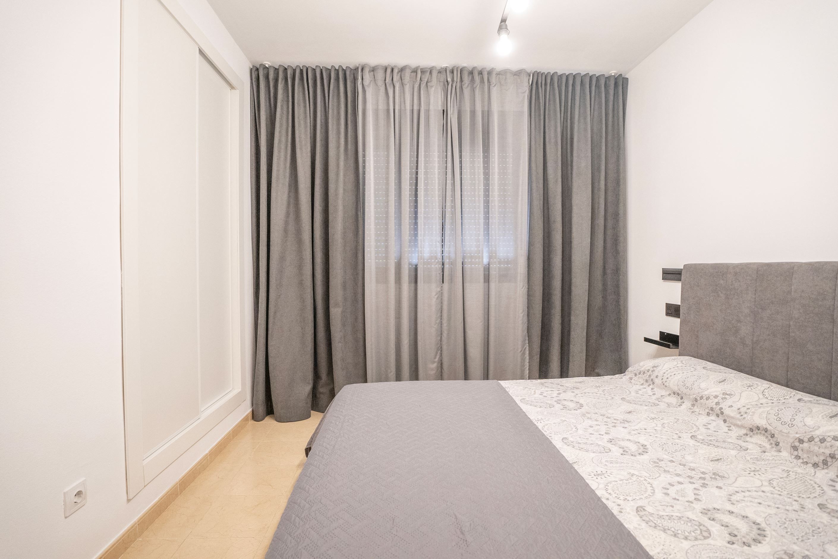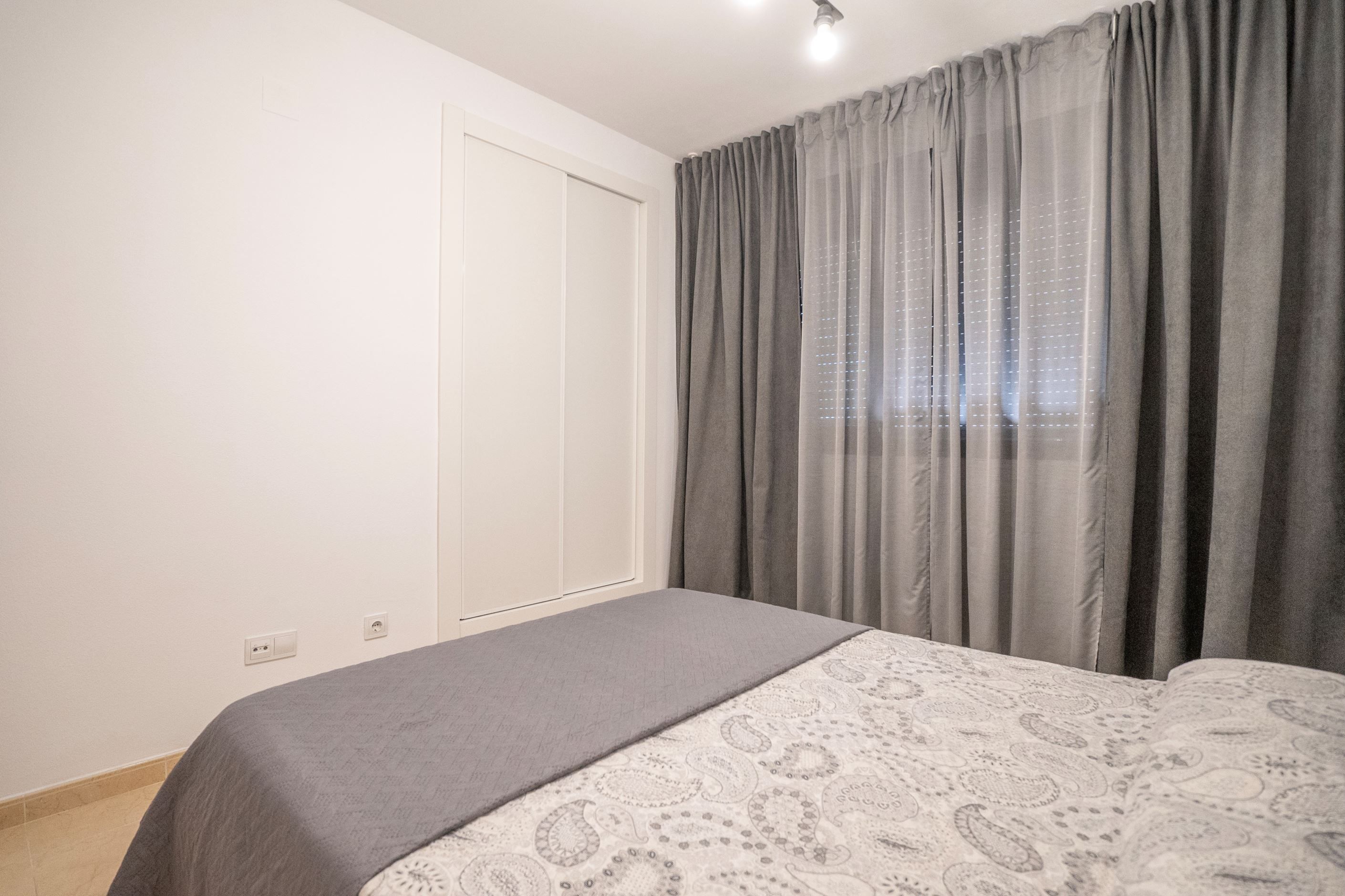 Lägenheten har nyligen renoverats och erbjuder 75 m² välplanerat boende. Den består av ett ljust sovrum med stora fönster och två inbyggda garderober, ett modernt badrum med dusch och ny VVS-installation, samt ett halvöppet, fullt utrustat kök med utgång till tvättstuga. Det rymliga vardagsrummet har sidoutsikt mot havet och Avenida Rosa de los Vientos och präglas av naturligt ljus och en varm atmosfär. Lägenheten har dessutom luftkonditionering (varm/kall luft) via kanaler, med en ny maskin värderad till 5 000 € och giltig garanti. Den sydostliga orienteringen ger solljus hela dagen och god genomströmning av luft.
