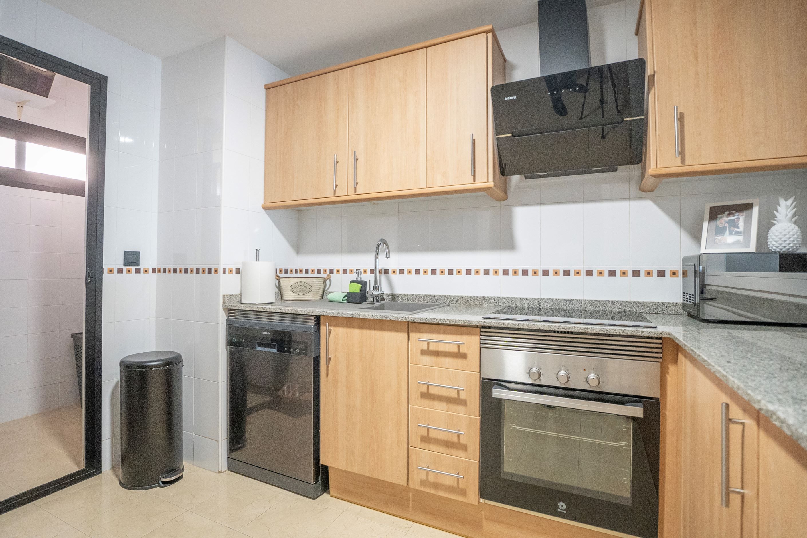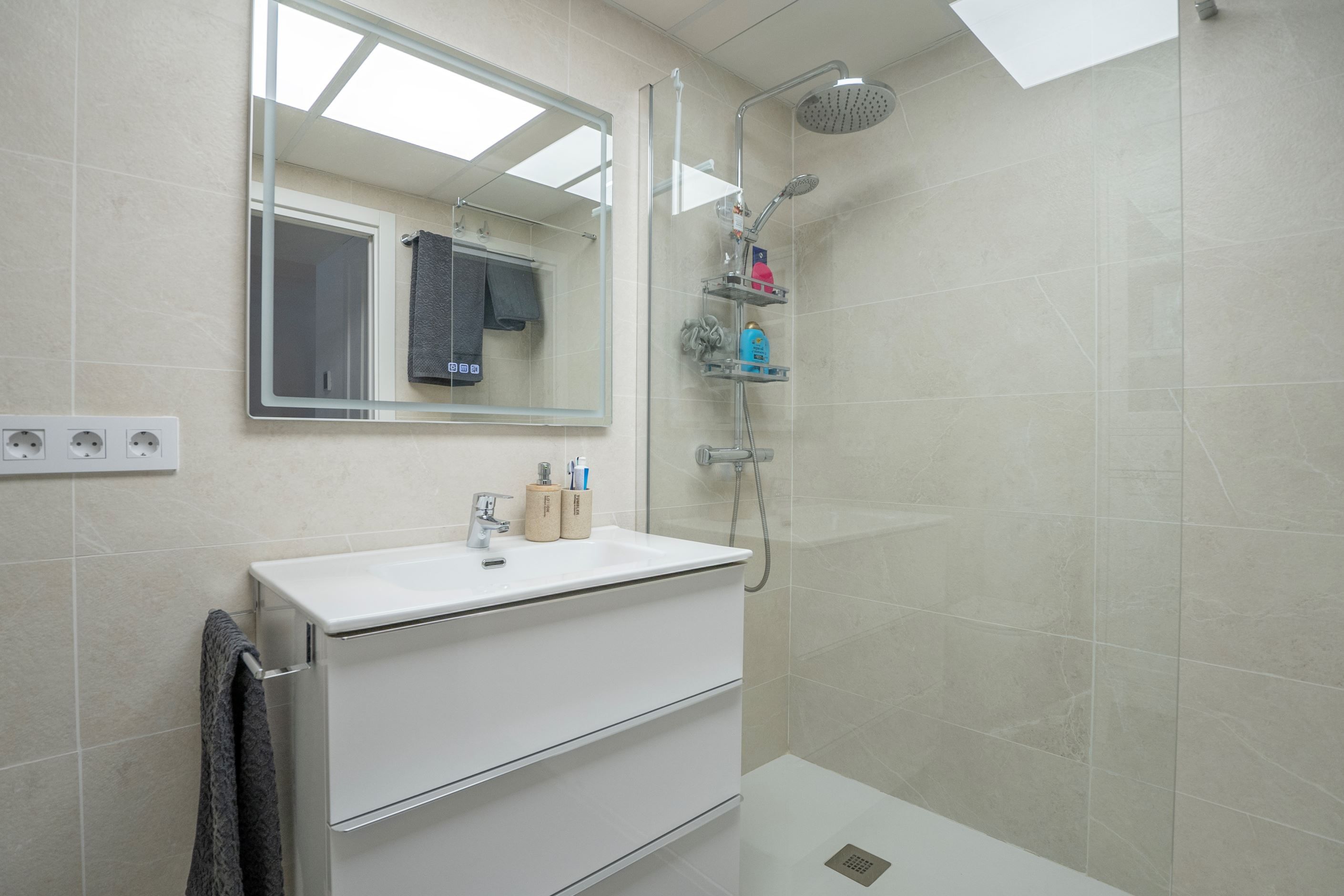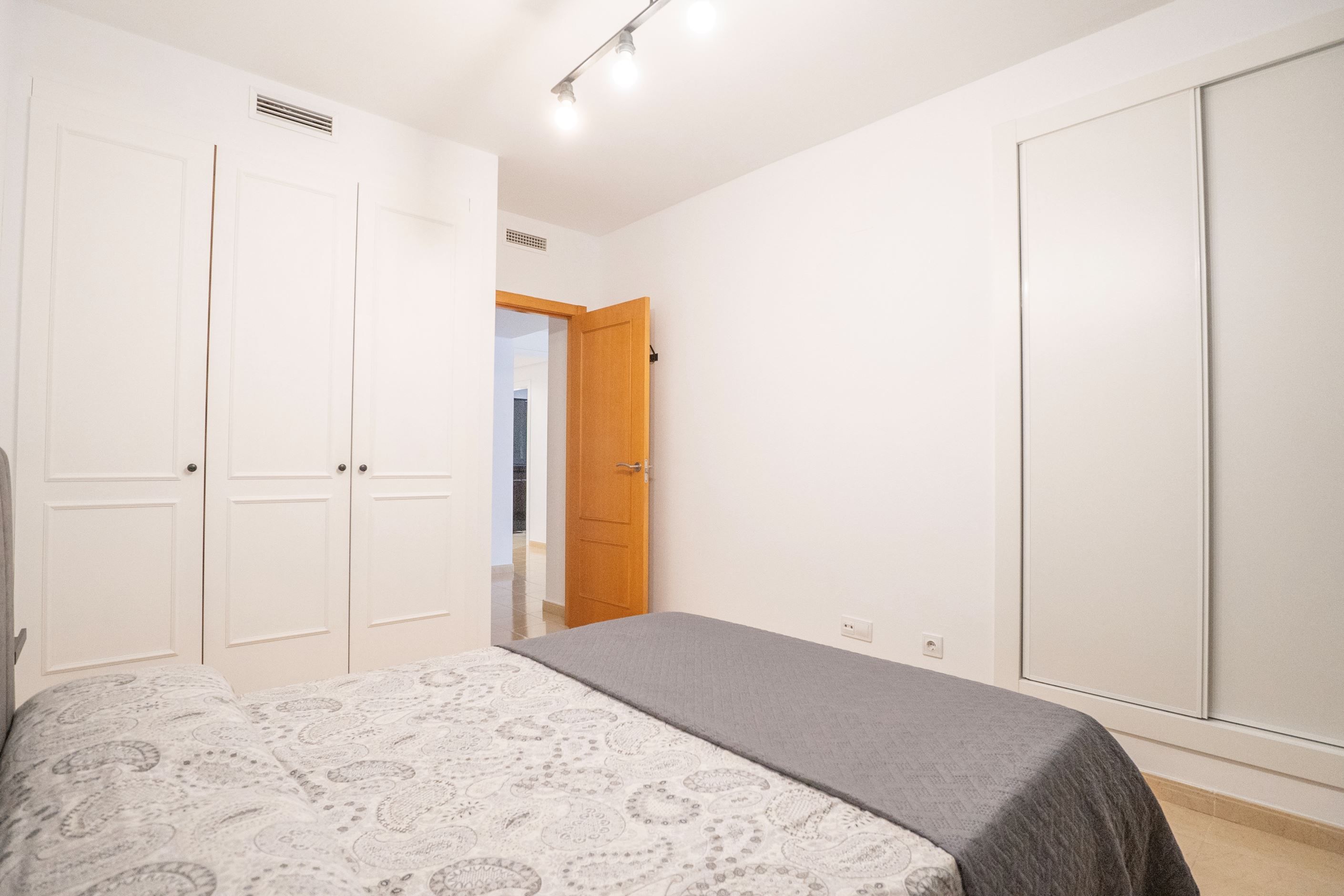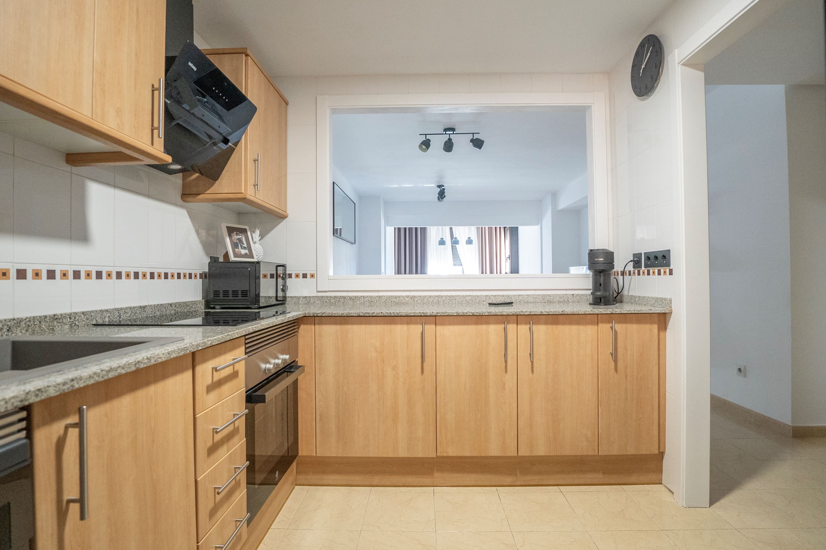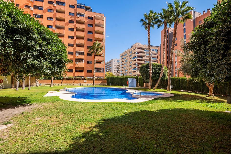 Lägenheten har nyligen renoverats och erbjuder 75 m² välplanerat boende. Den består av ett ljust sovrum med stora fönster och två inbyggda garderober, ett modernt badrum med dusch och ny VVS-installation, samt ett halvöppet, fullt utrustat kök med utgång till tvättstuga. Det rymliga vardagsrummet har sidoutsikt mot havet och Avenida Rosa de los Vientos och präglas av naturligt ljus och en varm atmosfär. Lägenheten har dessutom luftkonditionering (varm/kall luft) via kanaler, med en ny maskin värderad till 5 000 € och giltig garanti. Den sydostliga orienteringen ger solljus hela dagen och god genomströmning av luft.