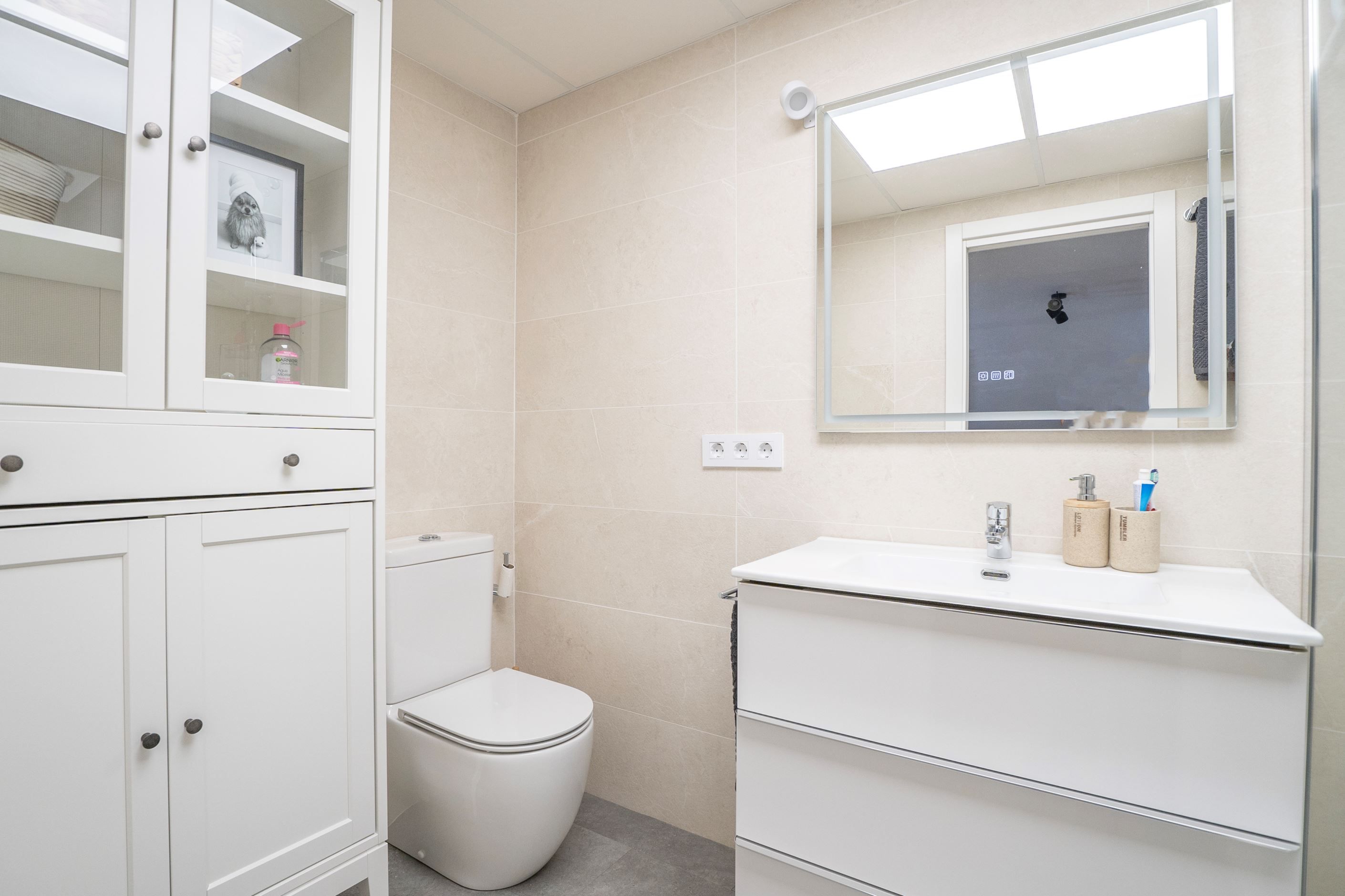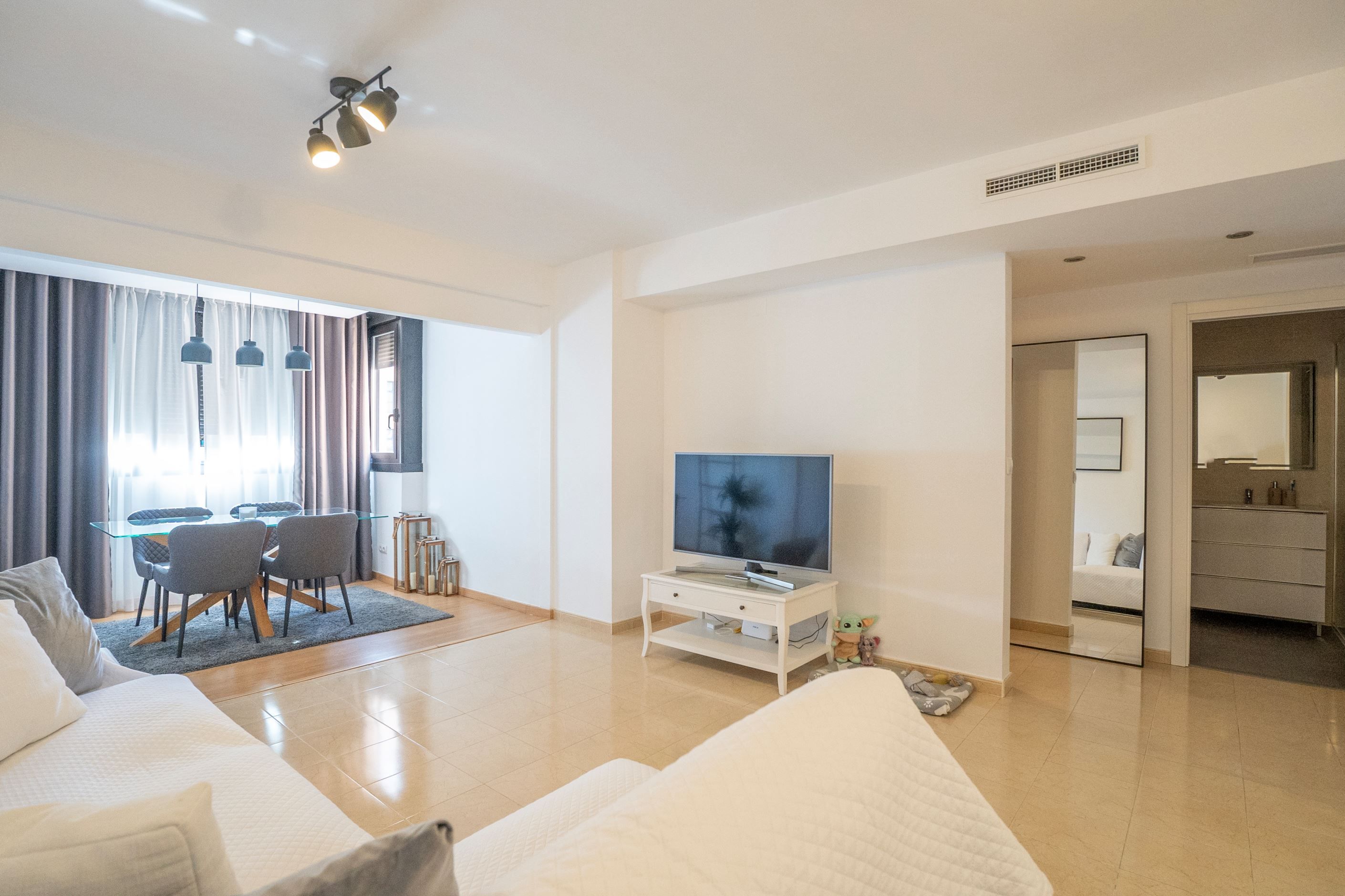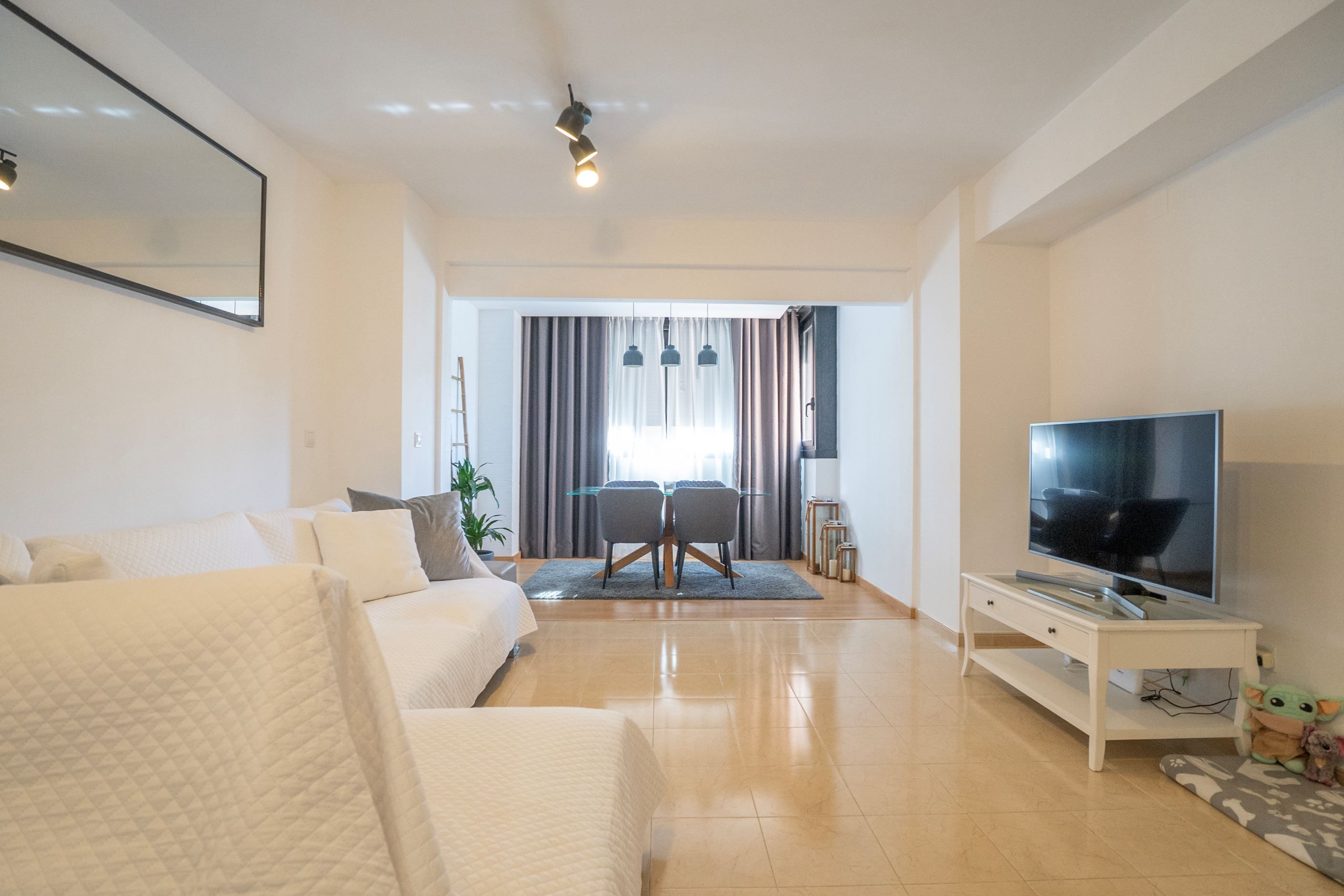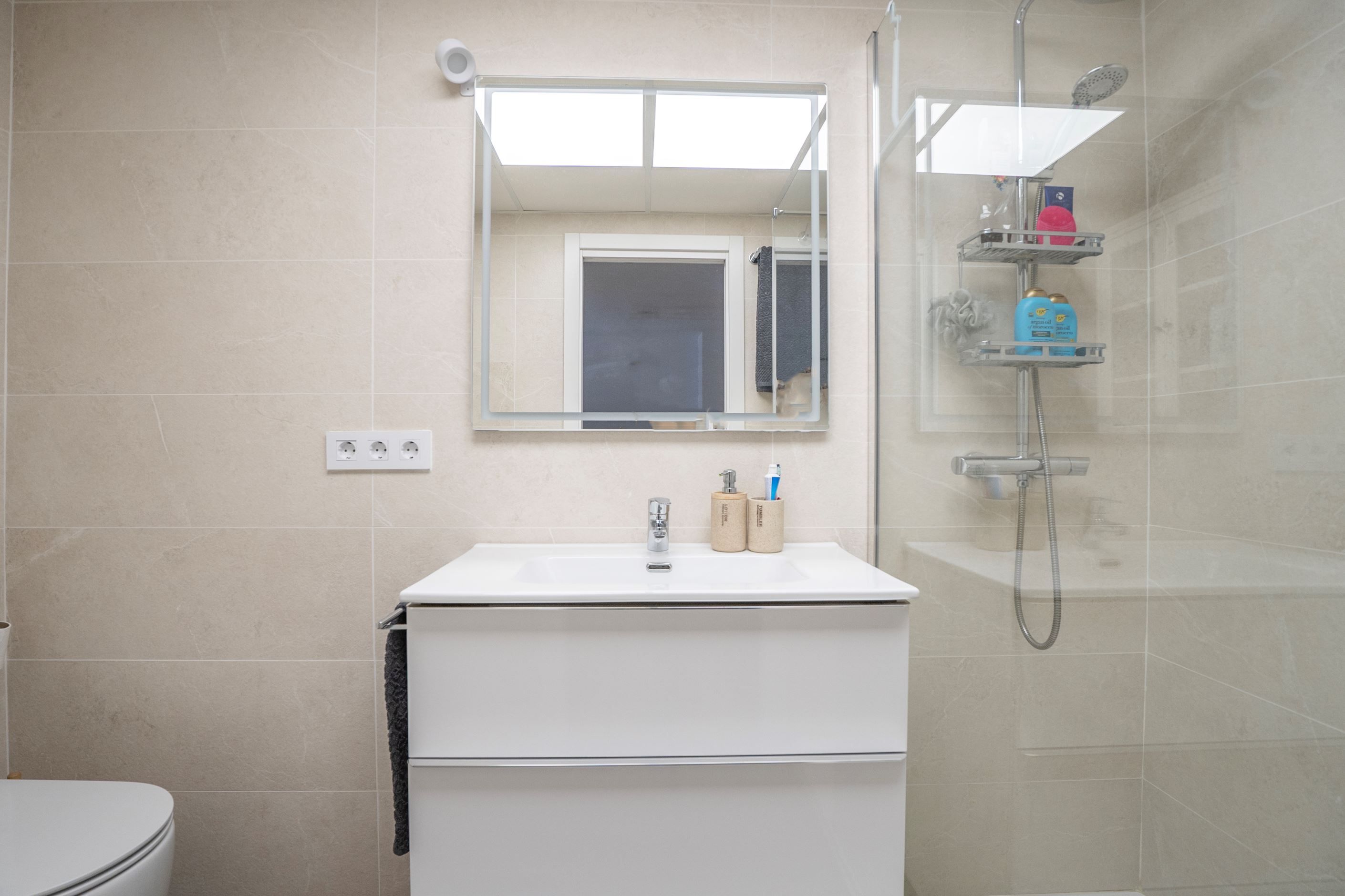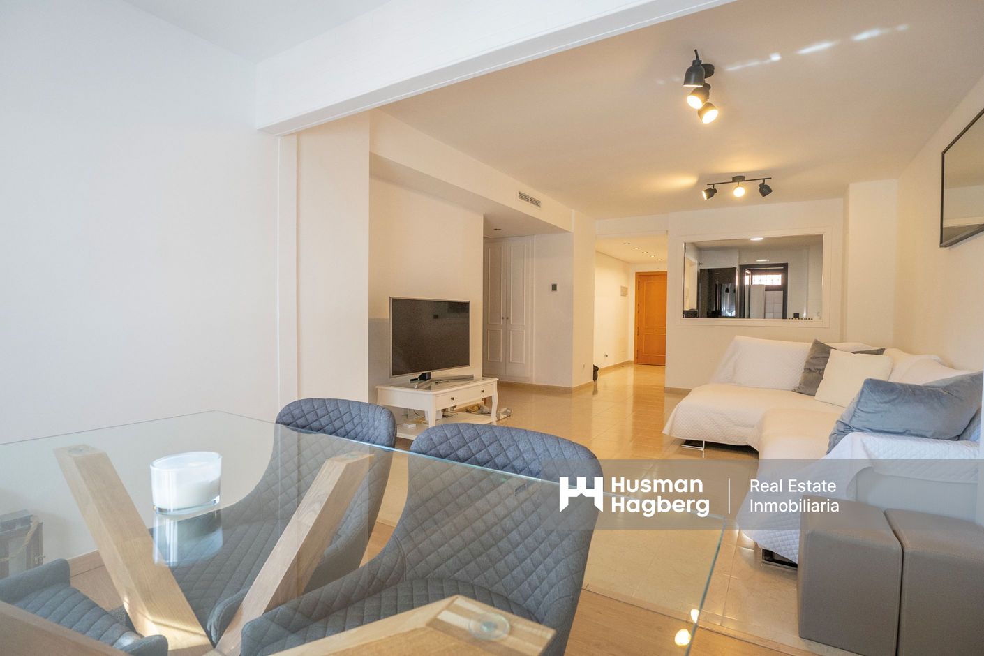 Lägenheten har nyligen renoverats och erbjuder 75 m² välplanerat boende. Den består av ett ljust sovrum med stora fönster och två inbyggda garderober, ett modernt badrum med dusch och ny VVS-installation, samt ett halvöppet, fullt utrustat kök med utgång till tvättstuga. Det rymliga vardagsrummet har sidoutsikt mot havet och Avenida Rosa de los Vientos och präglas av naturligt ljus och en varm atmosfär. Lägenheten har dessutom luftkonditionering (varm/kall luft) via kanaler, med en ny maskin värderad till 5 000 € och giltig garanti. Den sydostliga orienteringen ger solljus hela dagen och god genomströmning av luft.