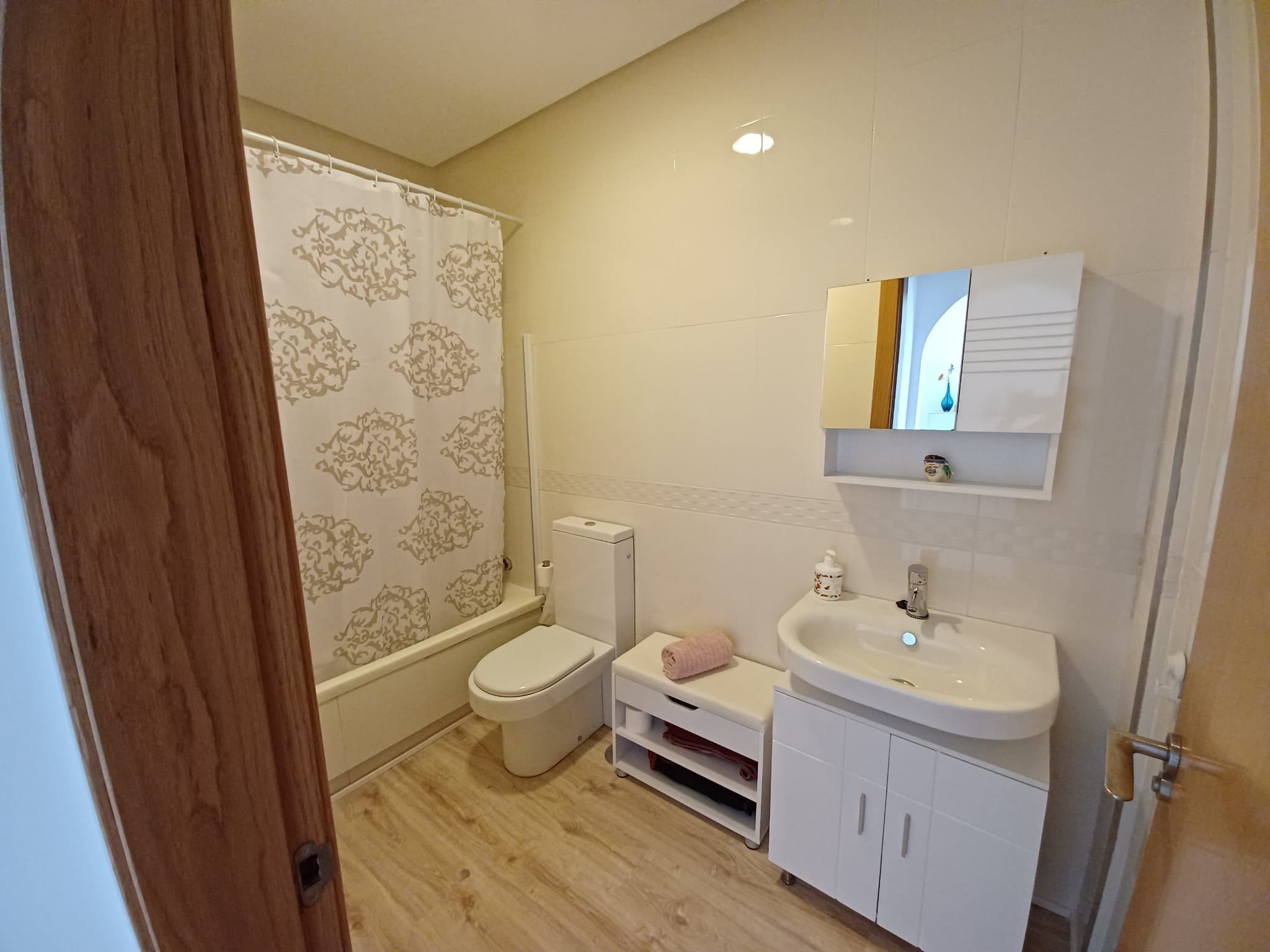 Badrummet har en ljus färgskala och är utrustat med toalett, handfat och badkar.