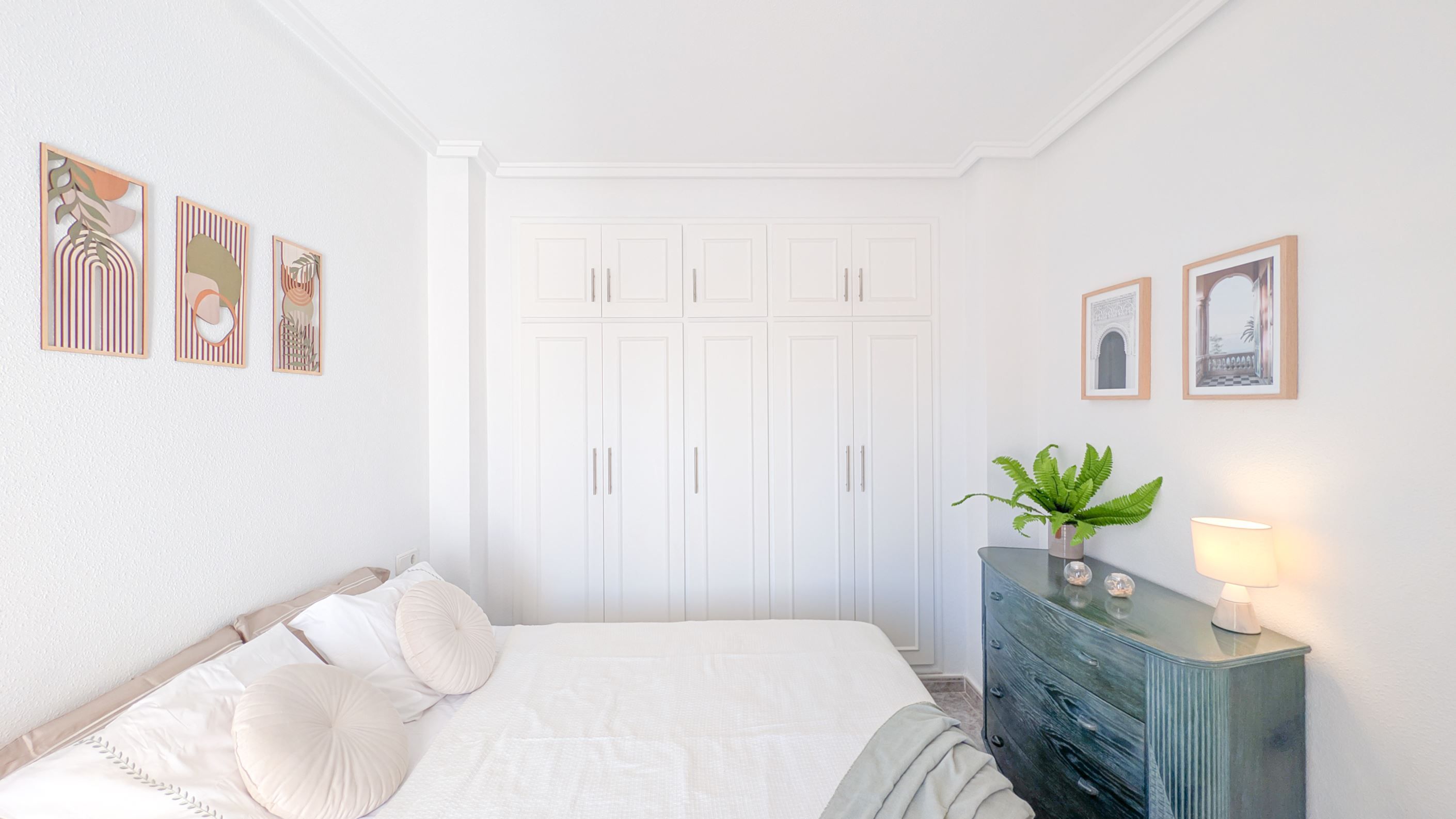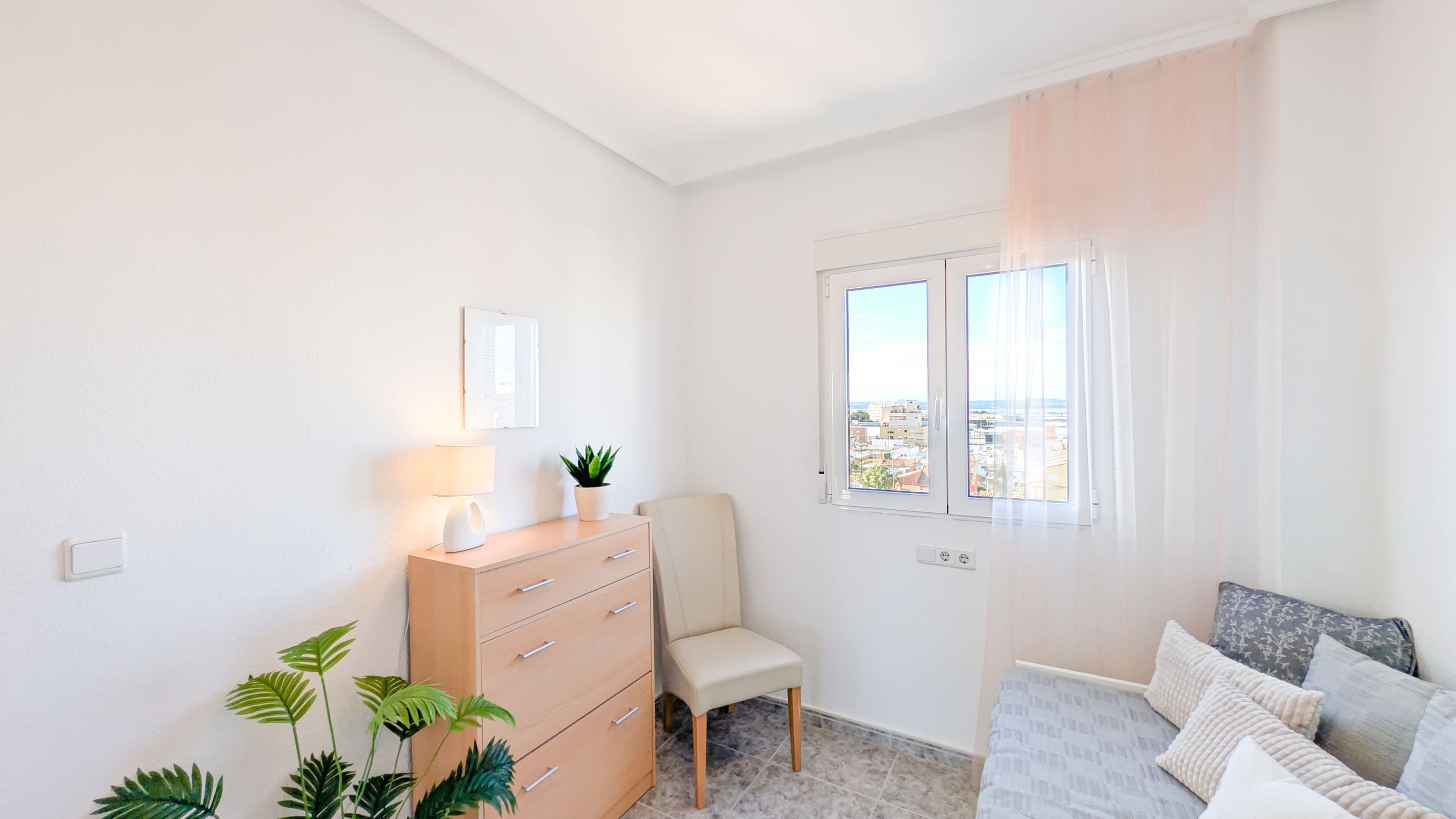 Lägenheten består av tre rymliga sovrum, varav två med inbyggda garderober. Ett av master-sovrummen har direkt access till den stora terrassen, medan det andra har tillgång till den mindre balkongen. Det tredje sovrummet, något mindre, är idealiskt för barn med plats för våningssäng eller stor enkelsäng, och här kan du njuta av solnedgången direkt utanför fönstret.