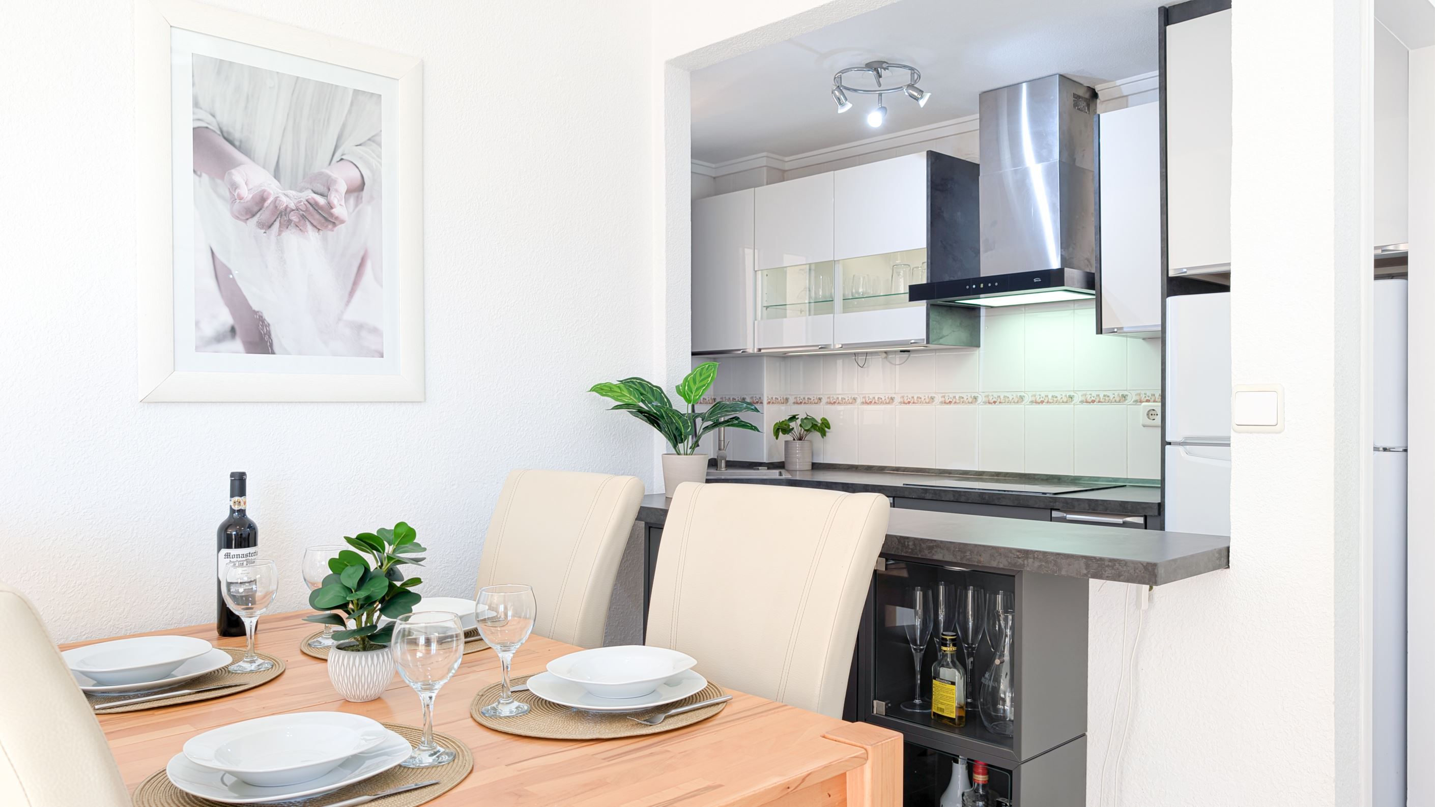Köket renoverades 2021 och är fullt utrustat med diskmaskin och moderna vitvaror, och öppnar upp mot vardagsrummet via en stor välvd öppning. Vardagsrummet har stora dörrar som leder direkt ut till terrassen, vilket skapar en ljus och luftig yta perfekt för socialt umgänge.