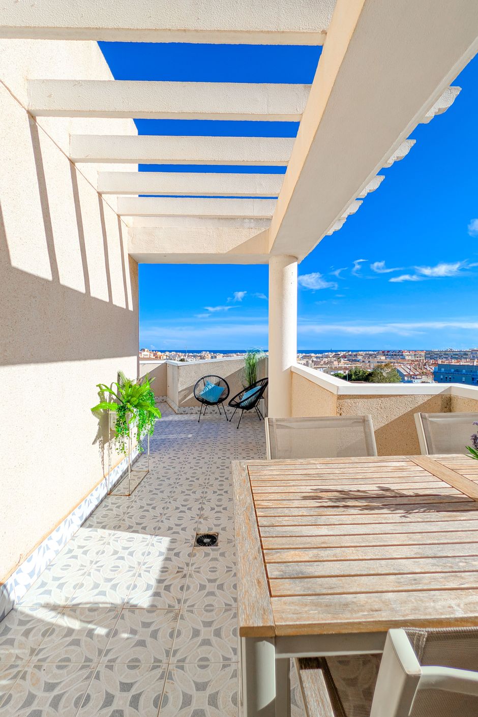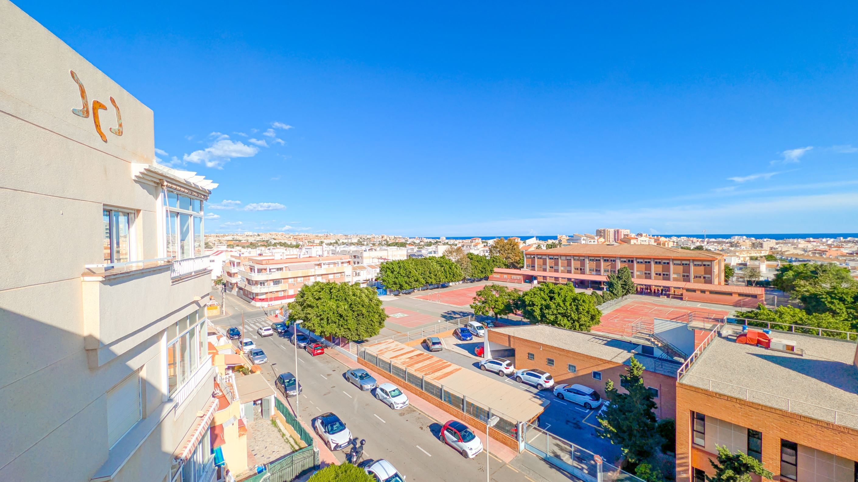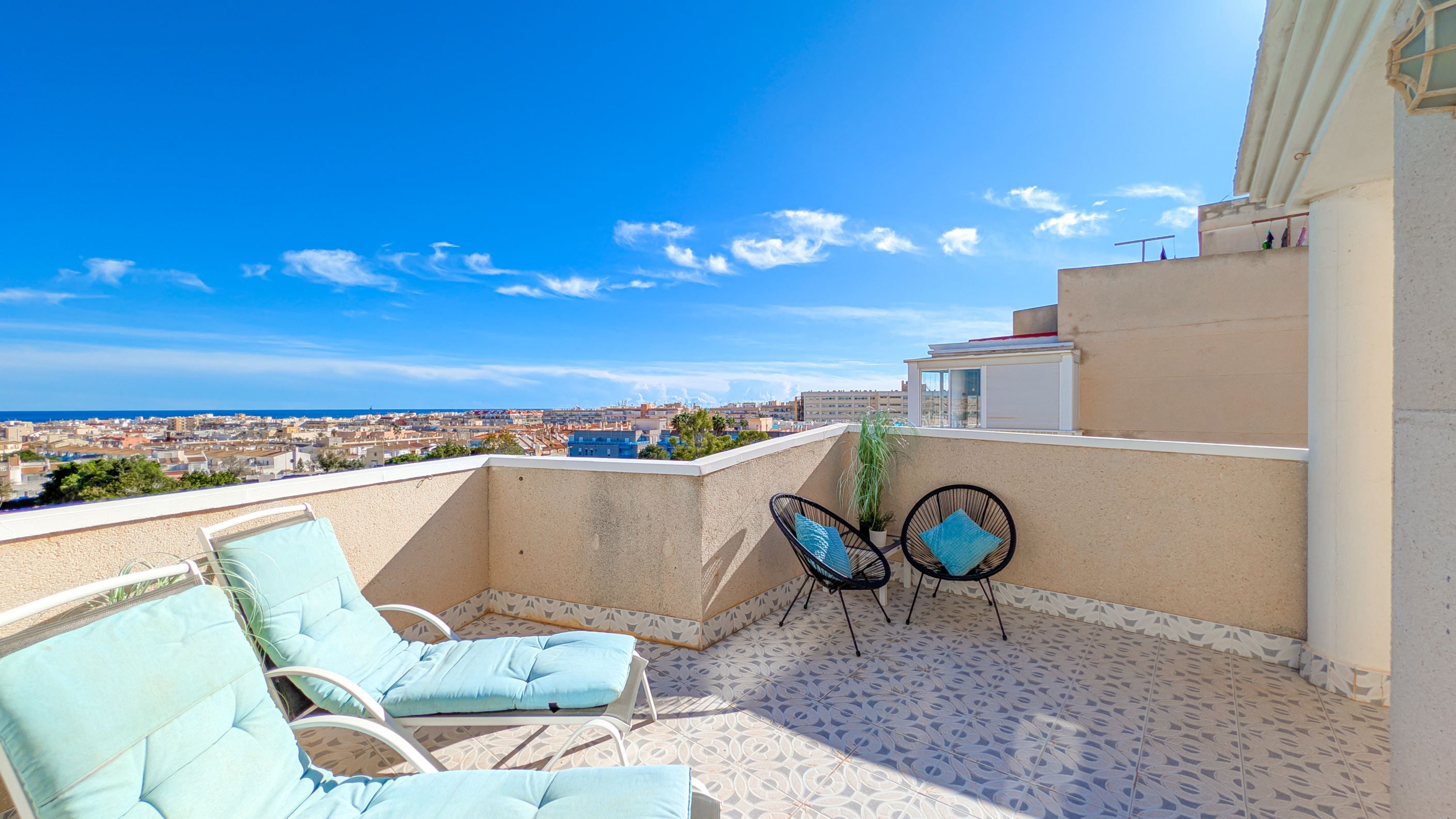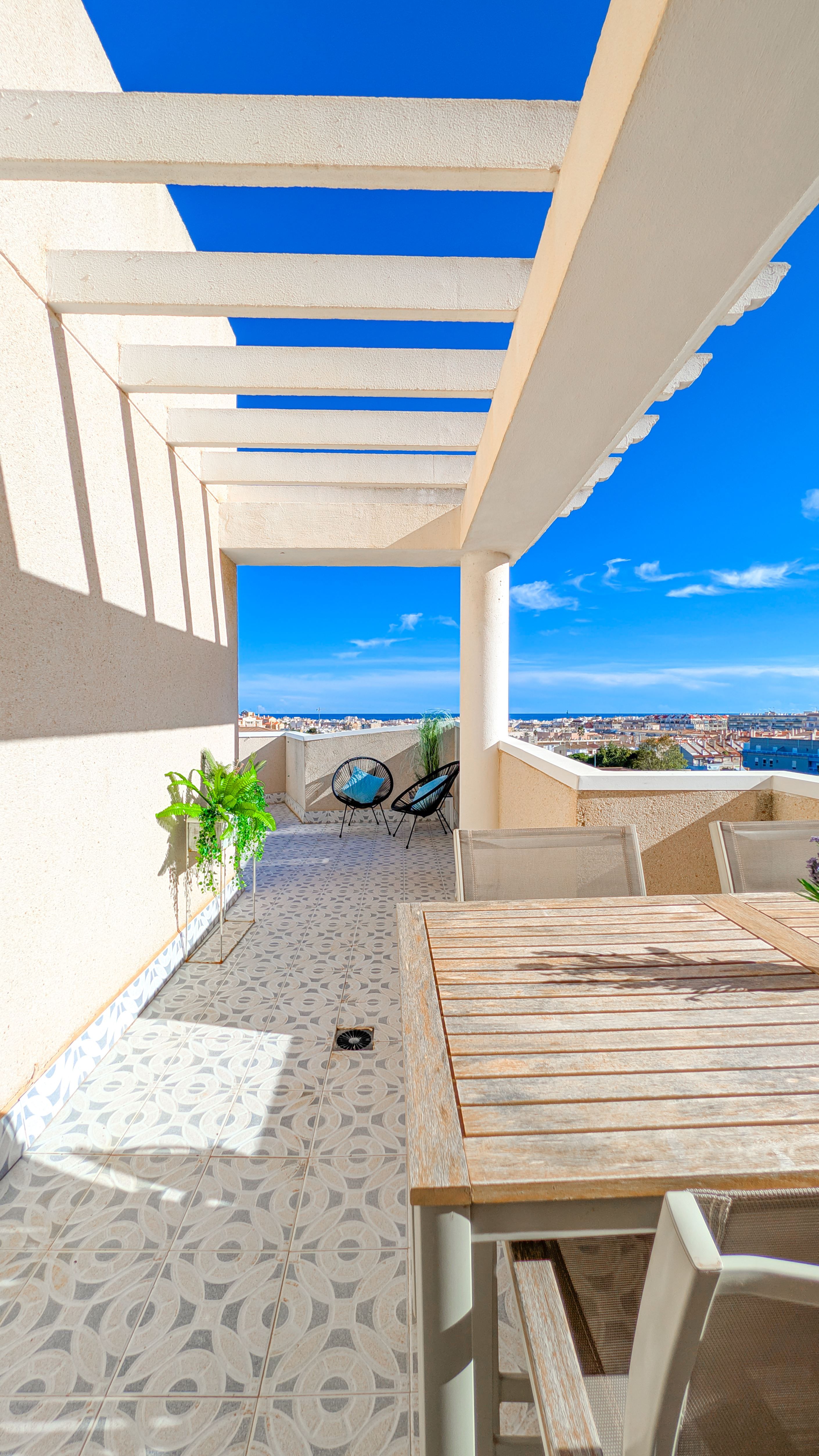 Välkommen till denna ljusa och rymliga penthouselägenhet i Nueva Torrevieja, med panoramavyer över staden och havet i fjärran. Här erbjuds ett bekvämt och modernt boende på högsta våningen, med en stor privat terrass på samma plan där du kan njuta av solen, äta middag utomhus, se soluppgången över havet eller koppla av med familj och vänner. Terrassen vetter mot sydost, vilket gör den perfekt för året-runt-boende, och under varma perioder finns även en praktisk utomhusdusch. På sydsidan hittar du en mindre balkong – perfekt för eftermiddagskaffet med utsikt över staden.