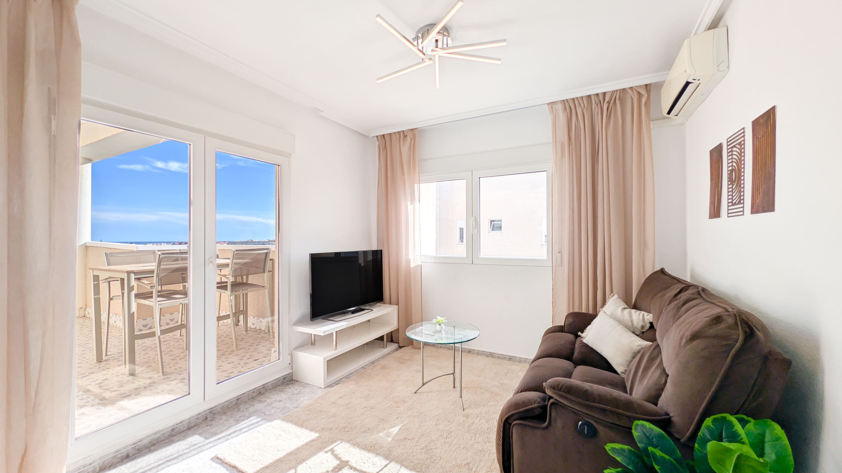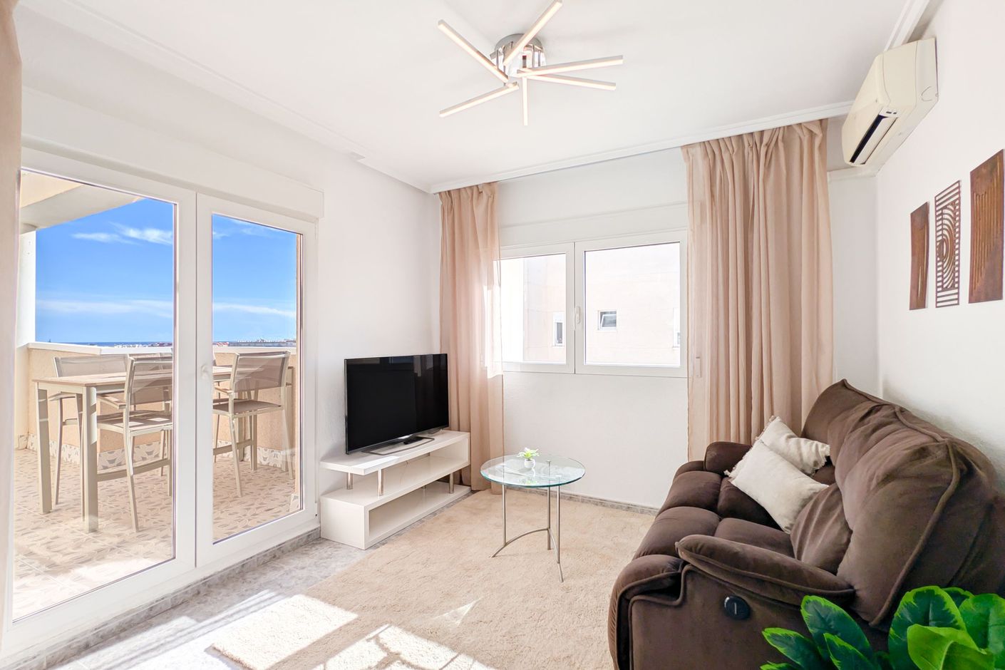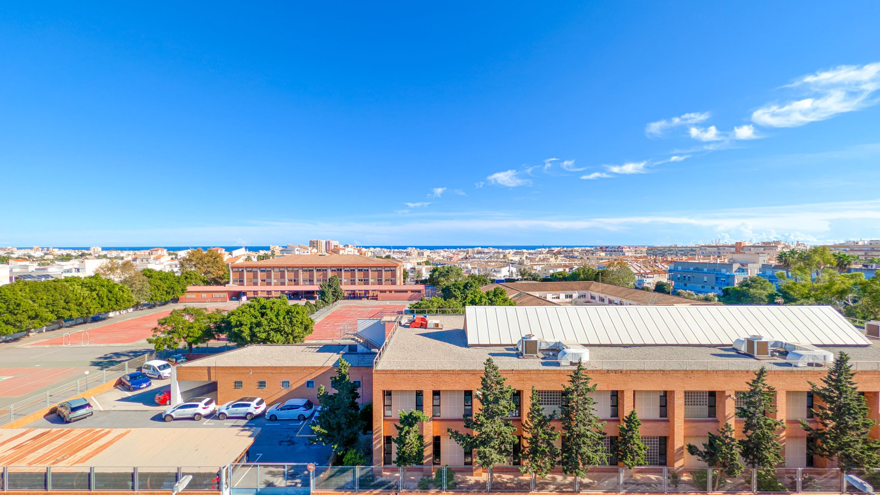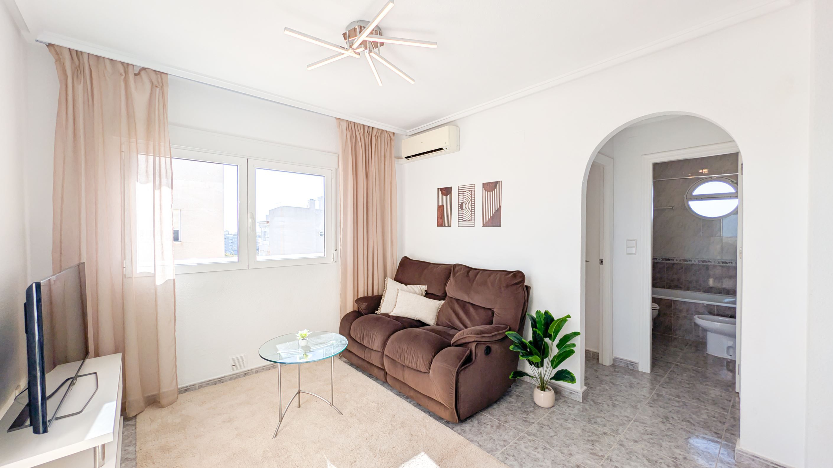 Välkommen till denna ljusa och rymliga penthouselägenhet i Nueva Torrevieja, med panoramavyer över staden och havet i fjärran. Här erbjuds ett bekvämt och modernt boende på högsta våningen, med en stor privat terrass på samma plan där du kan njuta av solen, äta middag utomhus, se soluppgången över havet eller koppla av med familj och vänner. Terrassen vetter mot sydost, vilket gör den perfekt för året-runt-boende, och under varma perioder finns även en praktisk utomhusdusch. På sydsidan hittar du en mindre balkong – perfekt för eftermiddagskaffet med utsikt över staden.