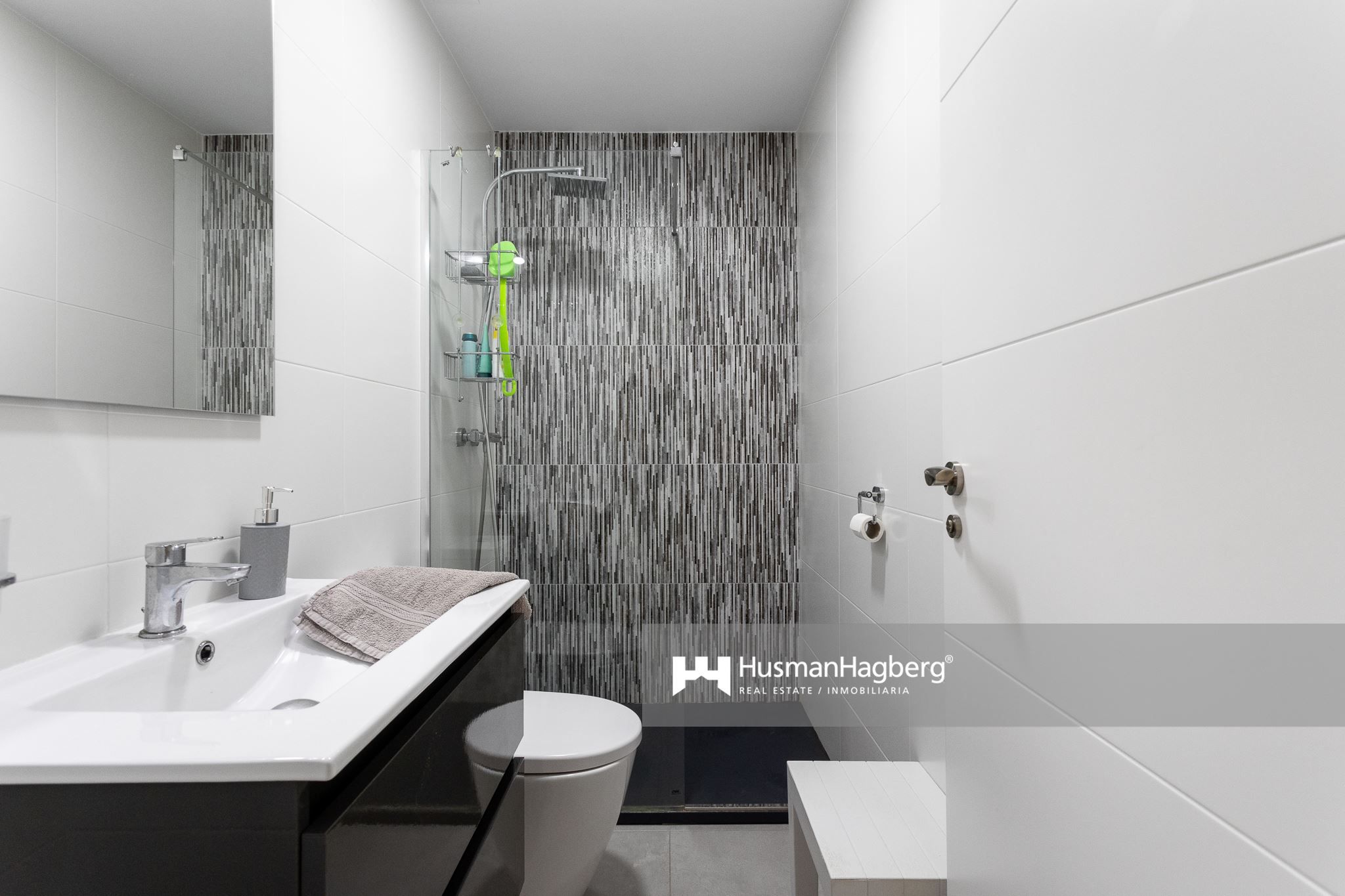 Det öppna köket är modernt och funktionellt och smälter fint samman med det inbjudande vardagsrummet där stora fönster fyller rummet med naturligt ljus. Härifrån kliver du direkt ut på din egna privata terrass – en härlig plats för frukostar i morgonsolen, avkopplande eftermiddagar eller långa middagar under stjärnorna.