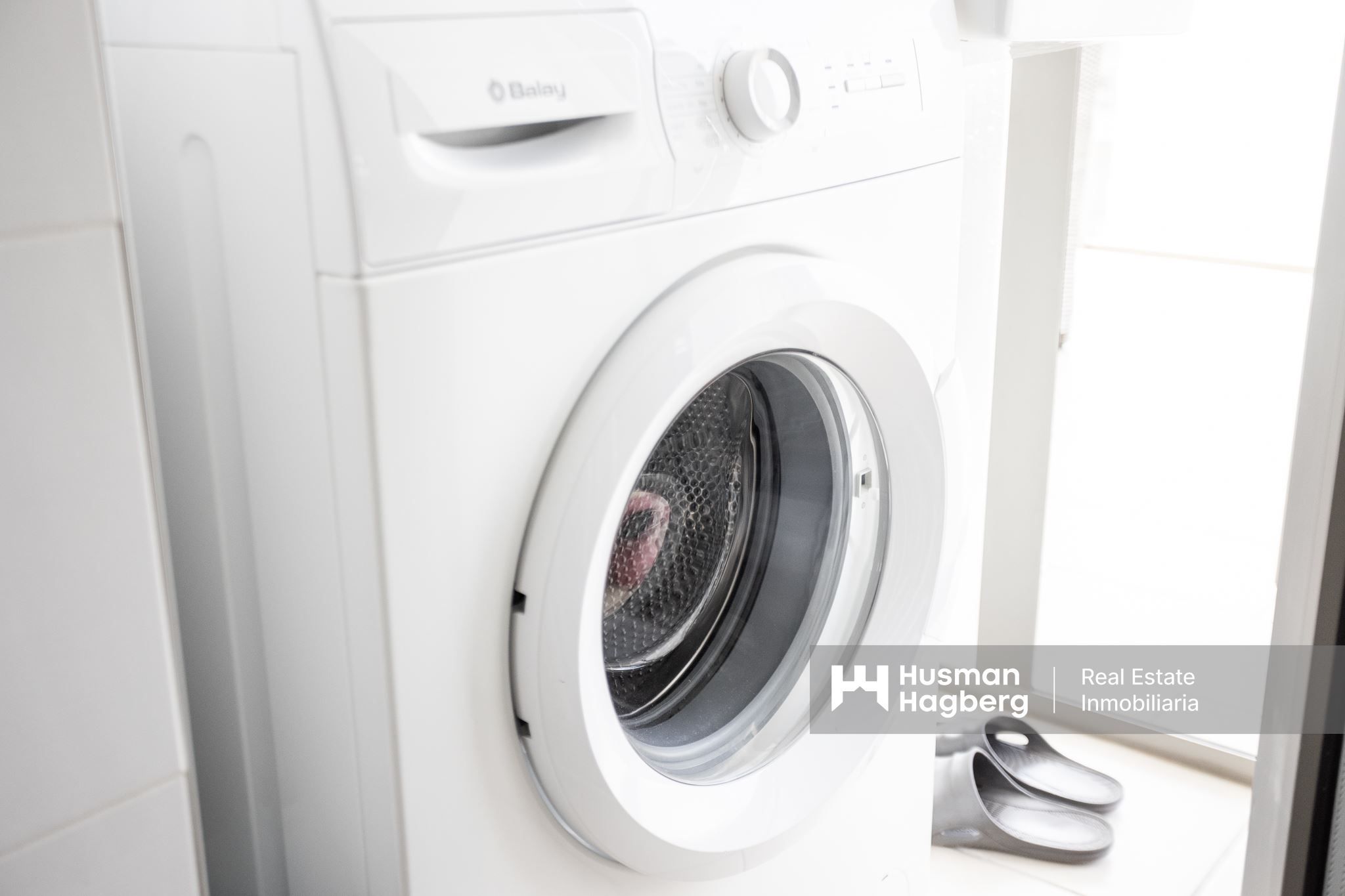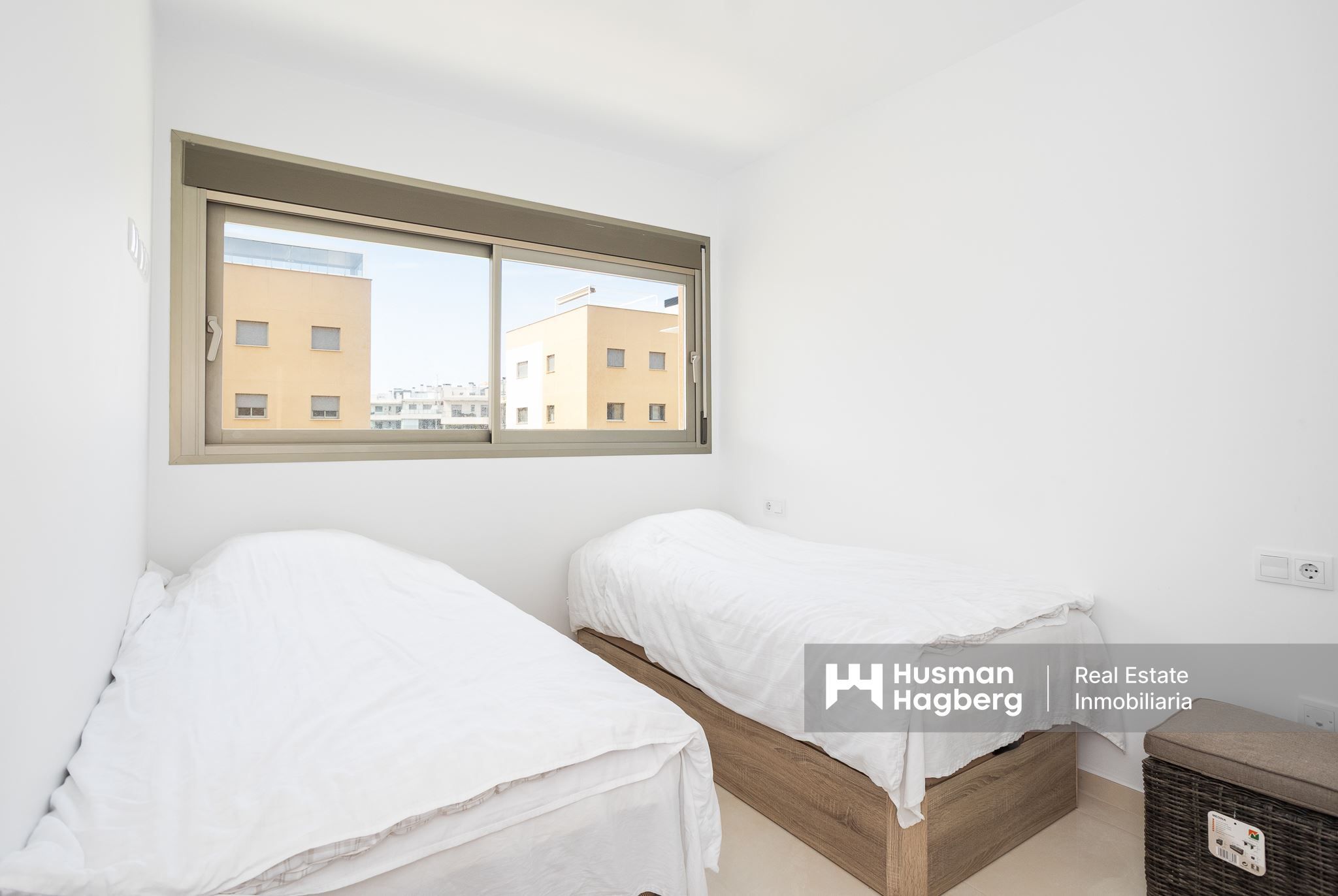 Bostaden är belägen på andra våningen i en stilren byggnad med hiss, och erbjuder två rymliga sovrum samt två helkaklade badrum med golvvärme – en lyx som gör stor skillnad året runt. Den öppna planlösningen skapar ett luftigt flöde mellan det fullt utrustade köket och det inbjudande vardagsrummet, där stora fönster släpper in det varma, spanska ljuset.