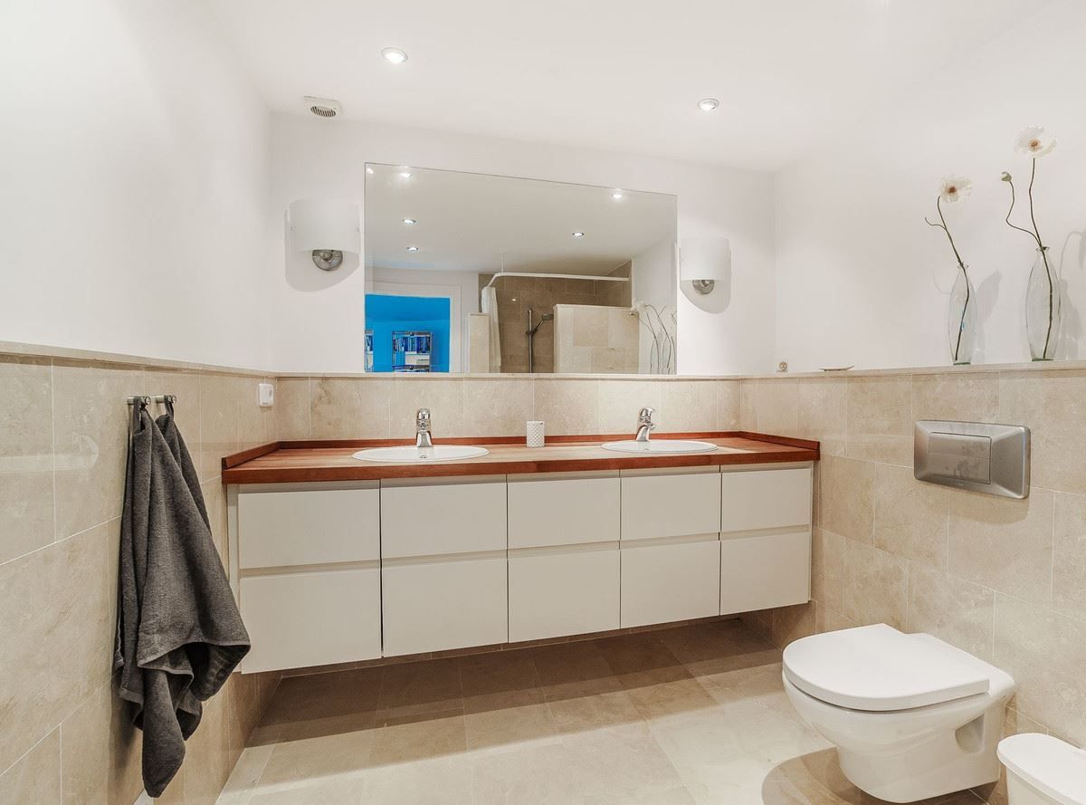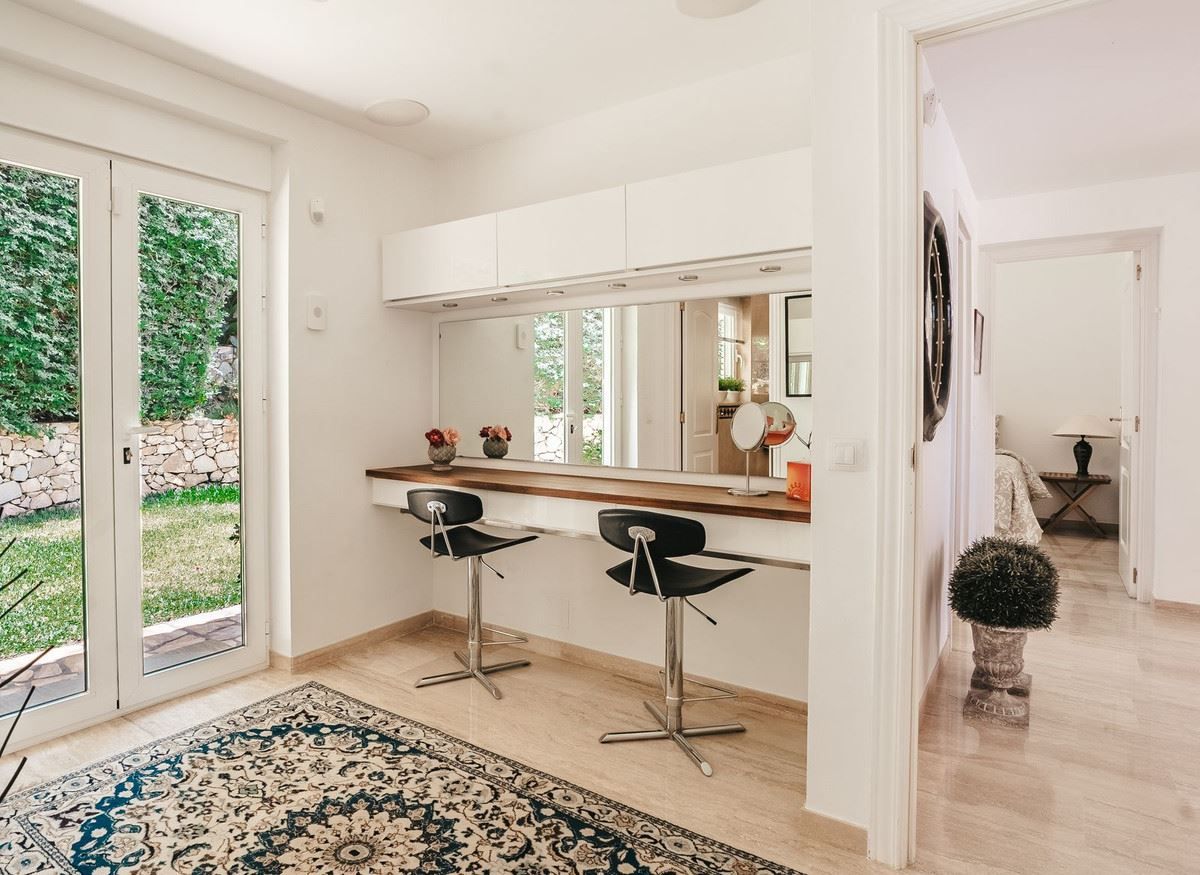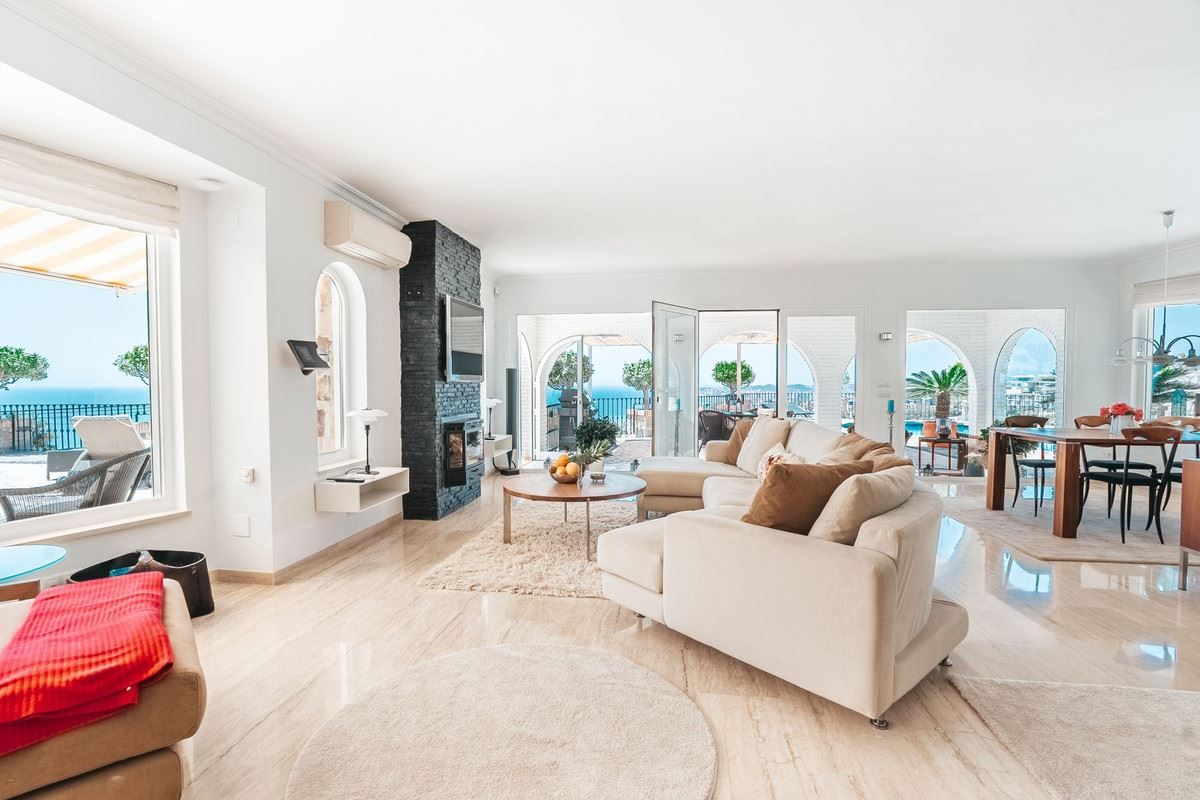 Invändigt möts du av en öppen planlösning med stilfullt designkök, ljust vardagsrum med öppen spis, Bang & Olufsen-ljudsystem och sömlös access till soliga terrasser. Utomhusområdet bjuder på en stor oval pool, jacuzzi och flera loungeytor – perfekt för avkoppling eller sociala tillställningar.