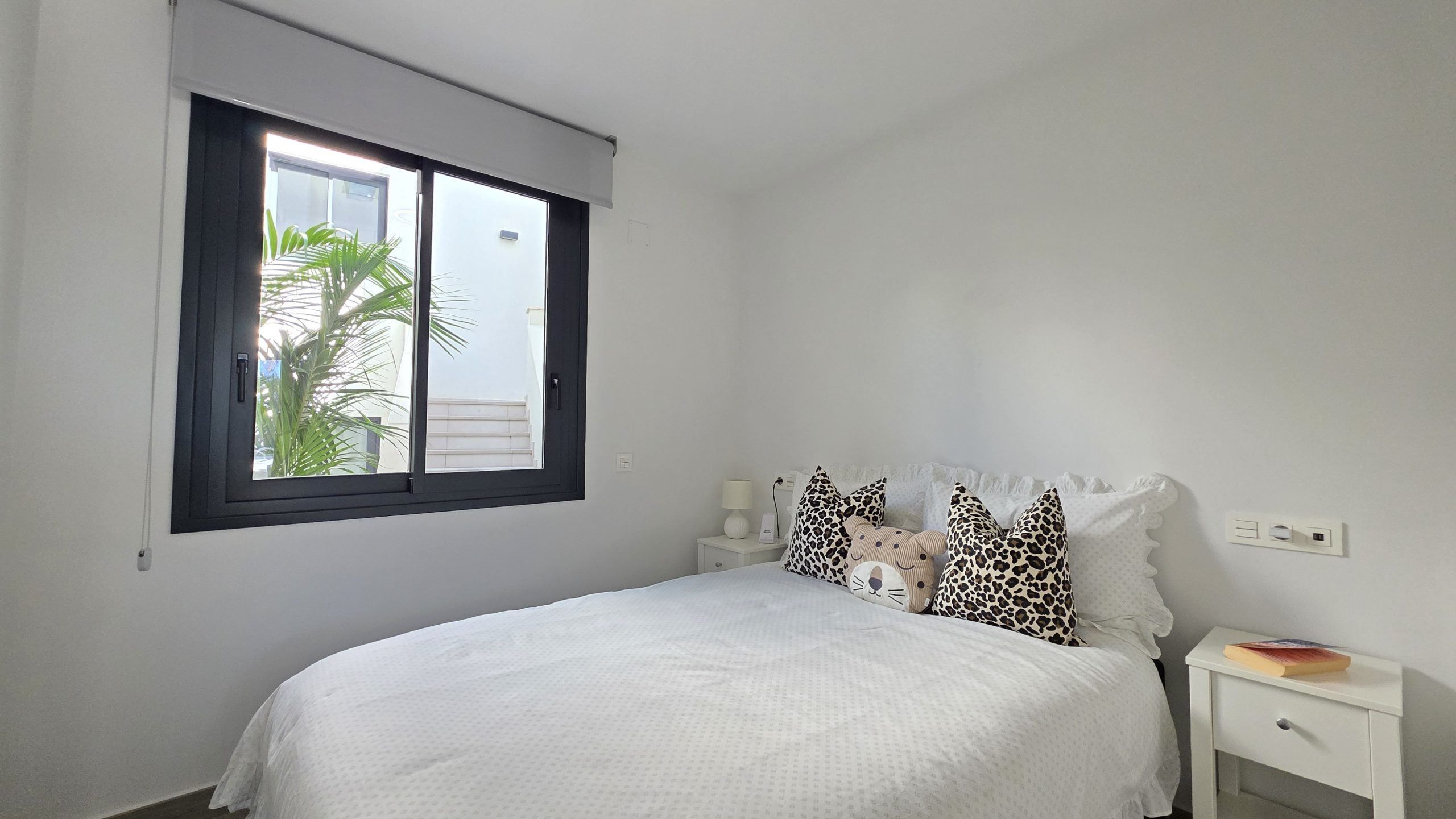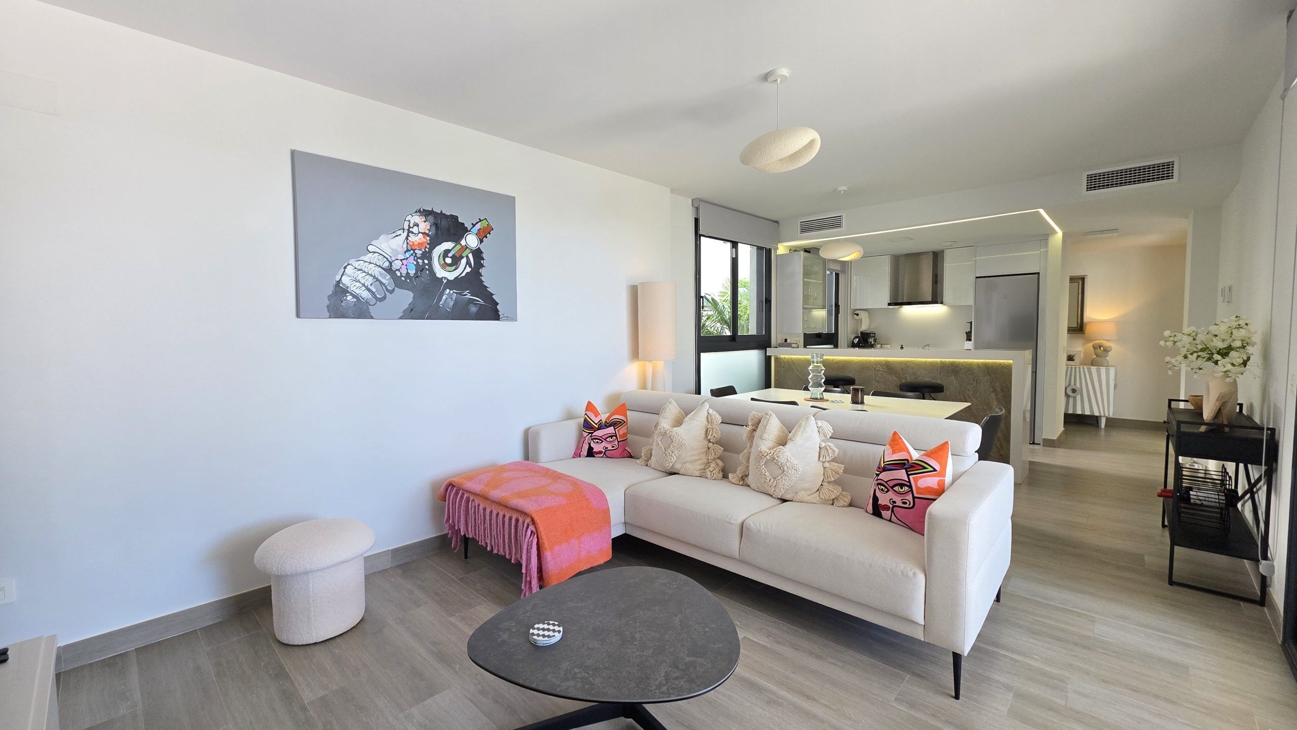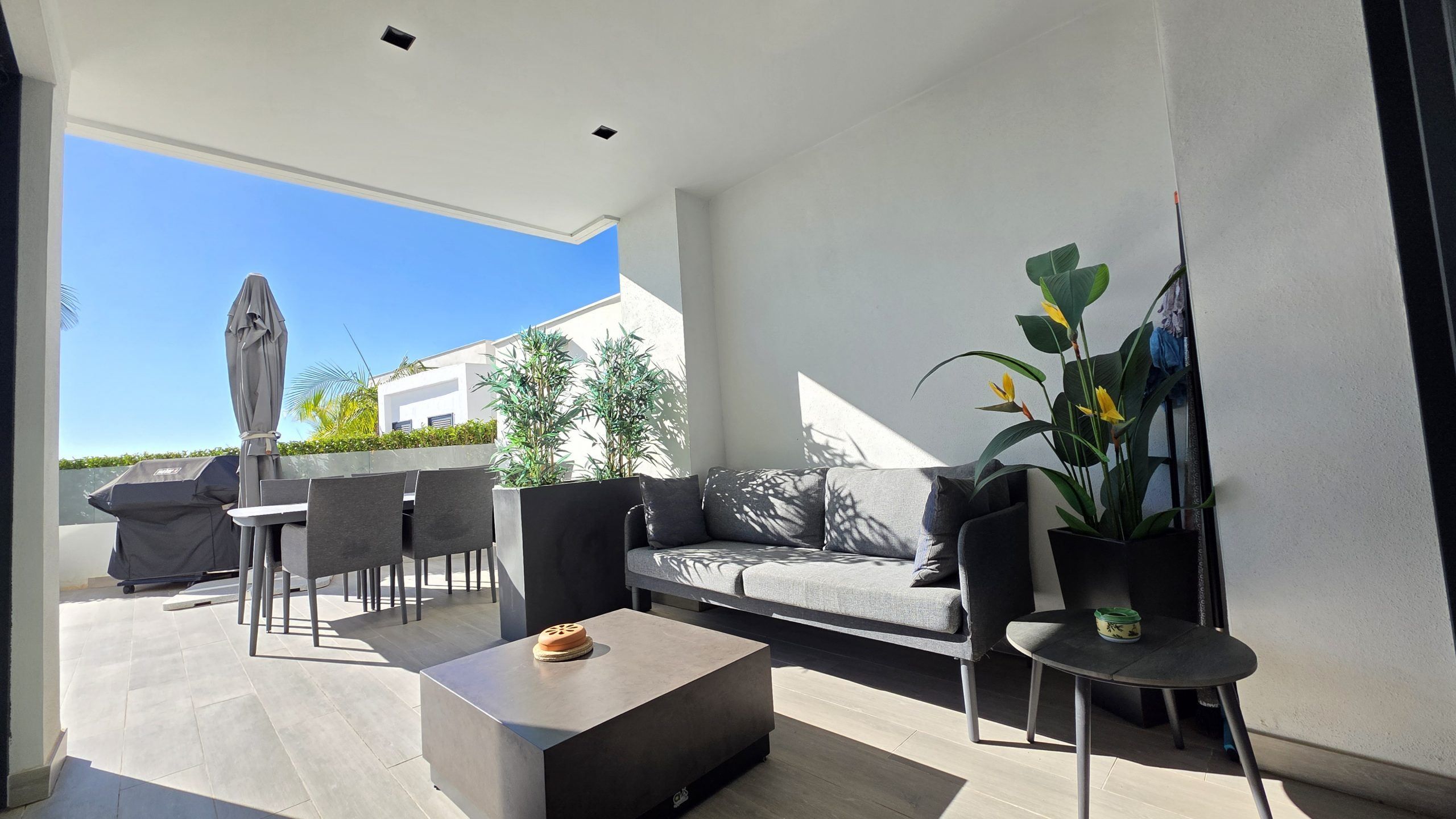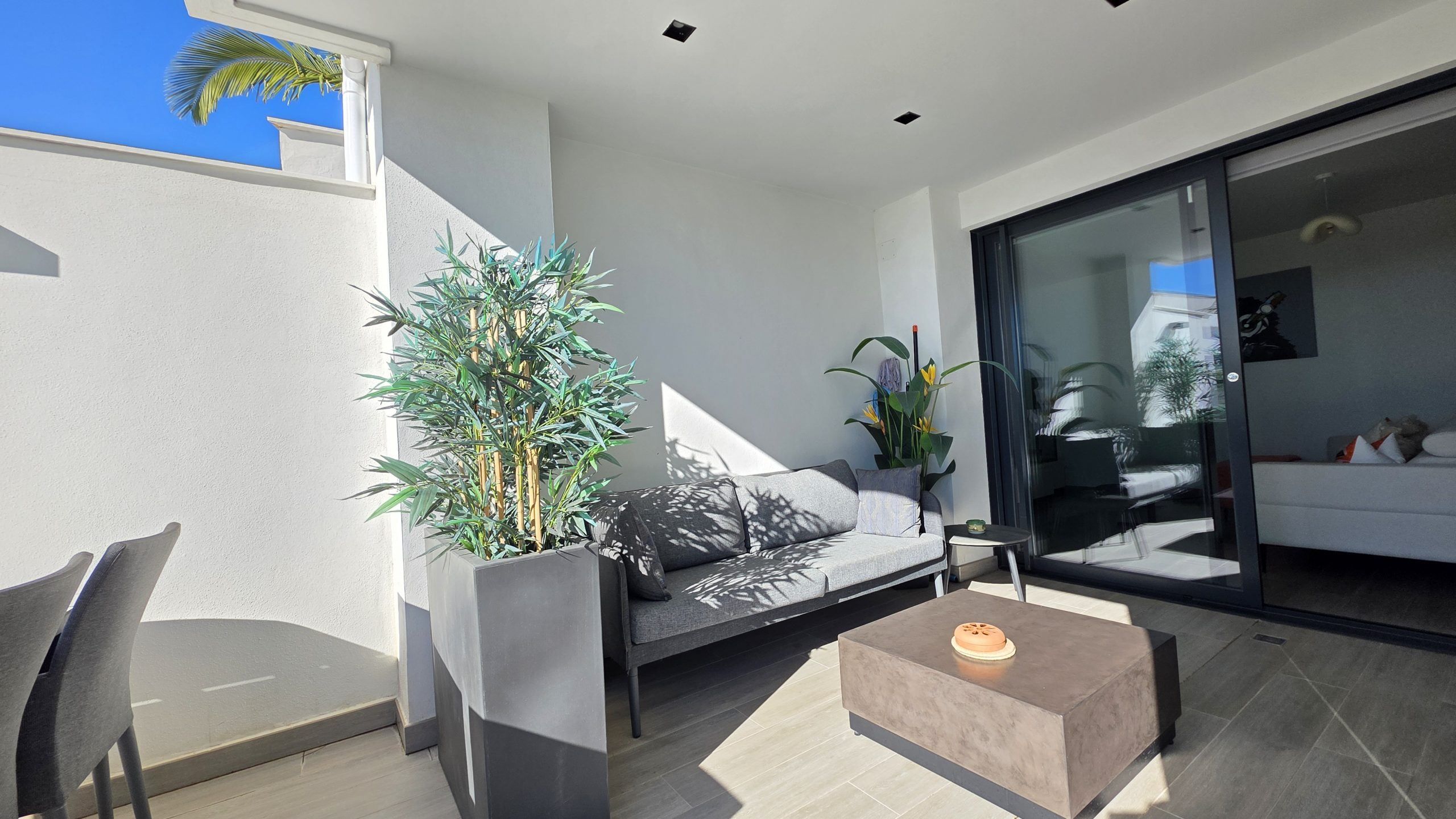 Lägenheten har tre sovrum och två moderna badrum, varav ett är en suite. Både vardagsrummet och två av sovrummen har direkt tillgång till en rymlig terrass, ett idealiskt utrymme för att njuta av solen, utelivet och avkopplande stunder med familj eller vänner.
