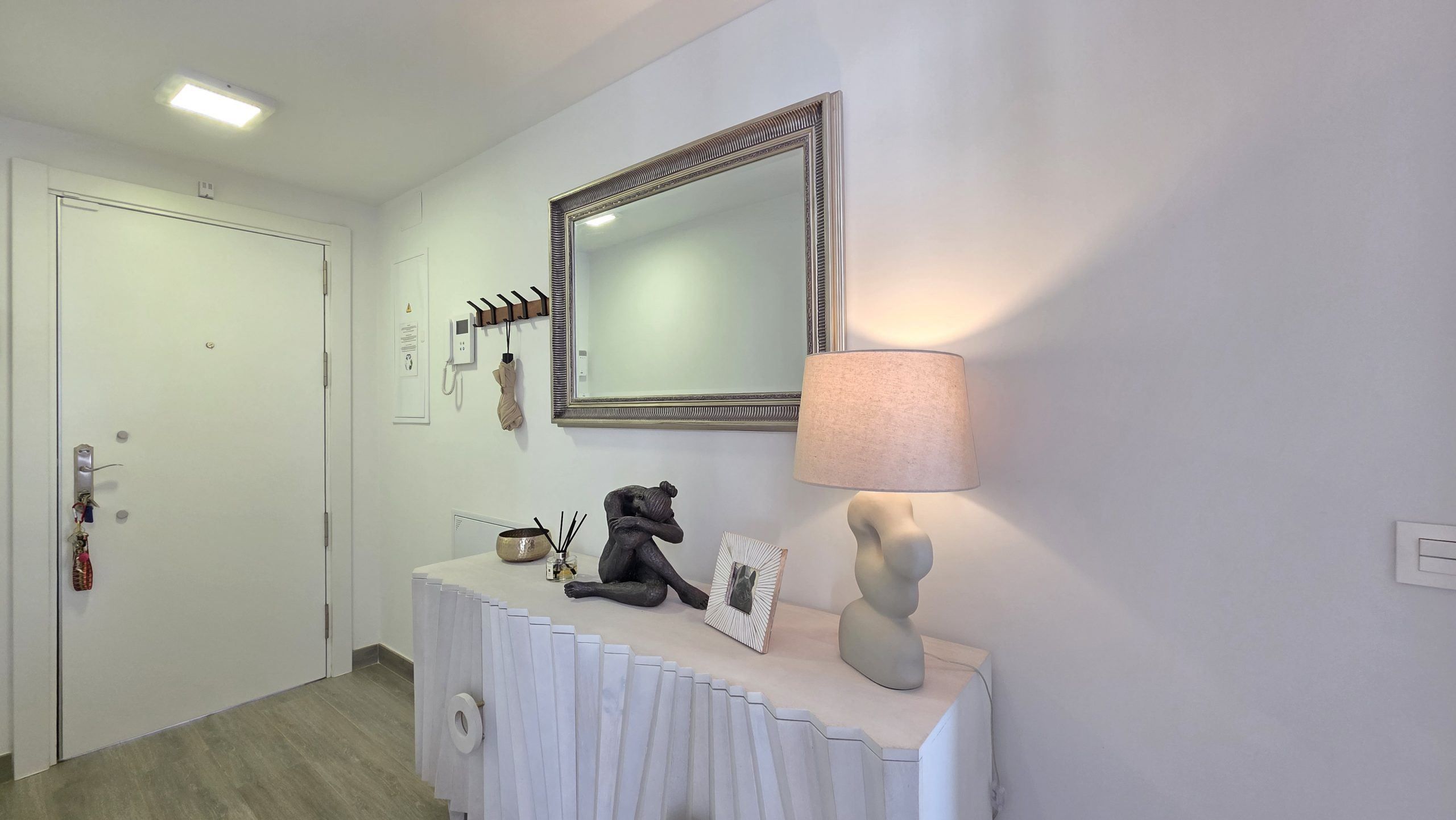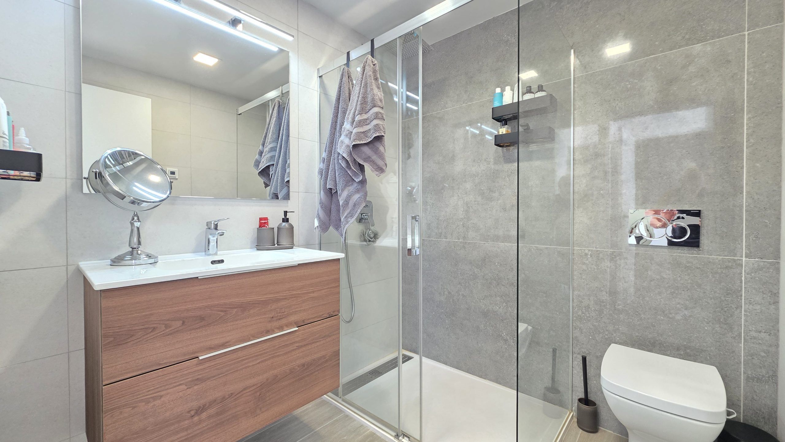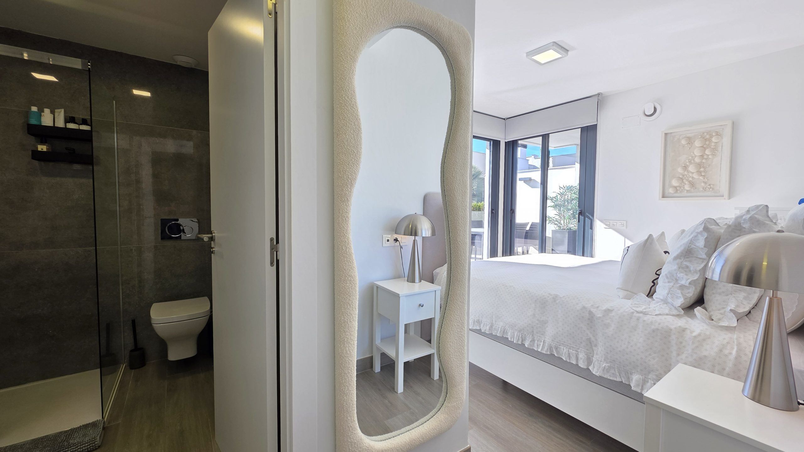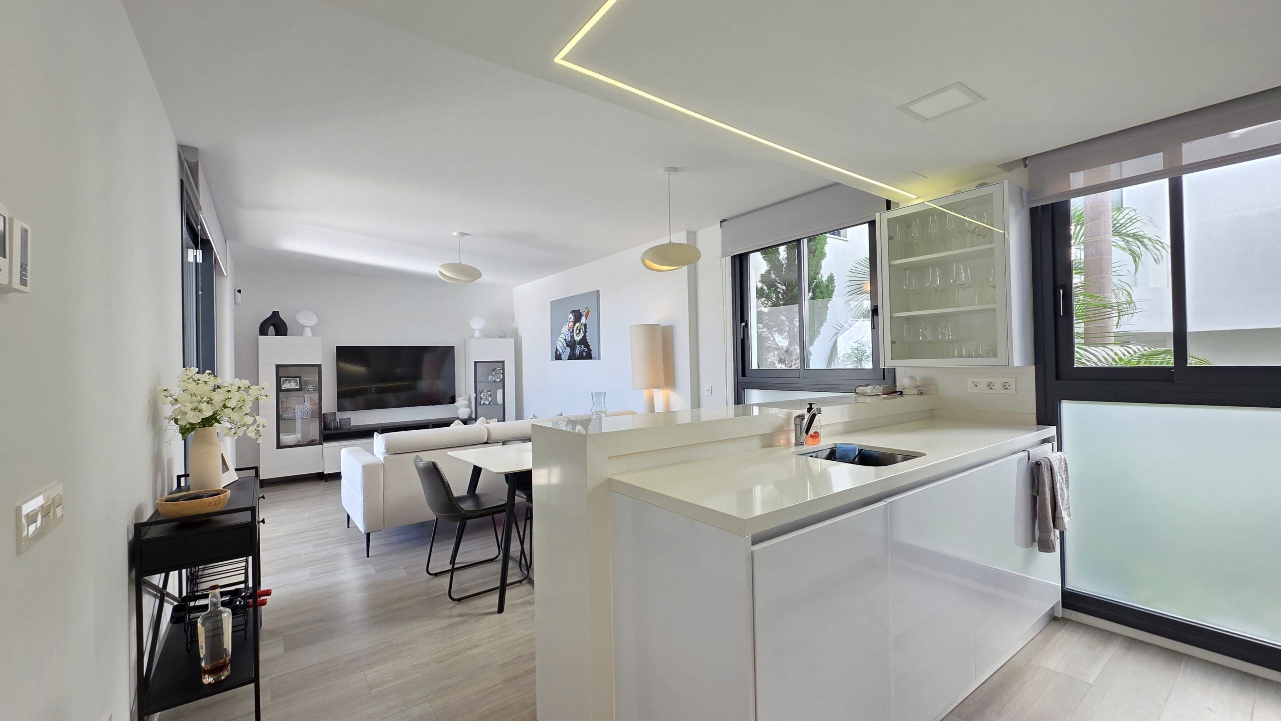 Lägenheten har tre sovrum och två moderna badrum, varav ett är en suite. Både vardagsrummet och två av sovrummen har direkt tillgång till en rymlig terrass, ett idealiskt utrymme för att njuta av solen, utelivet och avkopplande stunder med familj eller vänner.