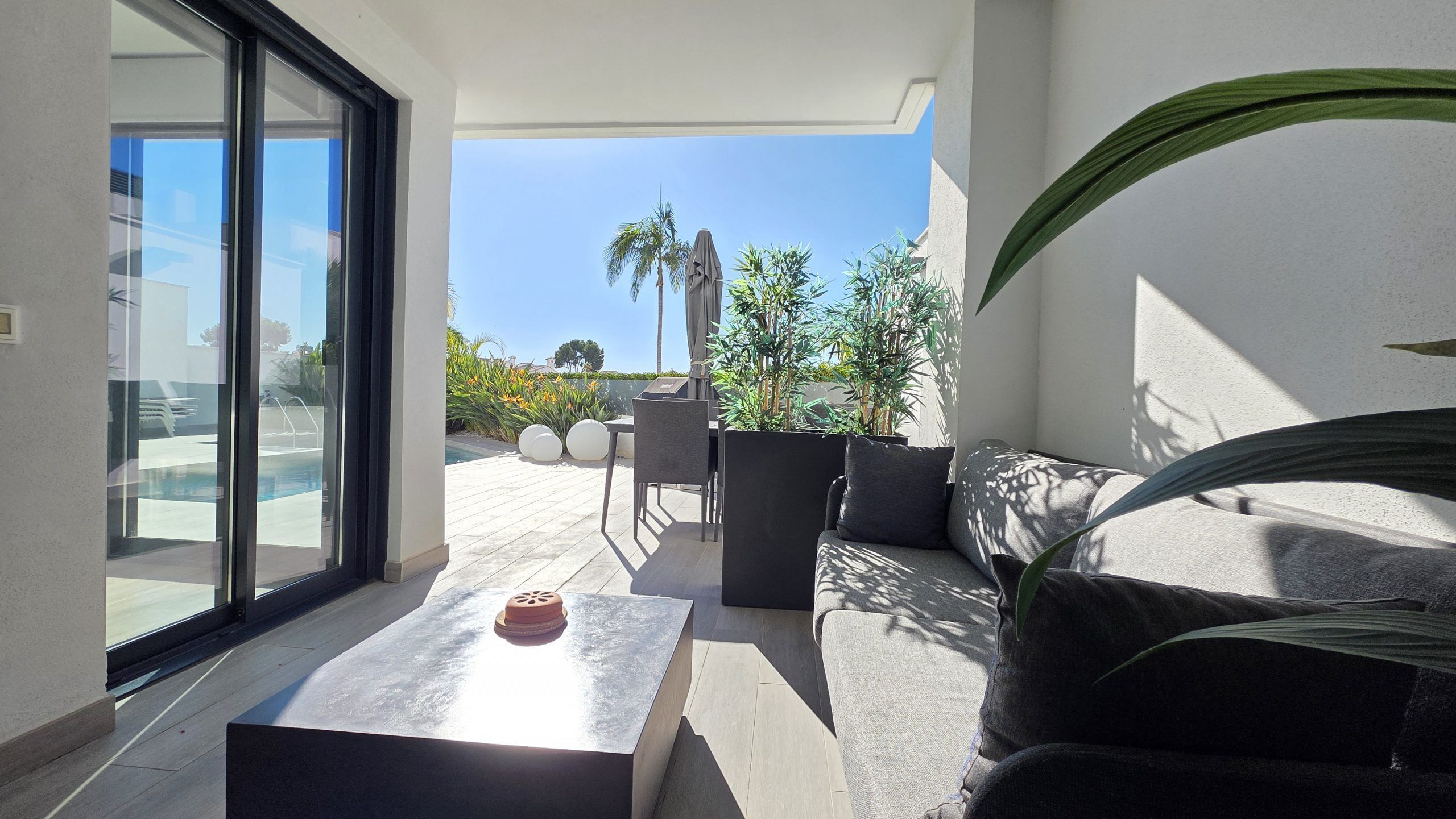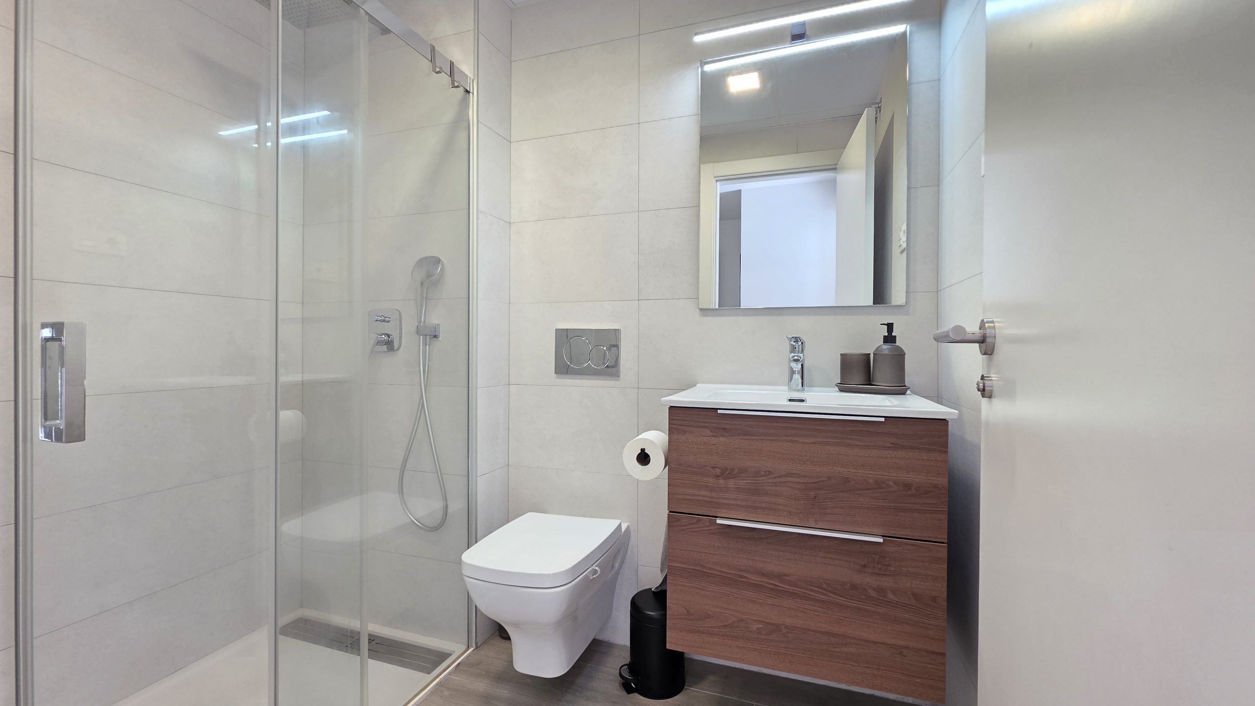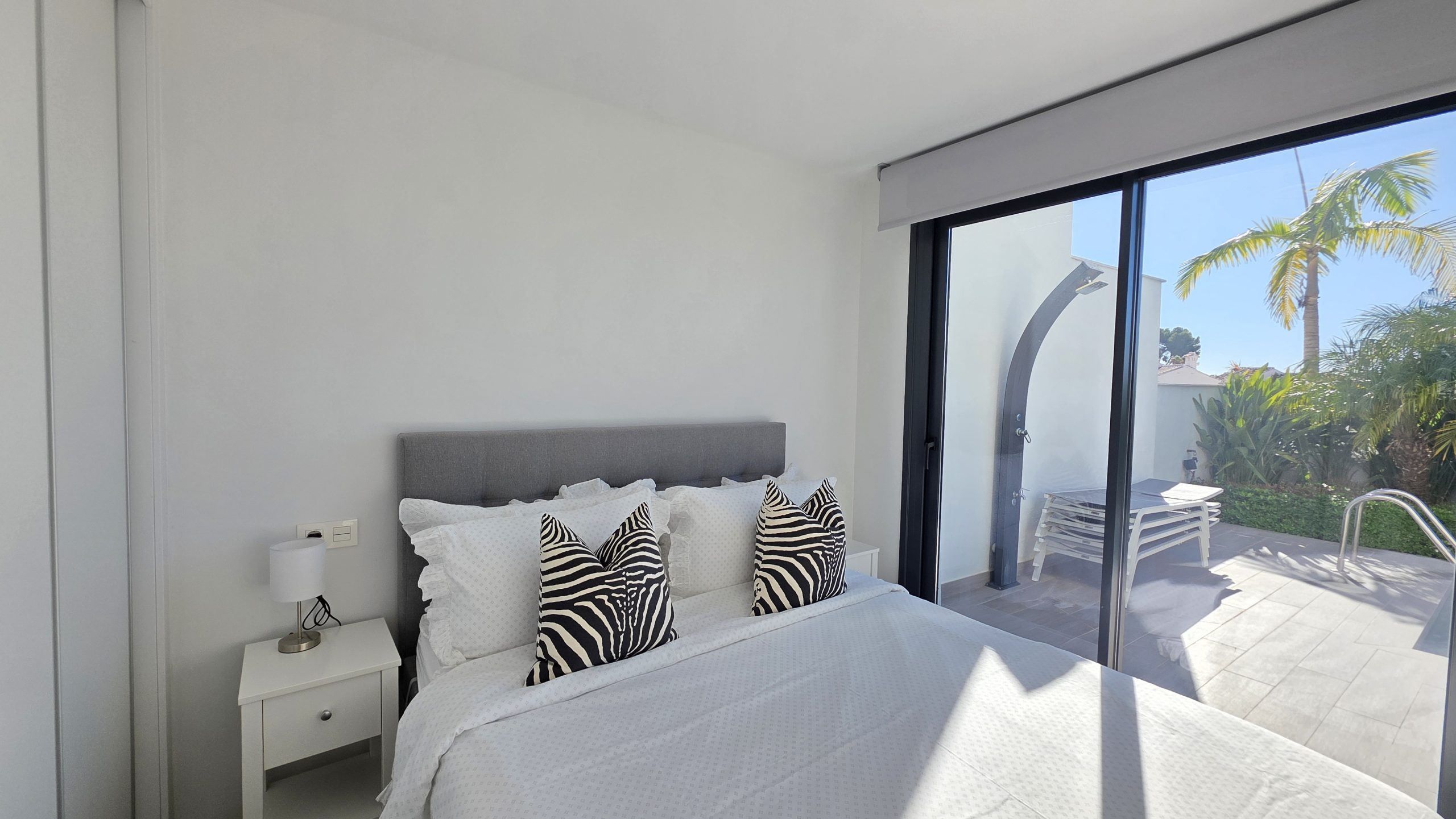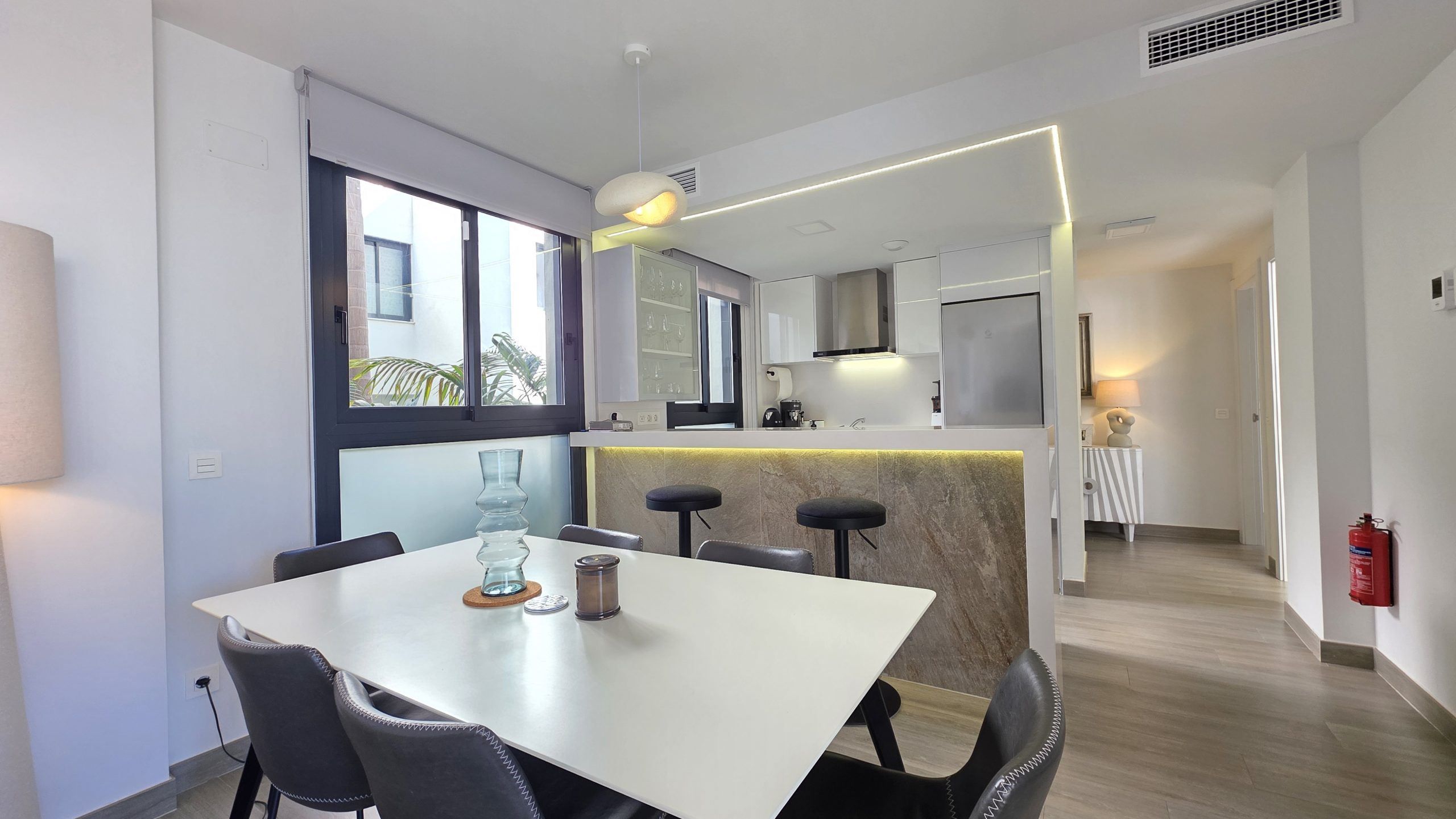 Lägenheten har tre sovrum och två moderna badrum, varav ett är en suite. Både vardagsrummet och två av sovrummen har direkt tillgång till en rymlig terrass, ett idealiskt utrymme för att njuta av solen, utelivet och avkopplande stunder med familj eller vänner.