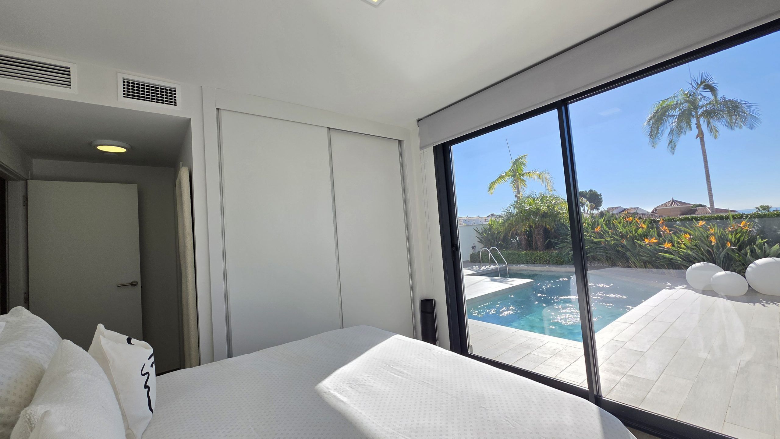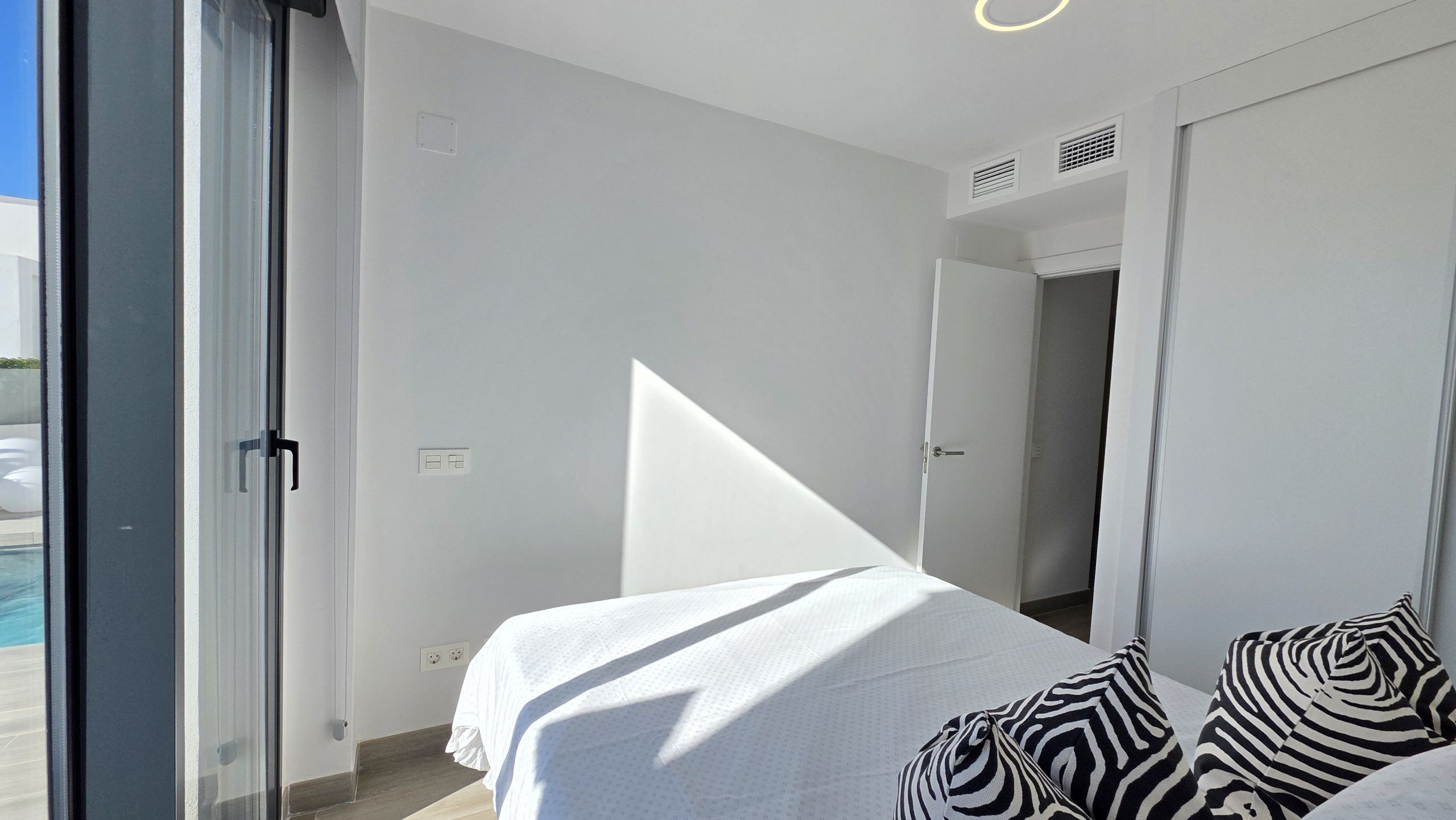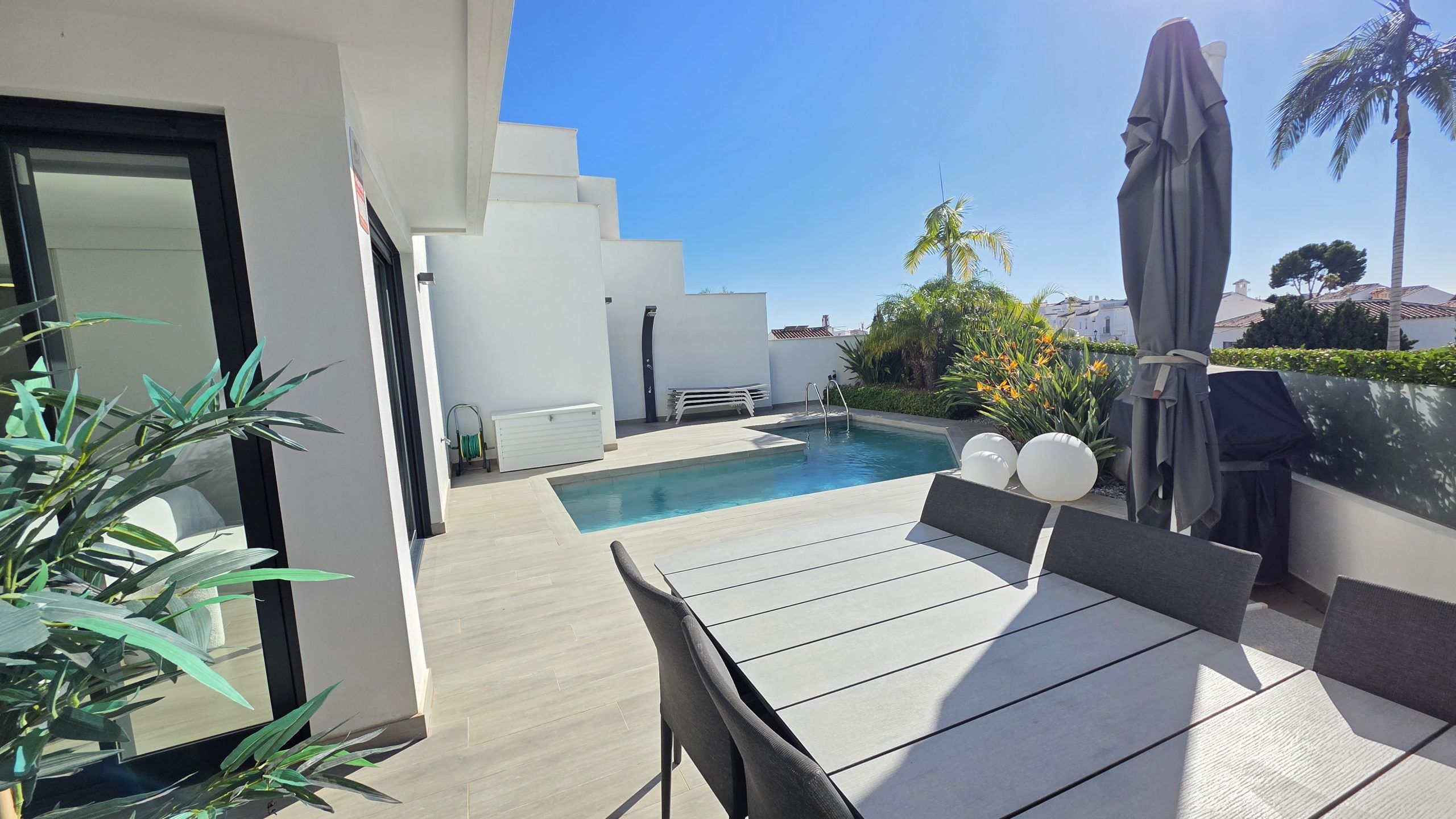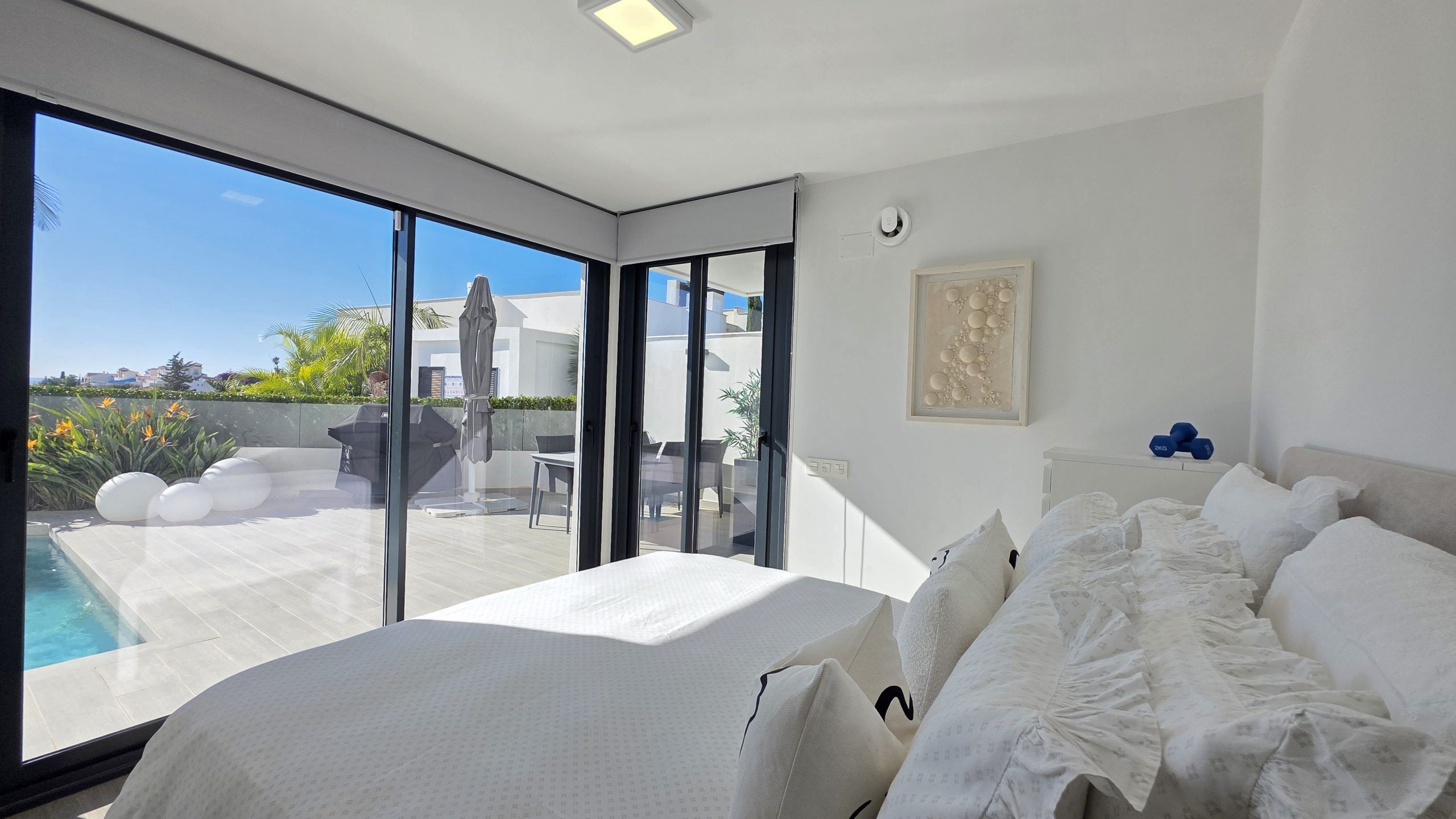 Lägenheten har tre sovrum och två moderna badrum, varav ett är en suite. Både vardagsrummet och två av sovrummen har direkt tillgång till en rymlig terrass, ett idealiskt utrymme för att njuta av solen, utelivet och avkopplande stunder med familj eller vänner.