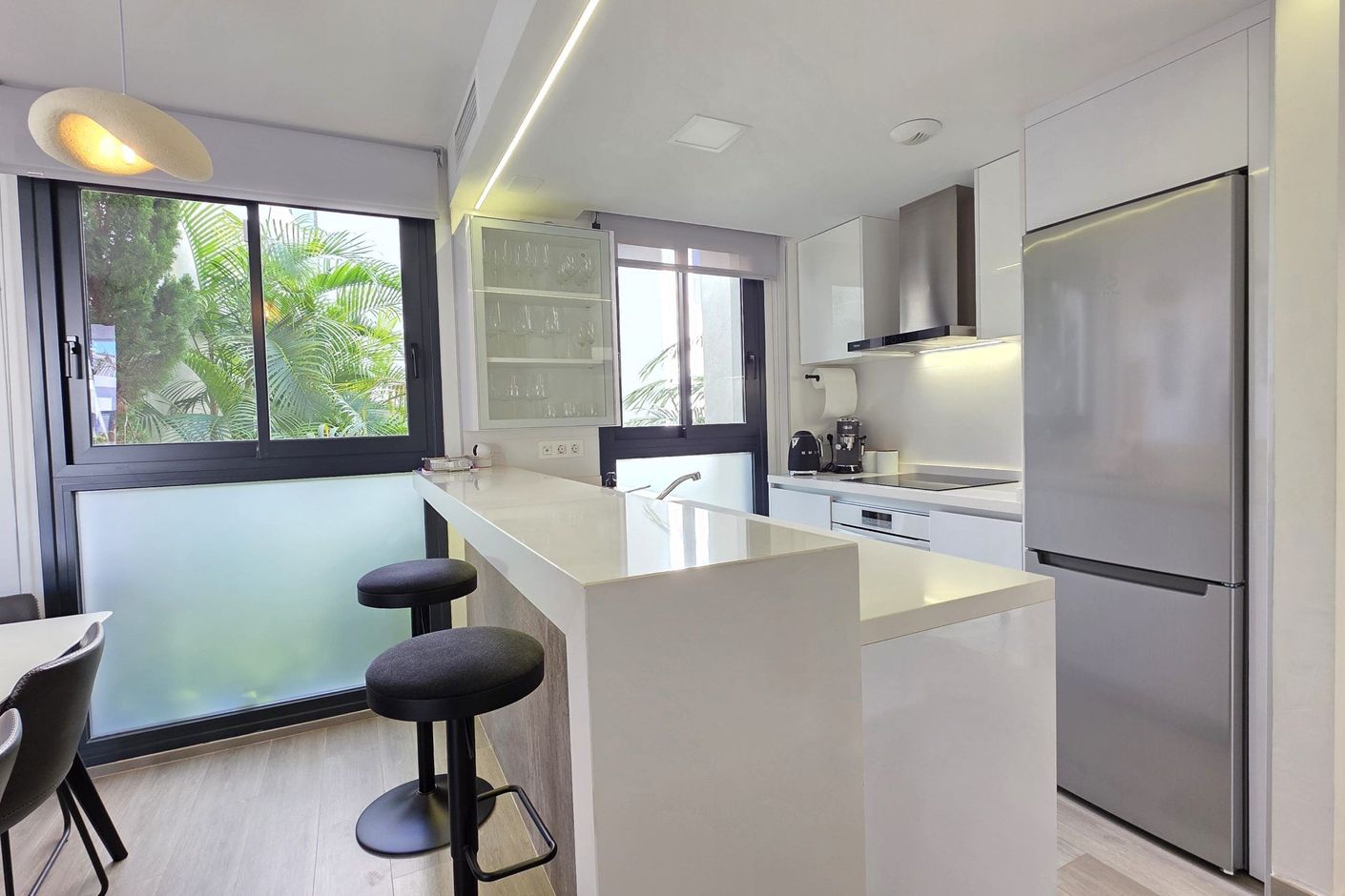 Direkt när du kommer in slås du av kvaliteten, finishen och rummens rymlighet. Det ljusa vardagsrummet flyter smidigt över i det moderna, öppna köket, som är fullt utrustat och kompletterar lägenhetens raffinerade inredning perfekt. Allt har designats med utsökt smak och säljs fullt möblerat, redo att flytta in.