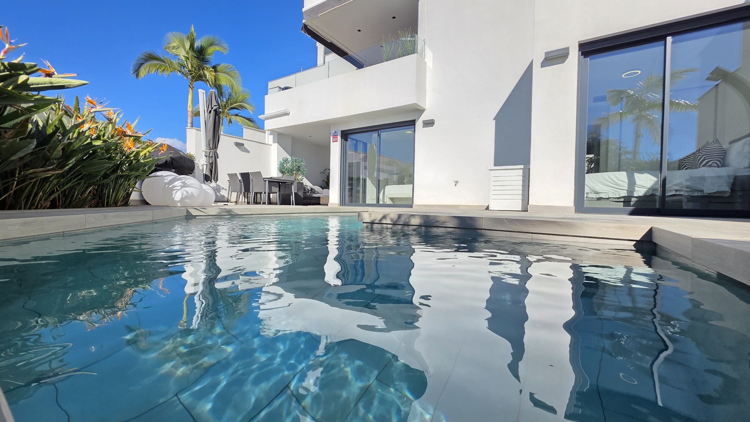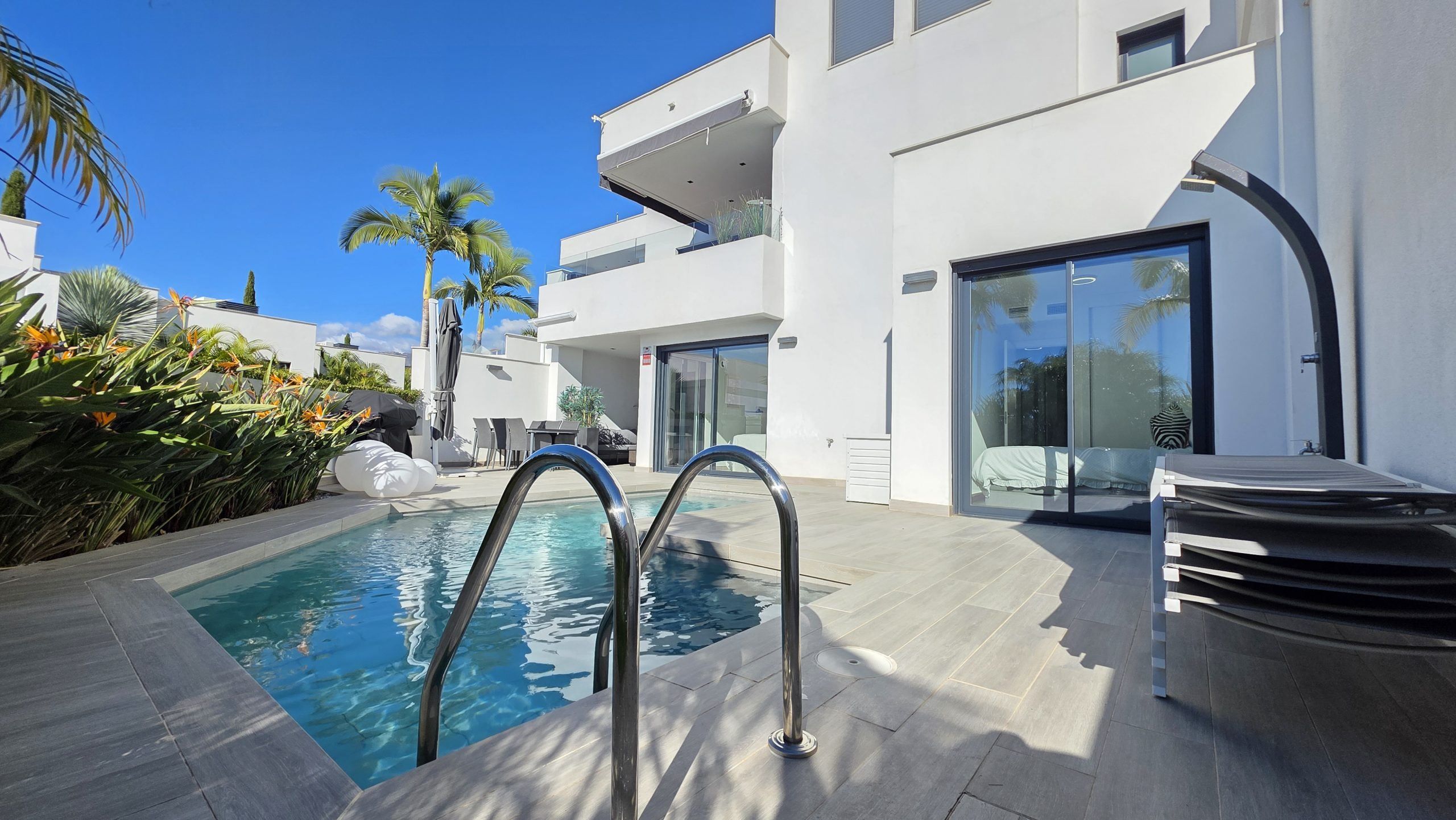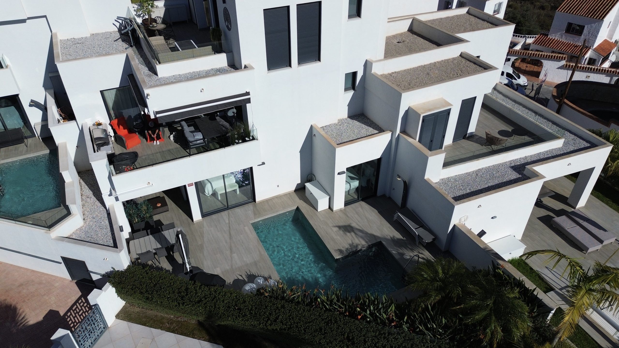 Den största attraktionen i denna fastighet är den magnifika privata poolen – ett sällsynt privilegium i detta område – som ger fullständig avskildhet och förvandlar terrassen till en verklig oas. Dessutom har komplexet en spektakulär gemensam pool och gott om parkeringsplatser, vilket garanterar bekvämlighet och tillgänglighet vid alla tidpunkter.