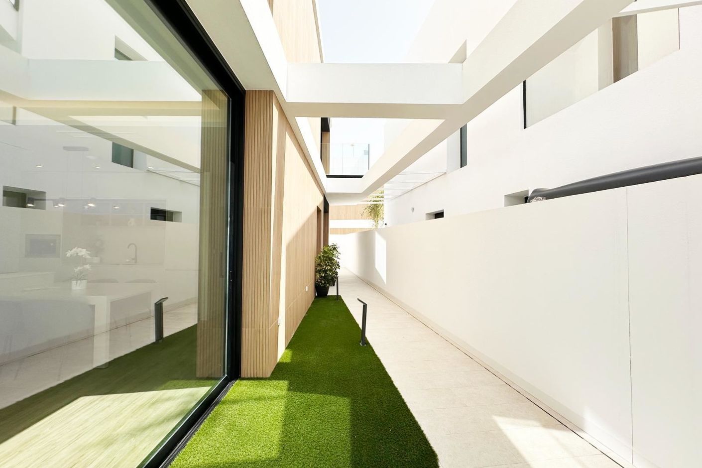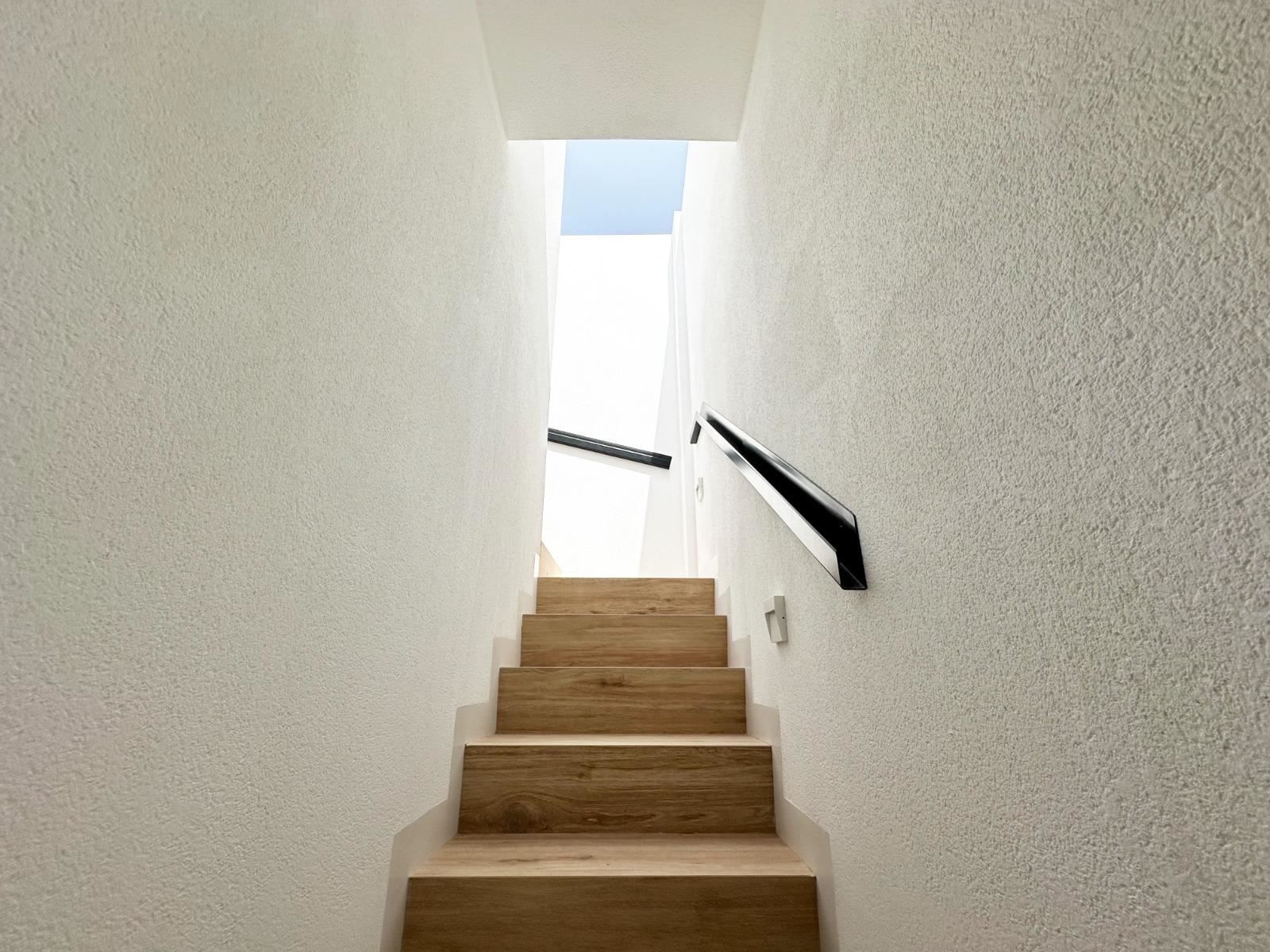 Utomhus väntar en privat pool på fem meter, en inbjudande trädgård med konstgräs, palmträd och ett smart bevattningssystem som gör underhållet enkelt. Här finns också en utedusch för varma sommardagar och ett solarium där du kan njuta av solen från morgon till kväll. Tomten är omsluten av en mur och metallstaket för extra integritet, och motoriserade persienner ger både komfort och säkerhet.